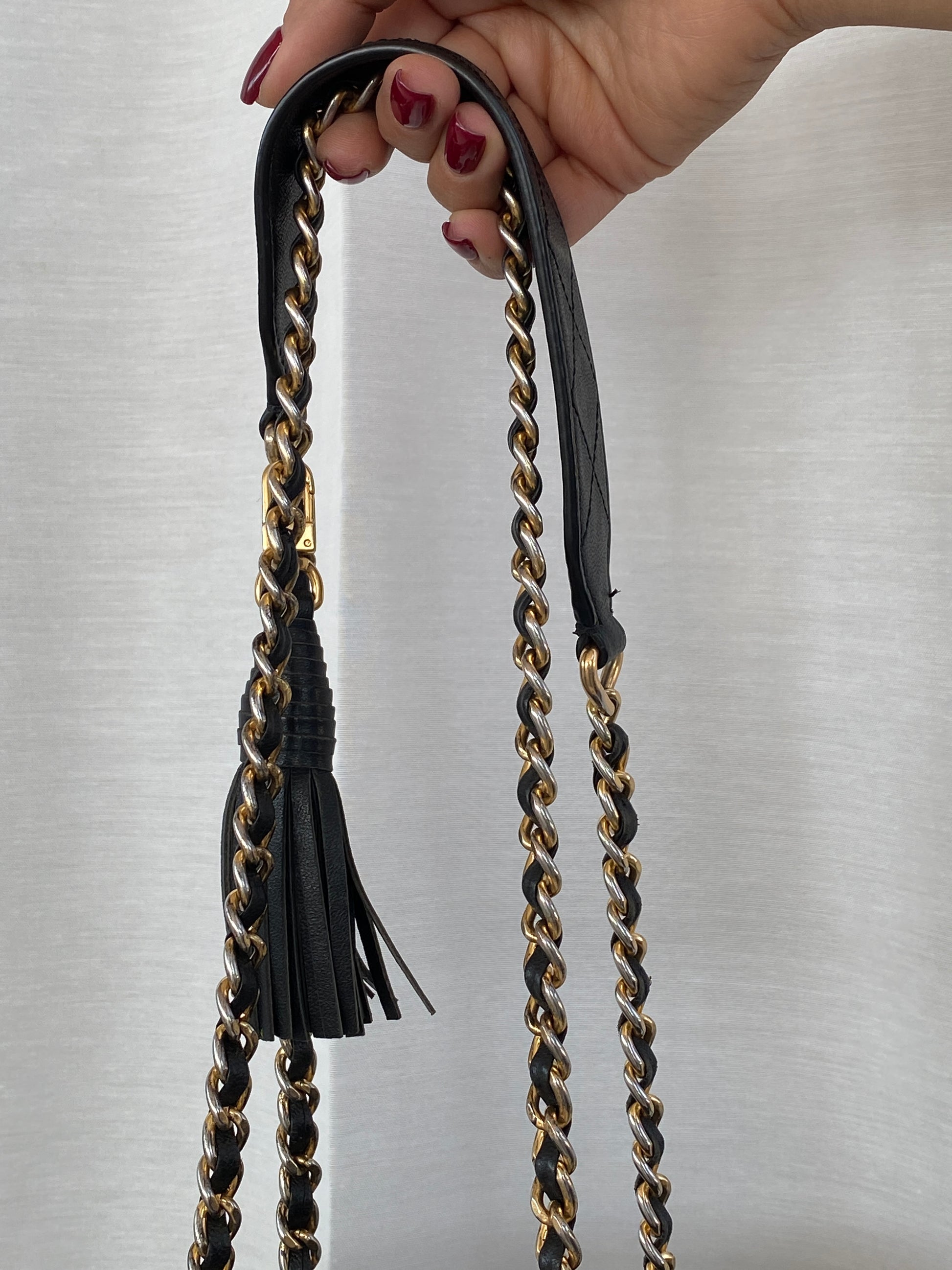 حقيبة كتف ميني فليمنج هذه من دار توري بيرش، مصممة من جلد أسود، ومزينة بلمسات ذهبية. تتميز بإغلاق علوي برباط، وحزام كتف من سلسلة وجلد، وقاعدة متينة. تفتح الحقيبة لتجد بطانة داخلية من القماش تتسع لجميع أغراضك اليومية بسهولة. هذه الحقيبة الفريدة مثالية للنزهات النسائية.