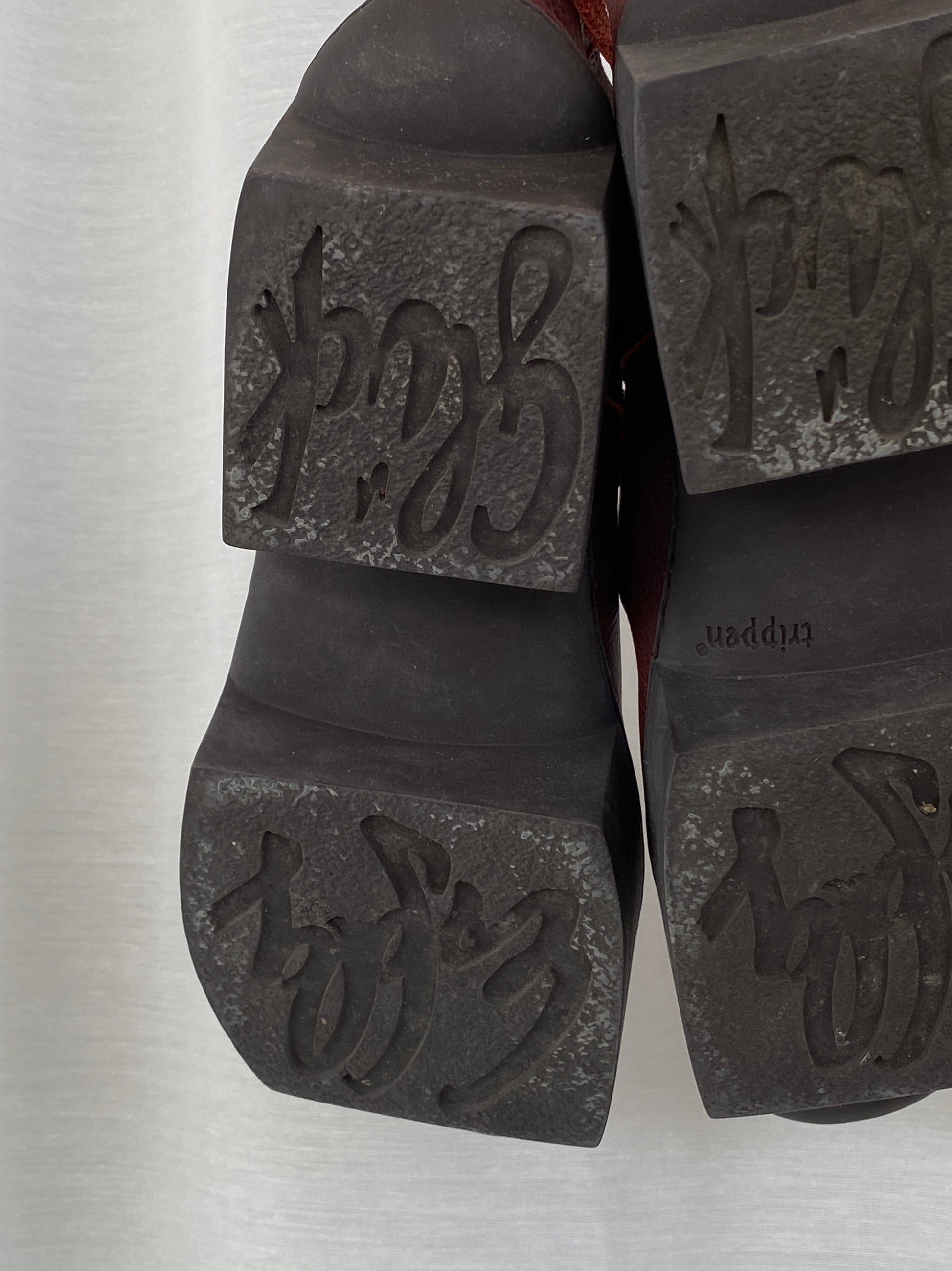 صنادل تريبن المصنوعة يدويًا بنعل سميك تُجسّد تصميم العلامة التجارية الطليعي والتزامها بالحرفية. صُنعت في ألمانيا من جلد عنابي عالي الجودة، وتتميز بأحزمة جريئة ومفتوحة من الأمام، ونعل مطاطي منحوت مميز من تريبن.