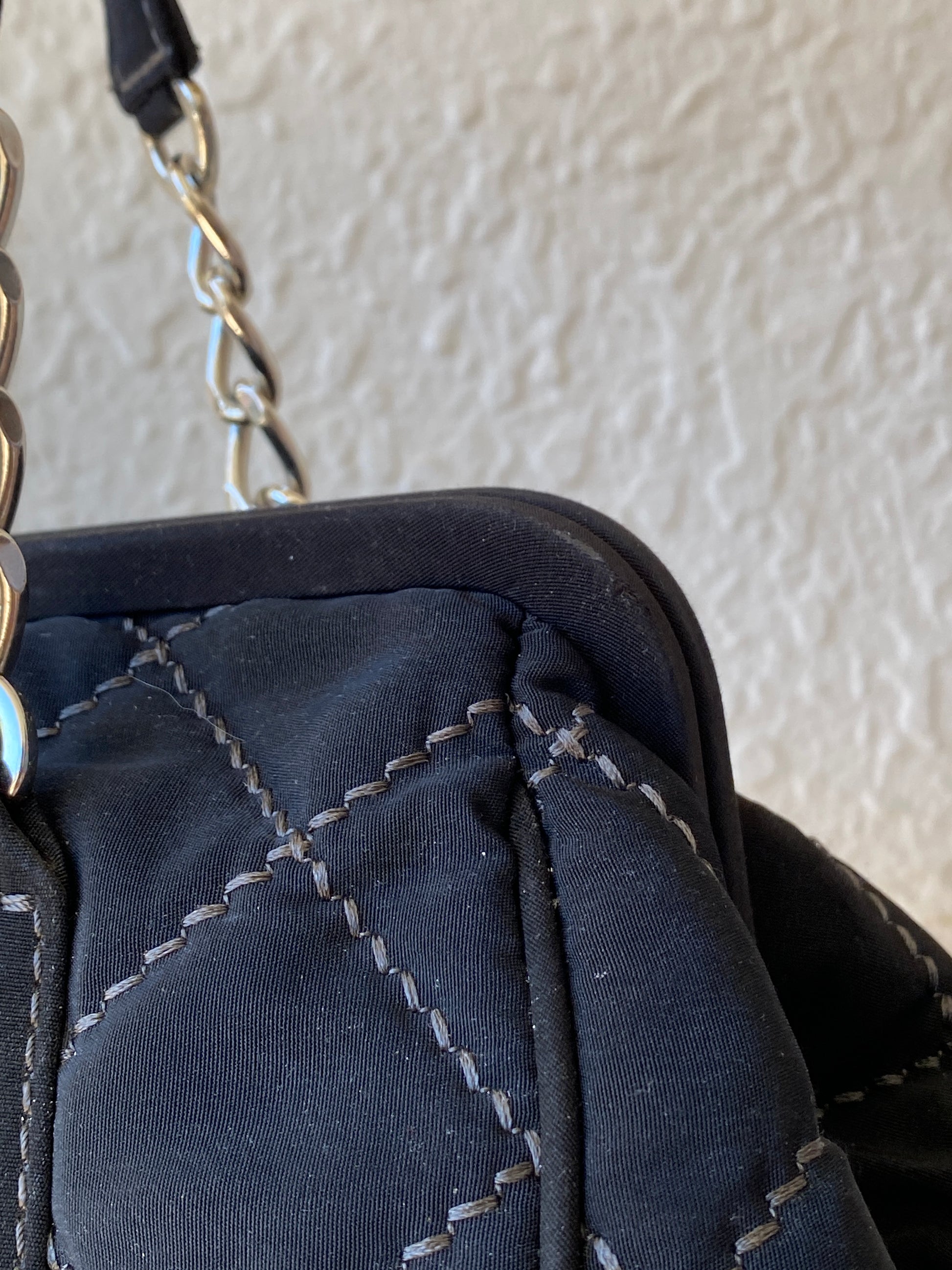 حقيبة يد من الألياف الدقيقة مبطنة باللون الأسود من فيرا برادلي، مقبض سلسلة فضية، إطار، قفل كروي