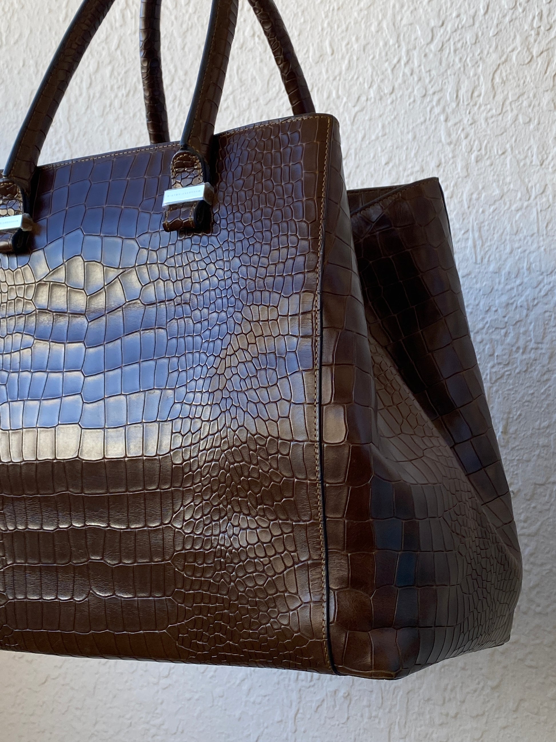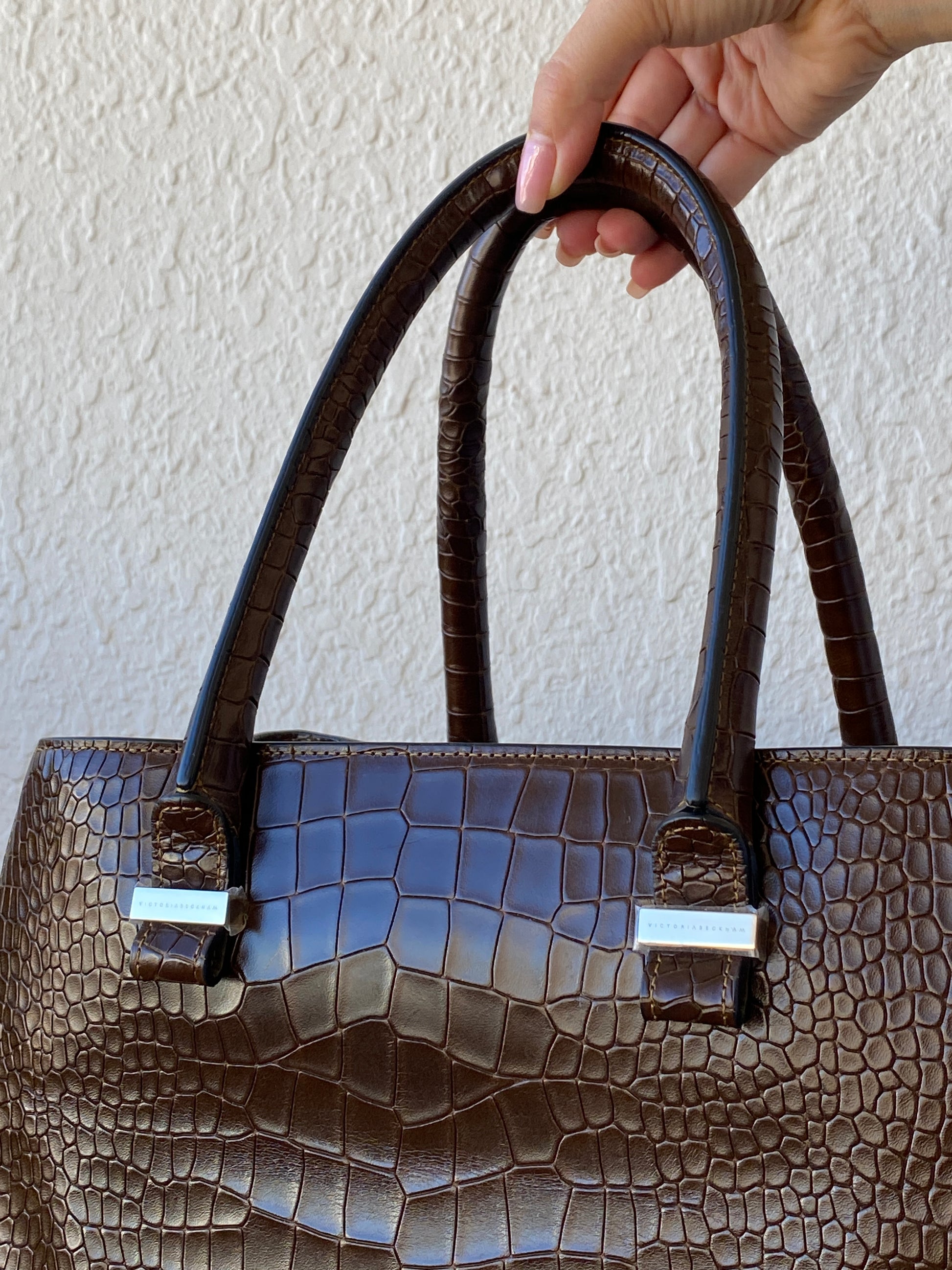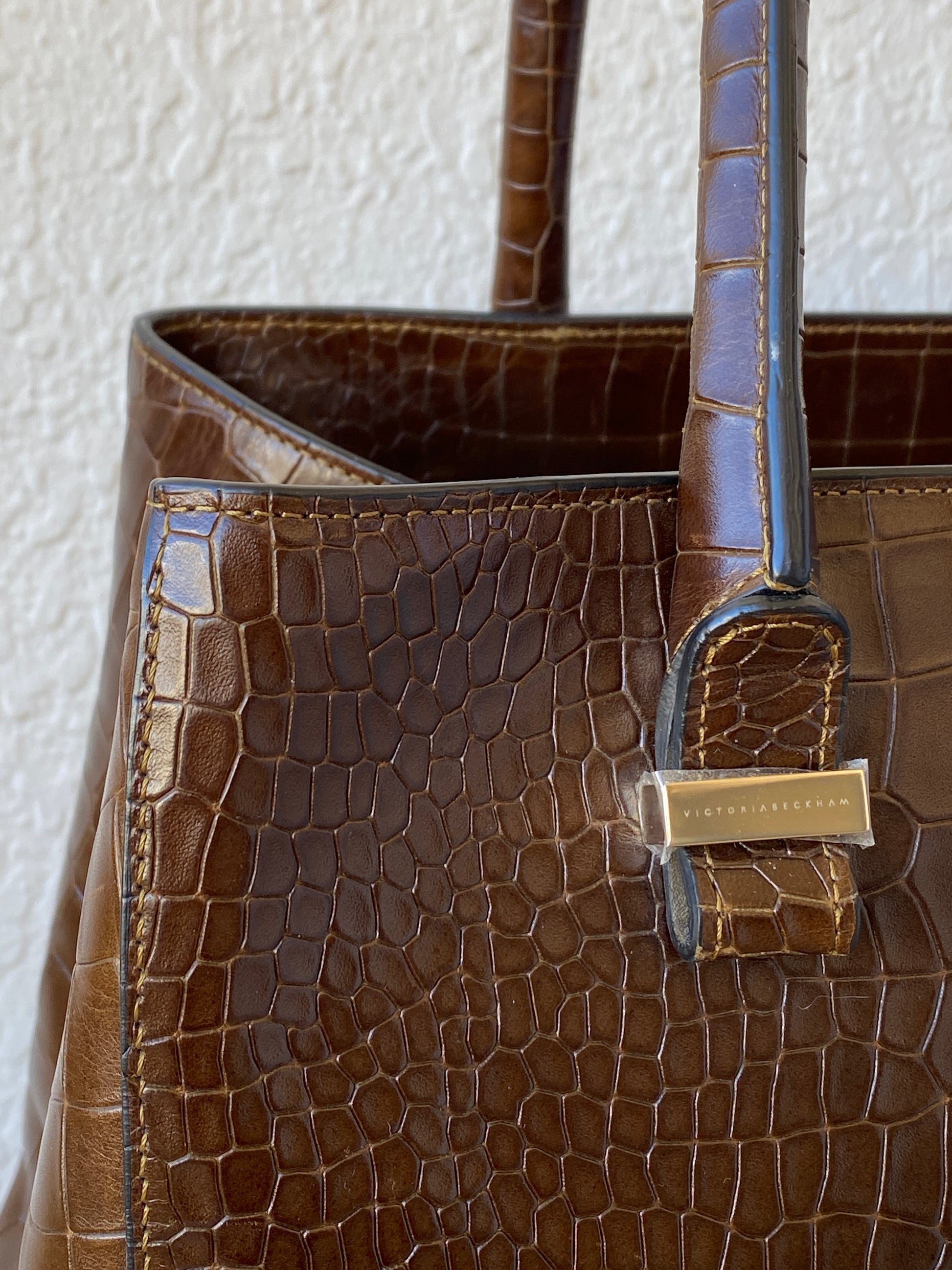 حقيبة فيكتوريا بيكهام كبيرة من الجلد باللون البني الشوكولاتي للنساء بتأثير جلد التمساح