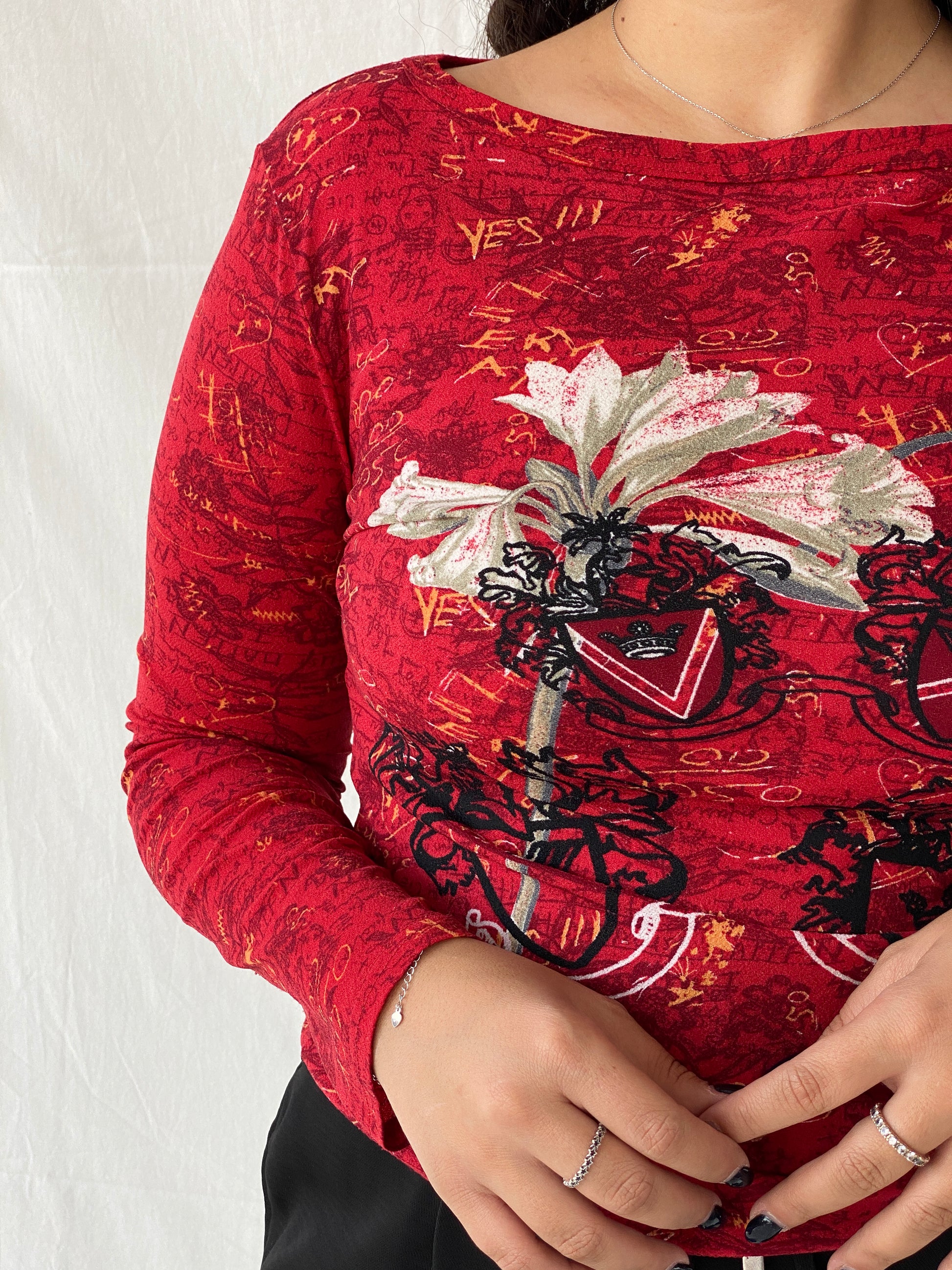 بلوزة نسائية بأكمام طويلة من Vintage 00s Street One باللون الأحمر برسومات شبكية - مقاس كبير