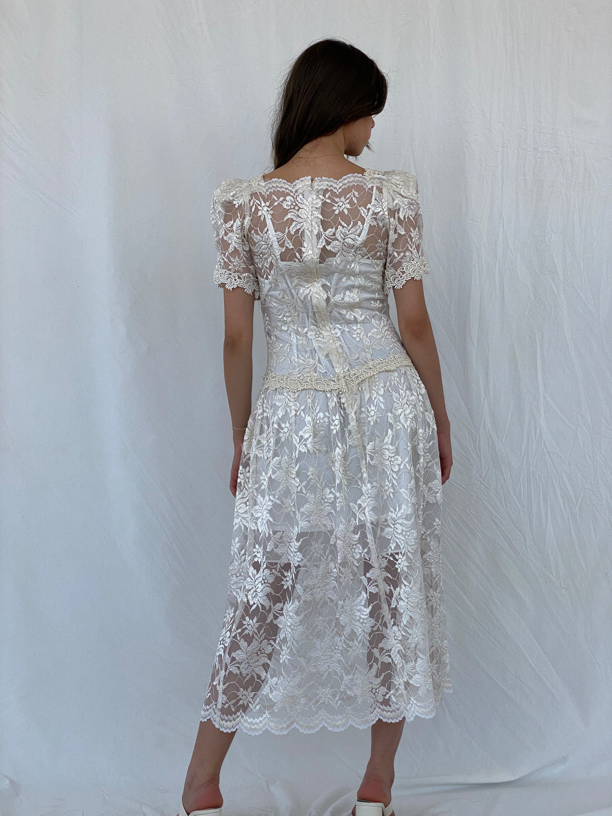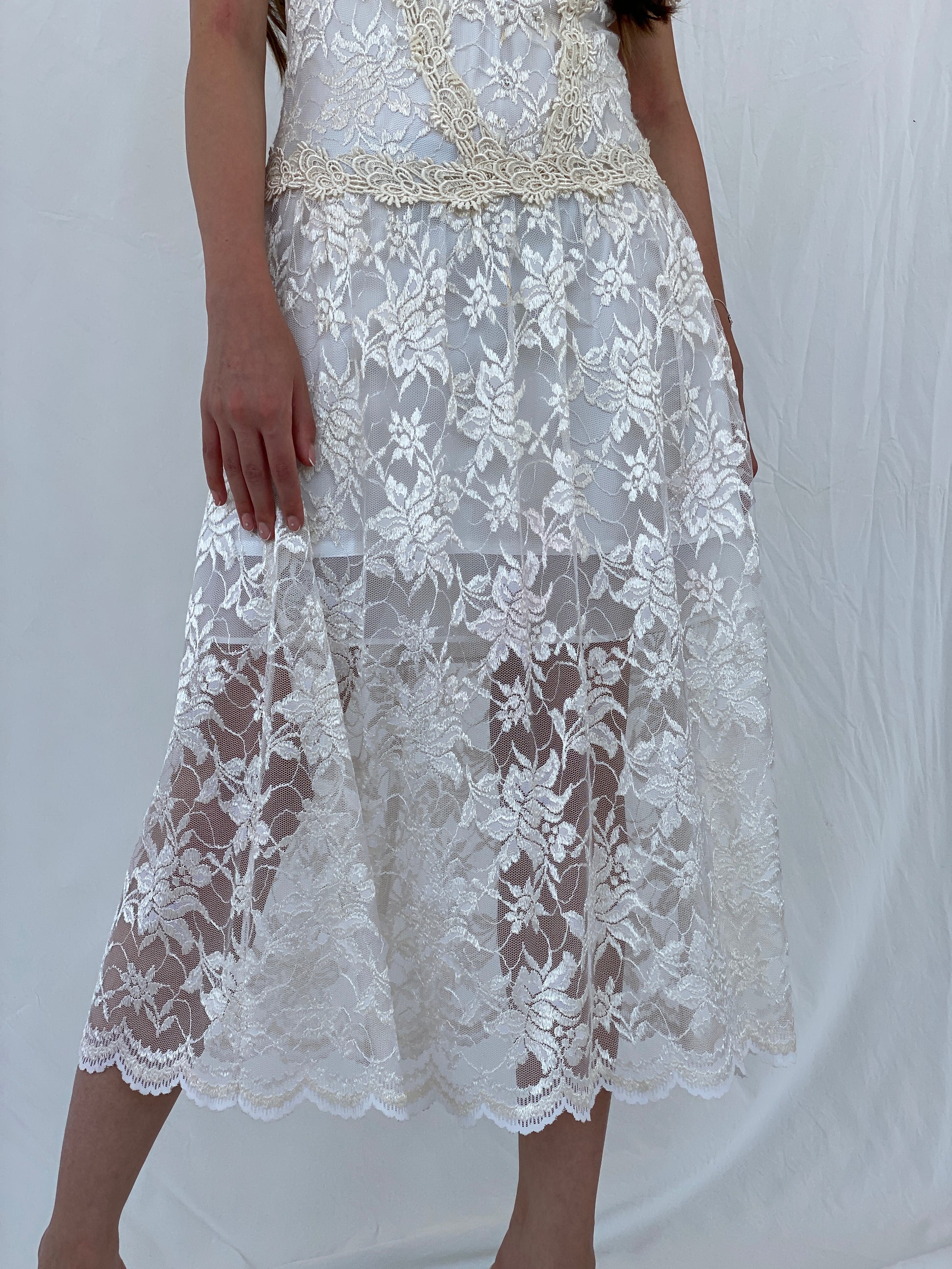 فستان متوسط الطول من الدانتيل بنقشة زهور من ثمانينيات القرن العشرين - مقاس صغير