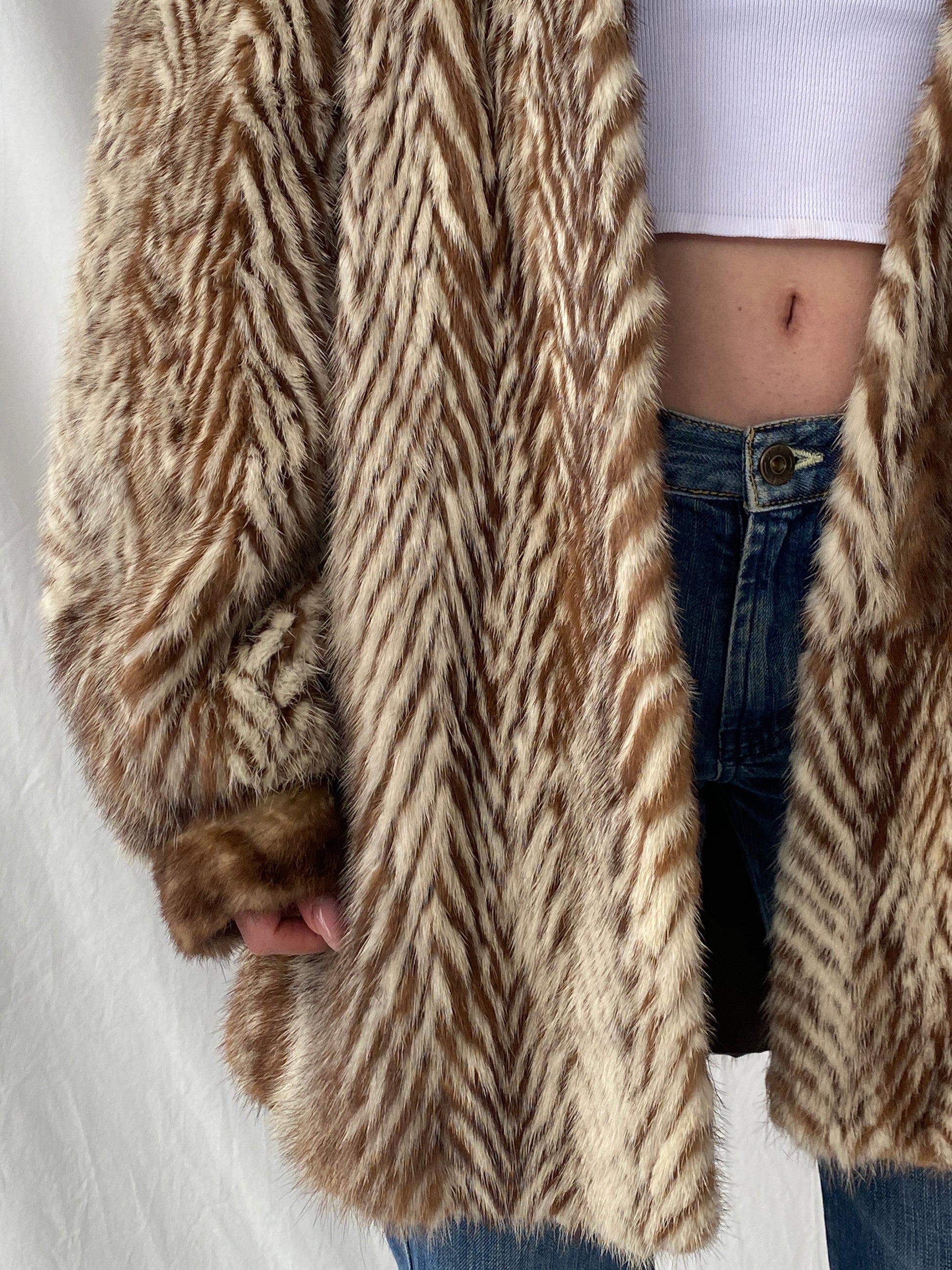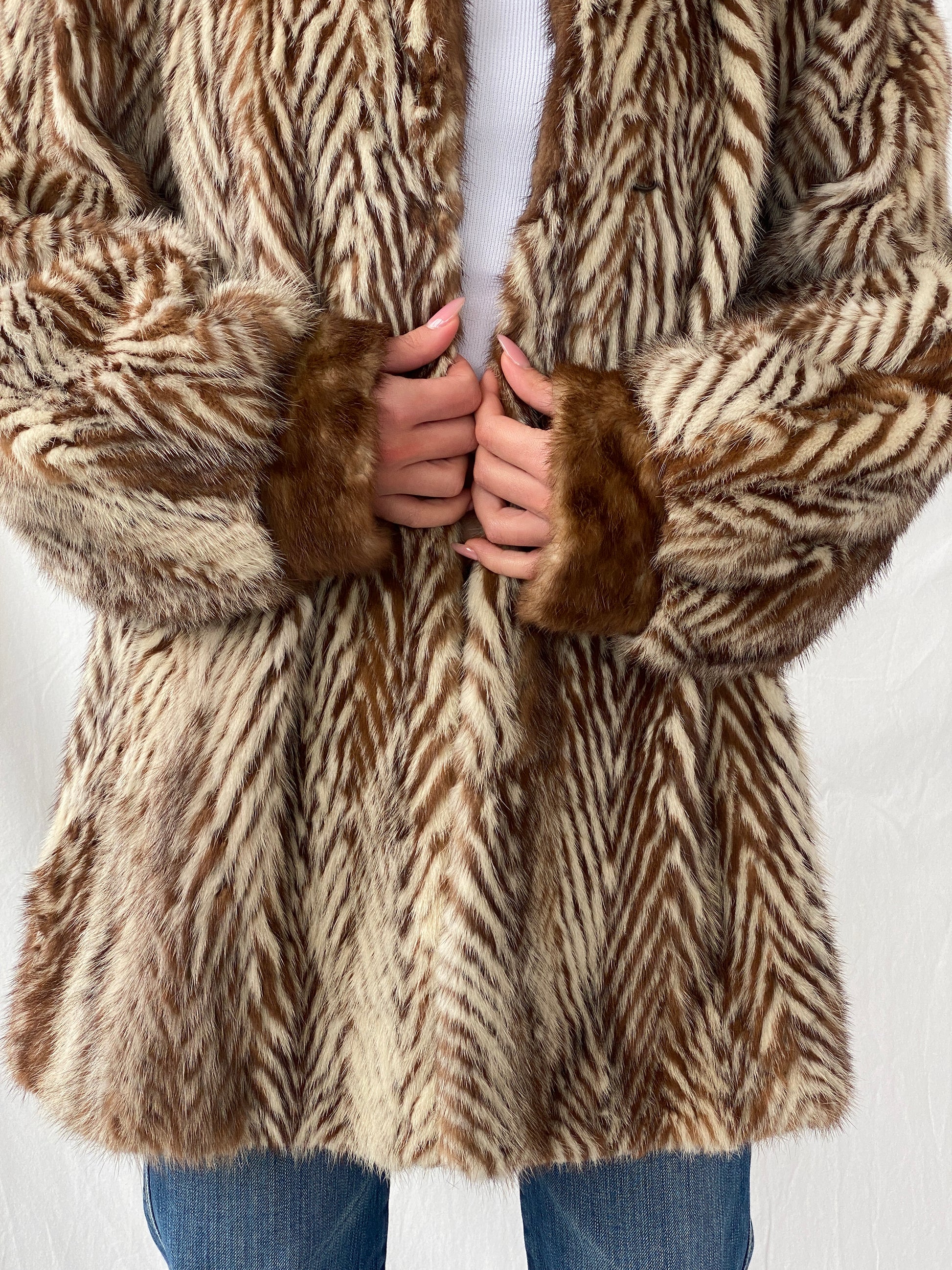 سترة فاخرة من فرو المنك البني الحقيقي من ثمانينيات القرن العشرين مع خطوط من الفرو المصبوغ وياقة بنية - مقاس متوسط