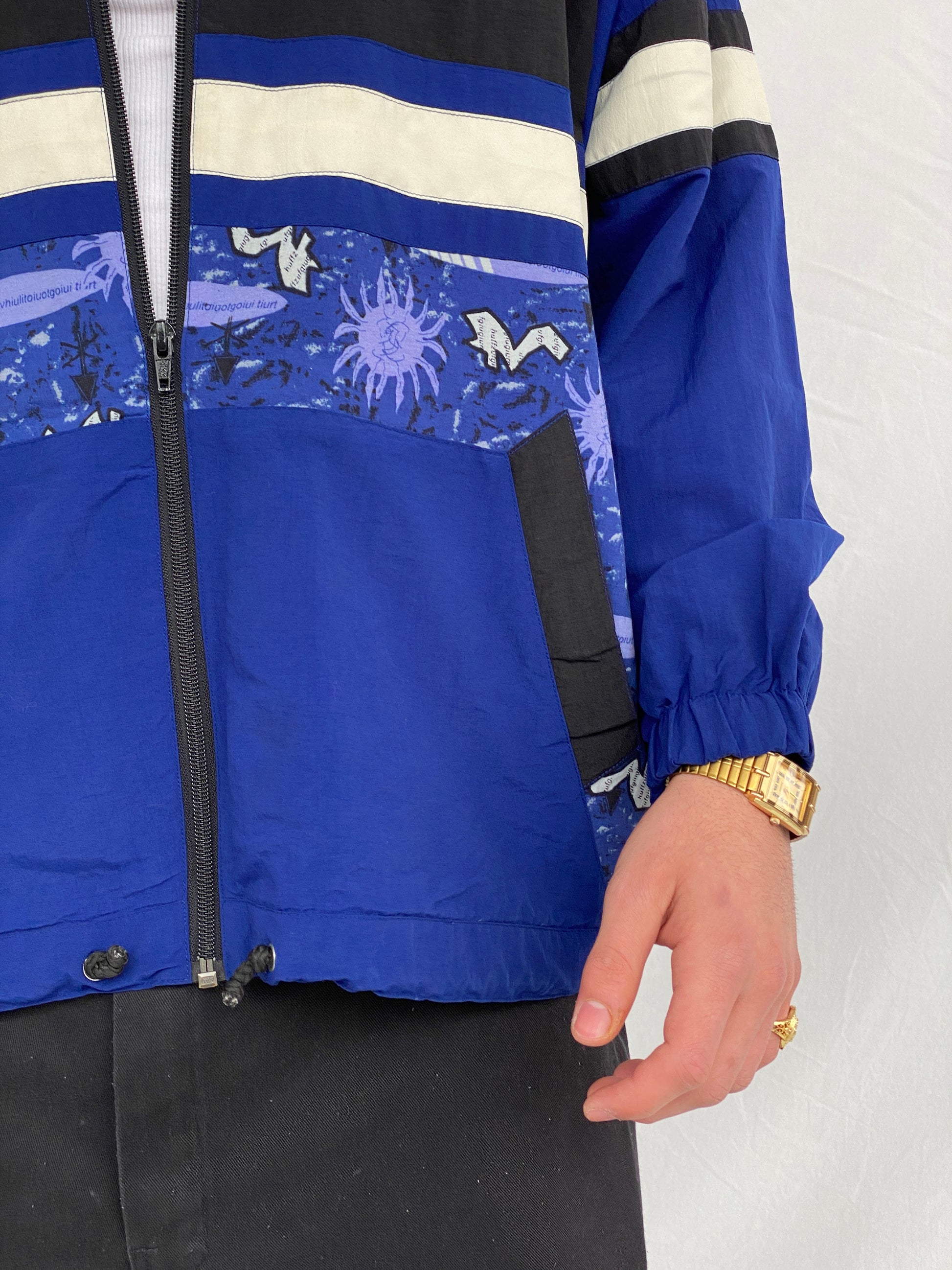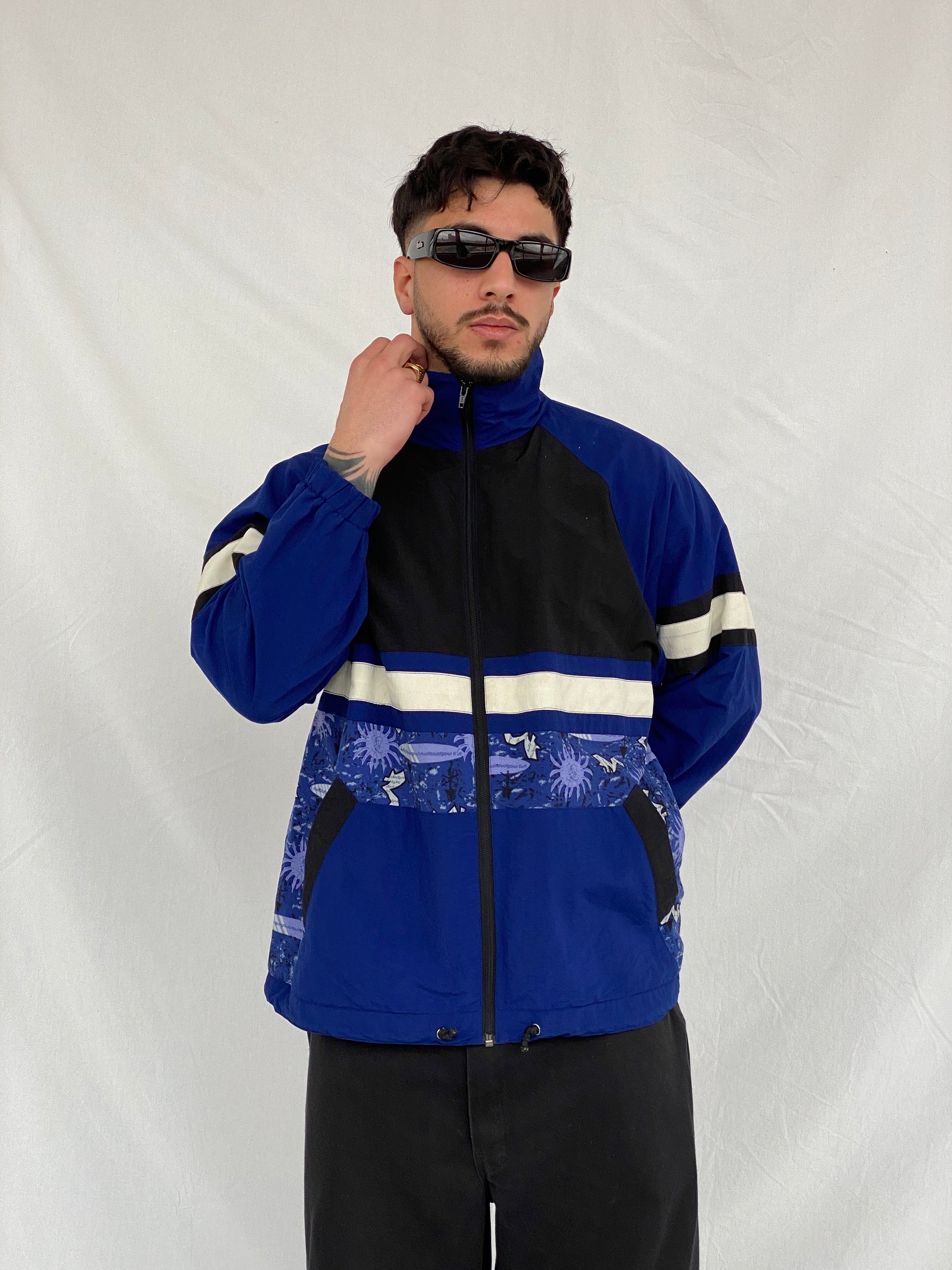 نقدم لكم جاكيت فورميكيولا الرياضي المقاوم للرياح، باللونين الأسود والكحلي، من حقبة الثمانينيات والتسعينيات. يتميز هذا الجاكيت بتفاصيل سوداء وزرقاء على خامات الجاكيت الرياضي.