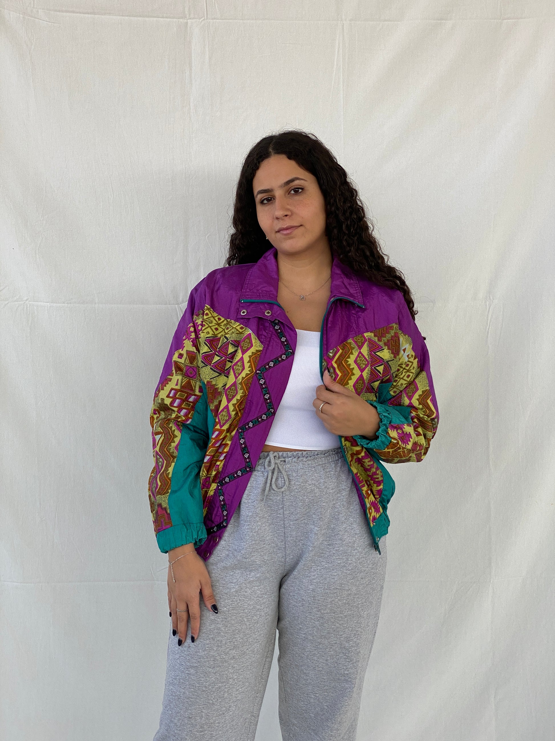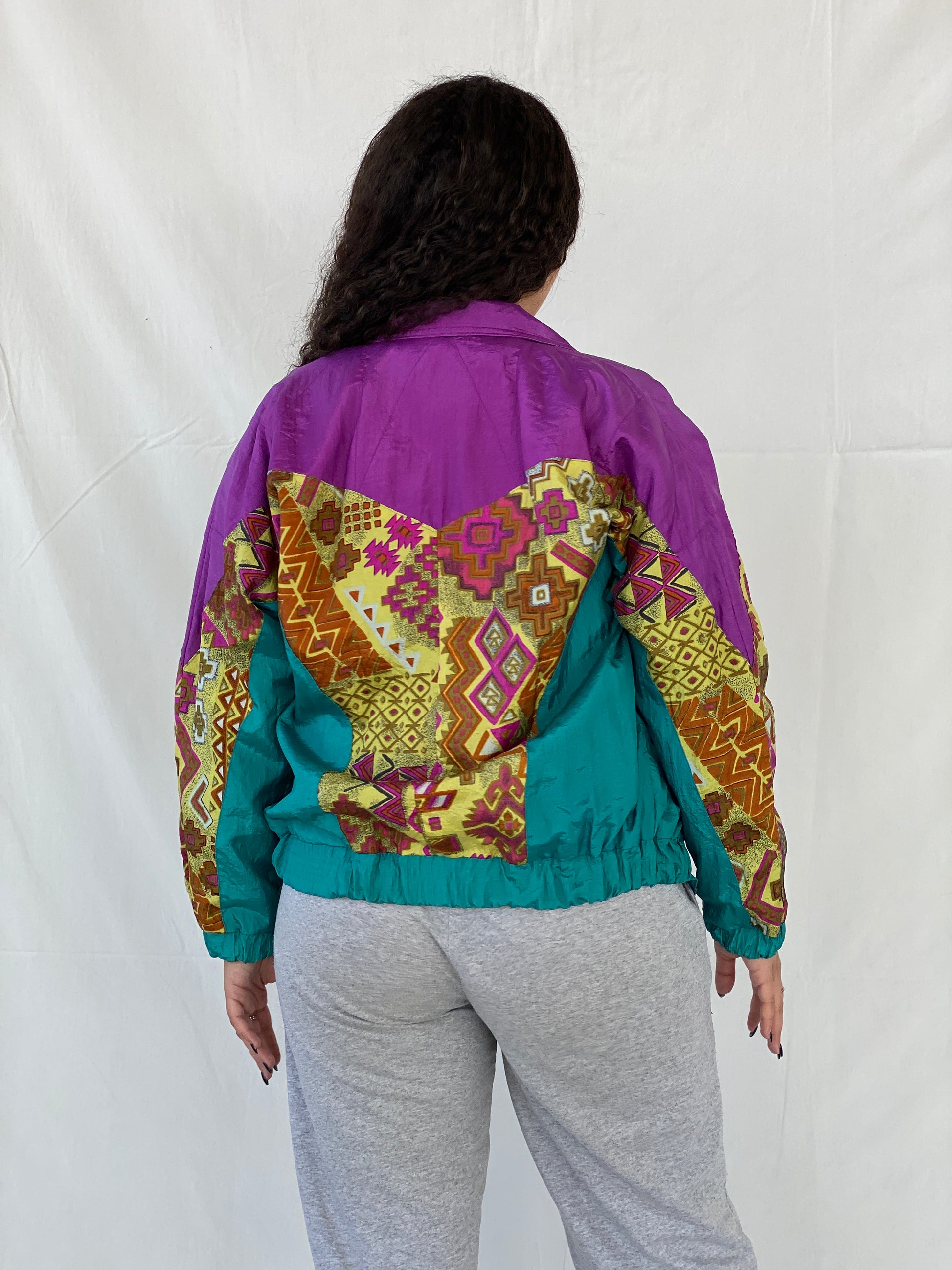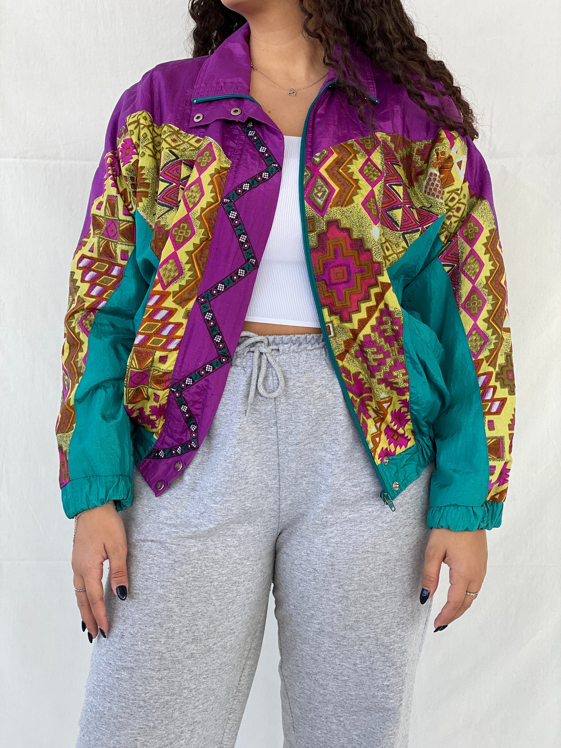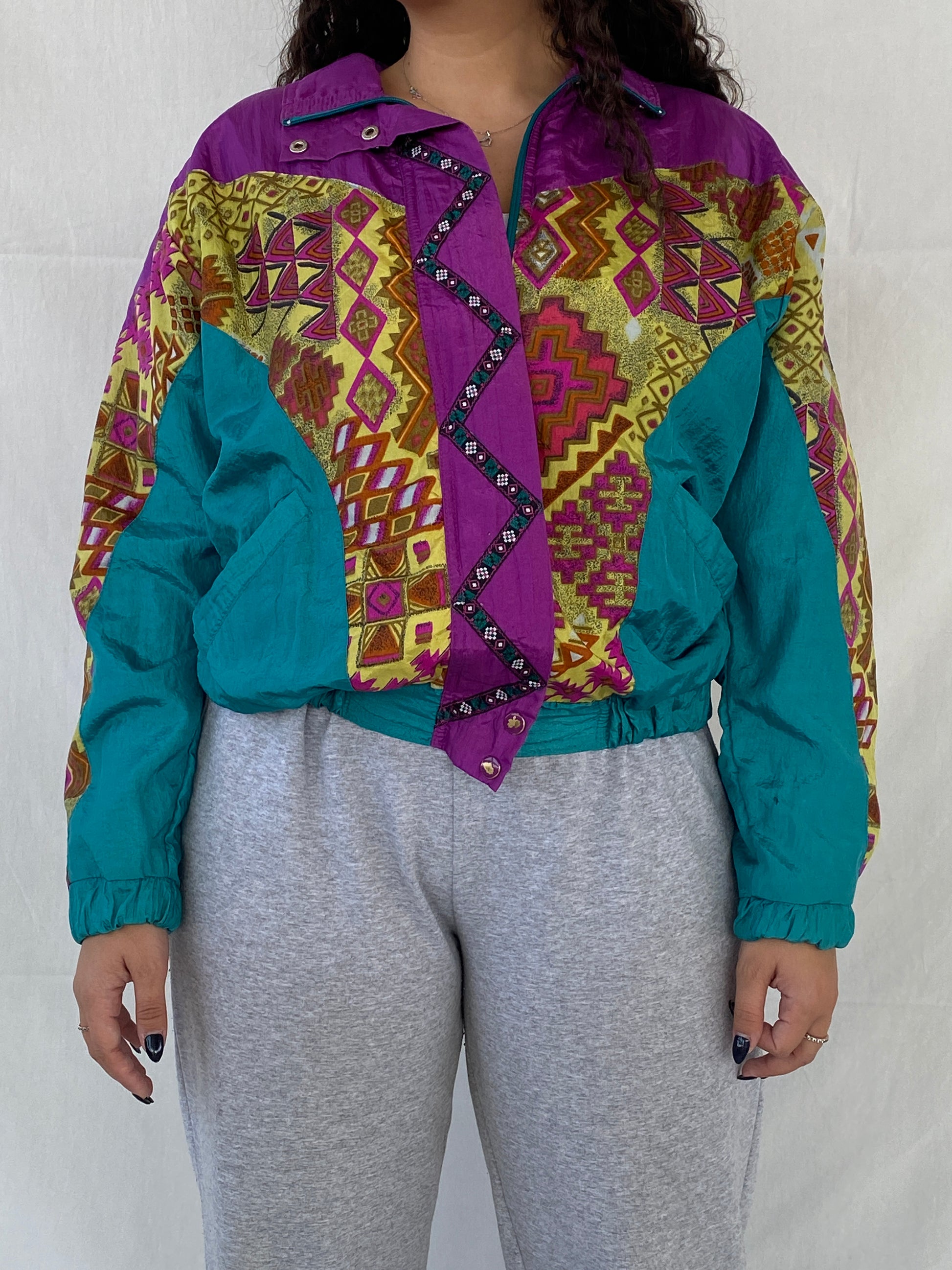 جاكيت رياضي بتصميم كلاسيكي من Lanvon من Cheerful Corp، بطبعة قبلية خضراء، من الثمانينيات والتسعينيات - مقاس صغير