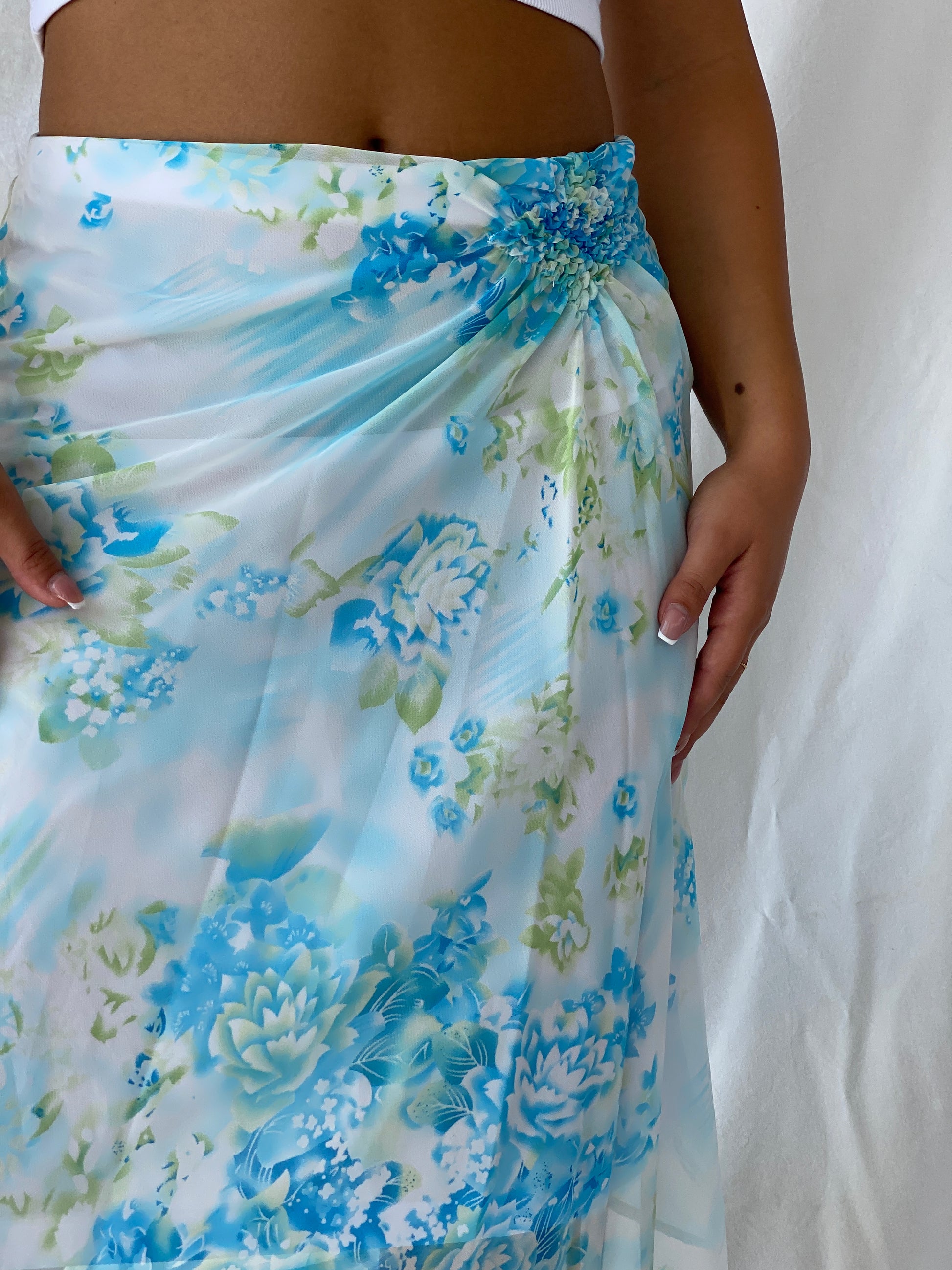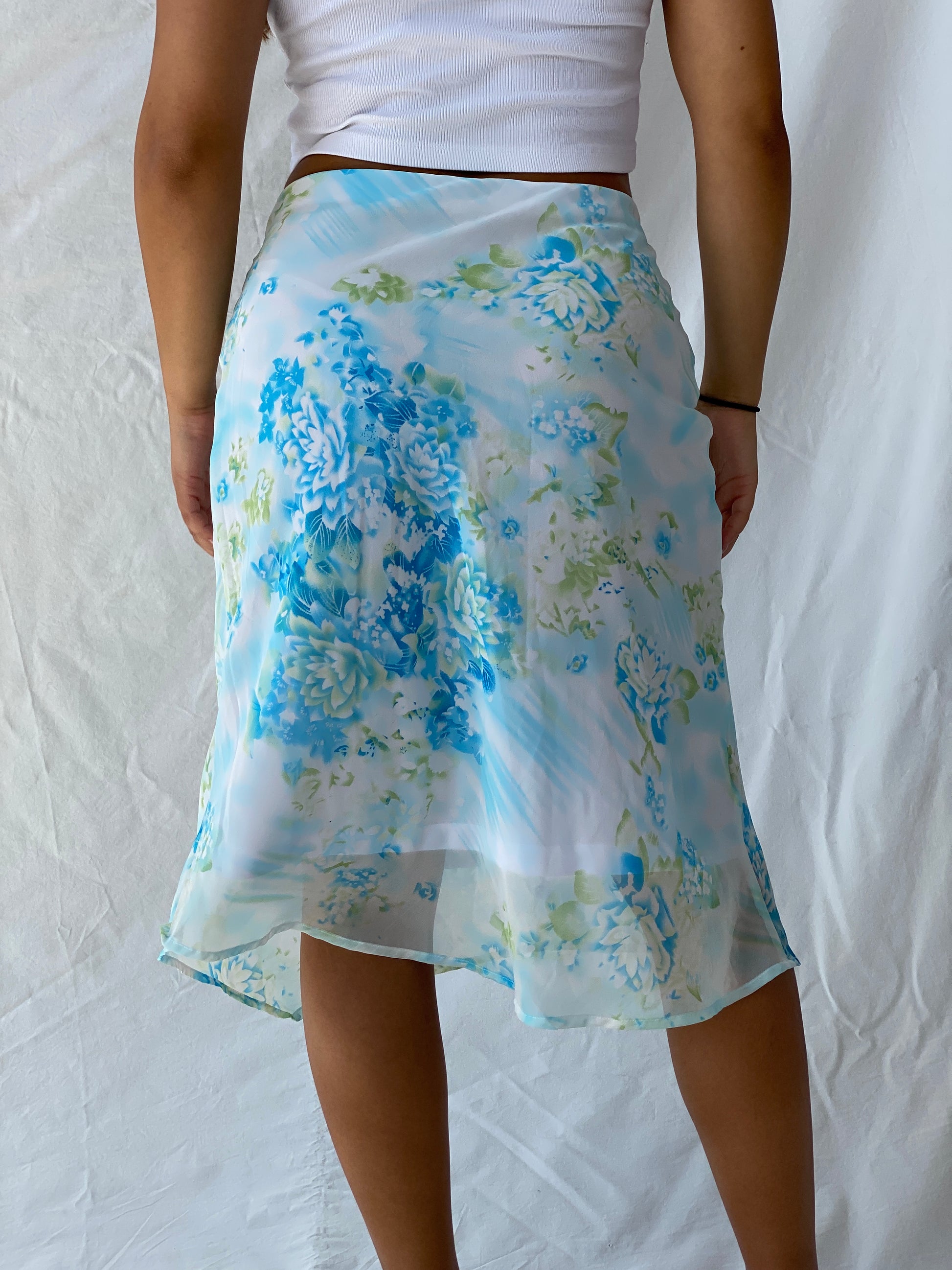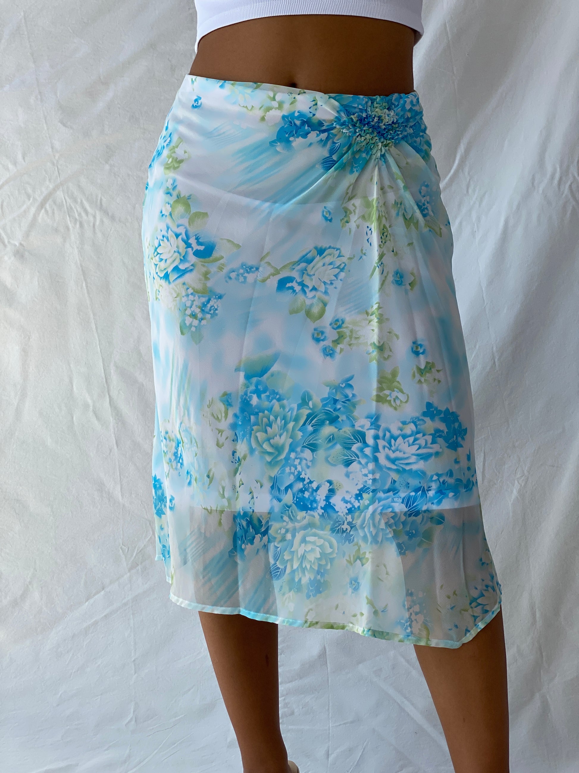 تنورة ميدي من الشيفون الشفاف المزهر باللون الأزرق المائي من التسعينيات - مقاس متوسط
