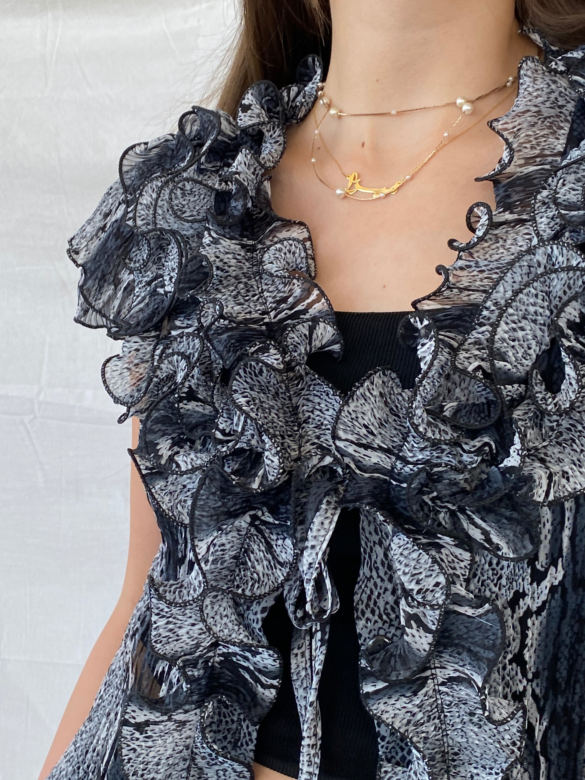 ارتقِ بخزانة ملابسك المهنية مع بلوزتنا الكلاسيكية المزينة بالكشكشة بطبعة جلد الحيوان. تضفي الأكمام القصيرة الرمادية المزينة بالكشكشة لمسة مرحة، بينما تضفي طبعة جلد الحيوان لمسة من الرقي. نسقيها مع بنطال أسود وحقيبة كتف لإطلالة مكتبية أنيقة وبسيطة.