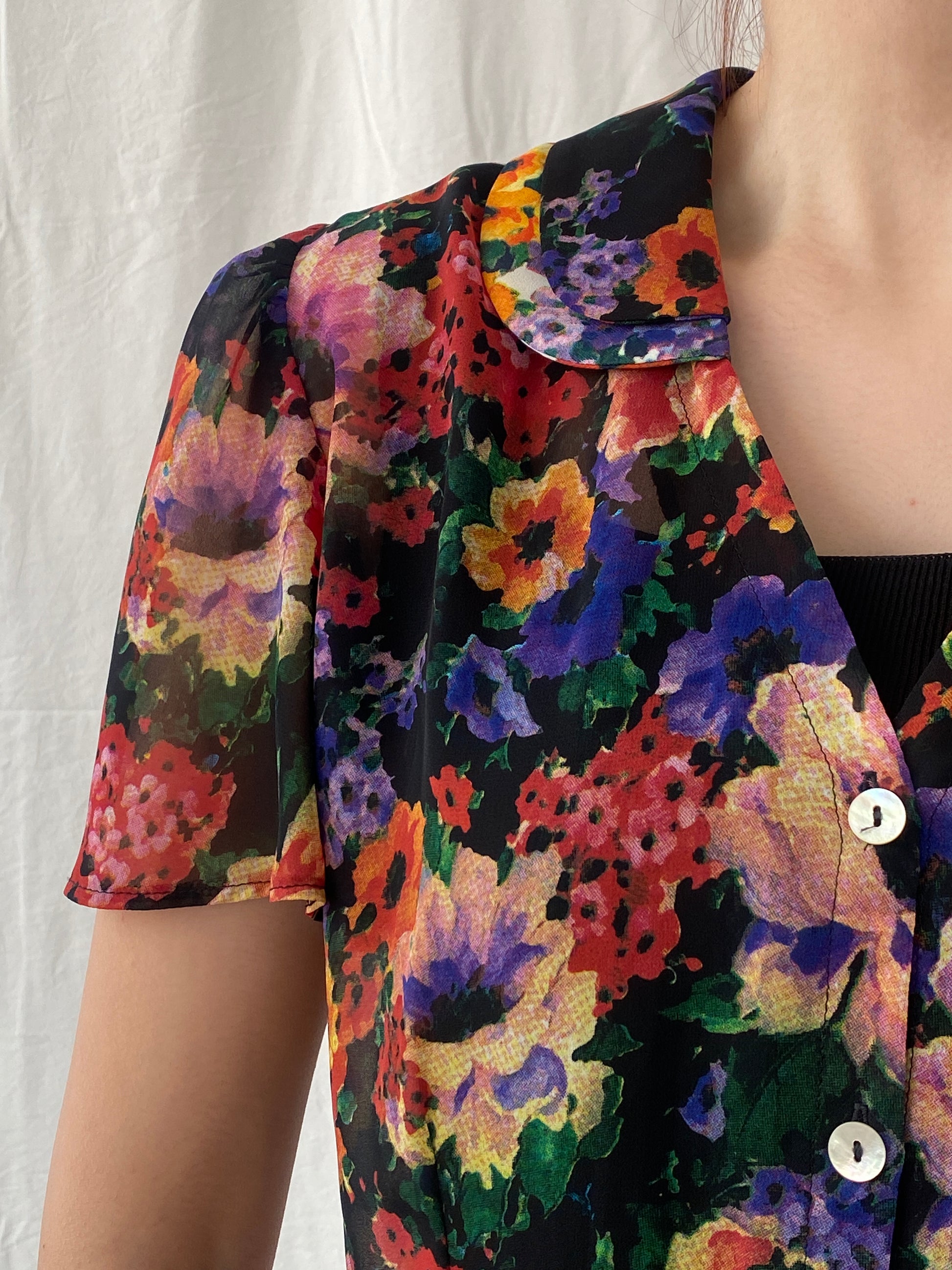 قميص نسائي شفاف مزهر من آن لويس، بأكمام قصيرة منفوخة، من التسعينيات - مقاس متوسط