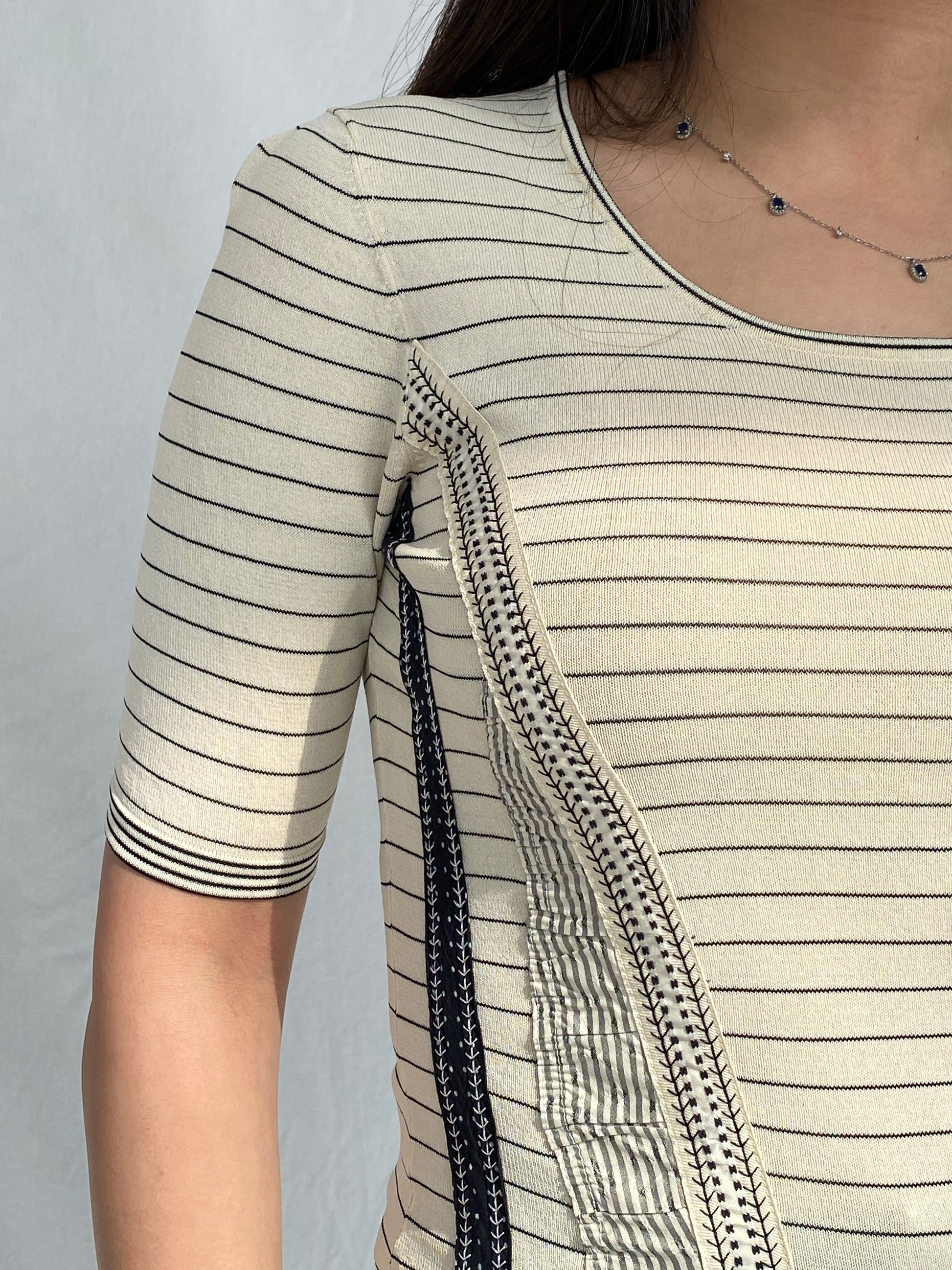 بلوزة نسائية مخططة باللون البيج العتيق مع ألواح مكشكشة وخياطة متباينة - مقاس صغير