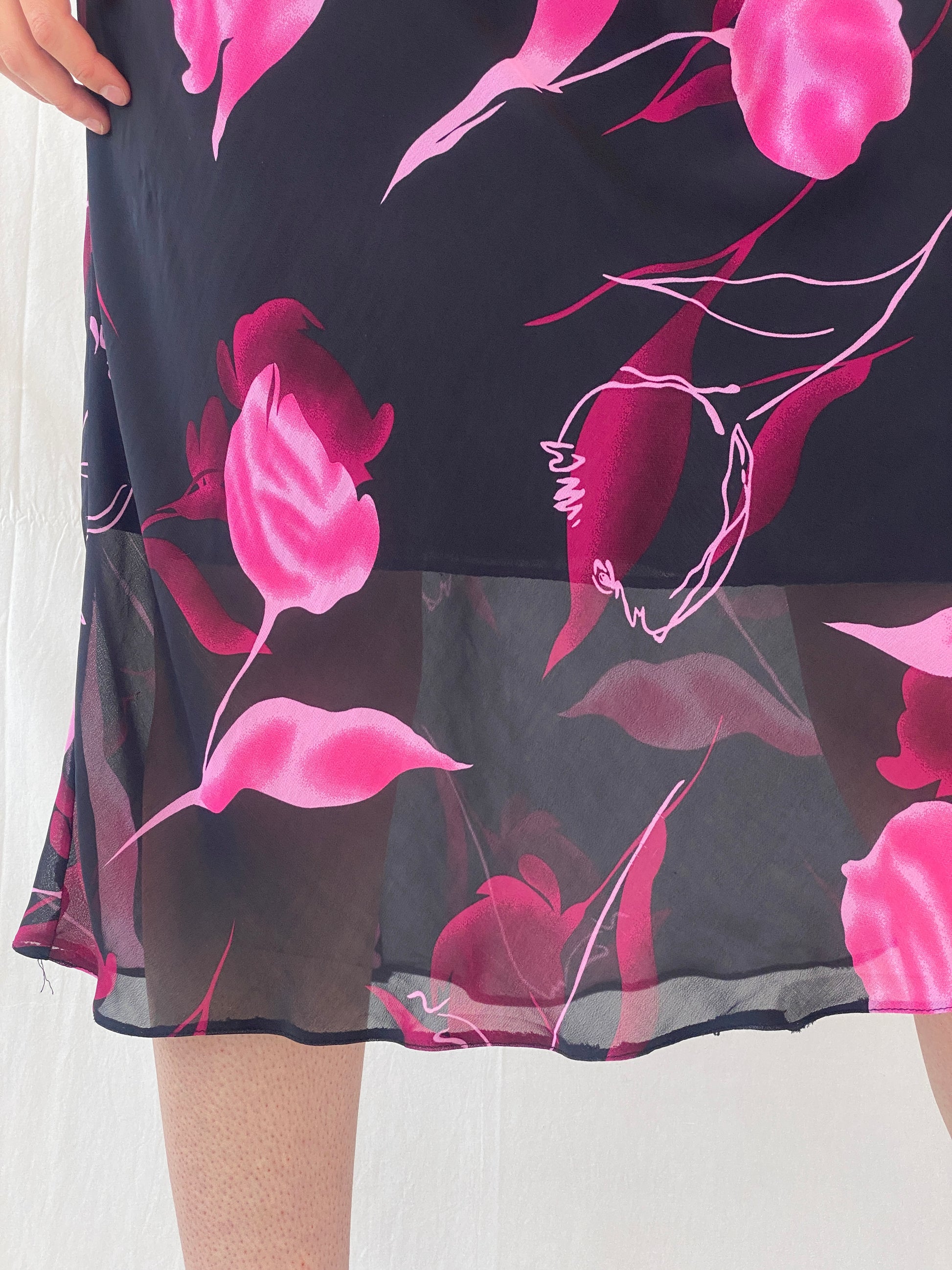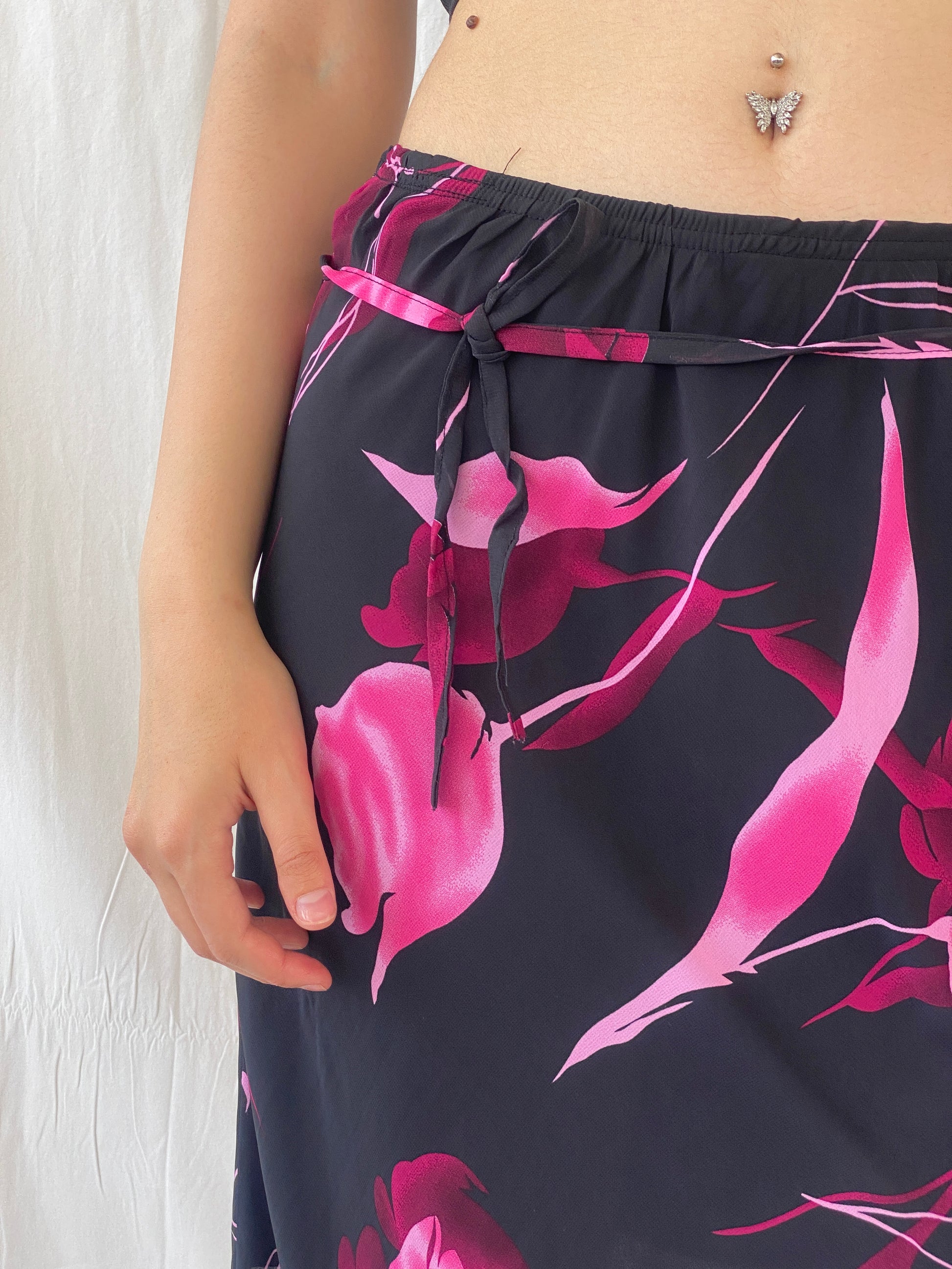 تنورة ميدي وردية بطبعة زهور سوداء من التسعينيات - مقاس كبير