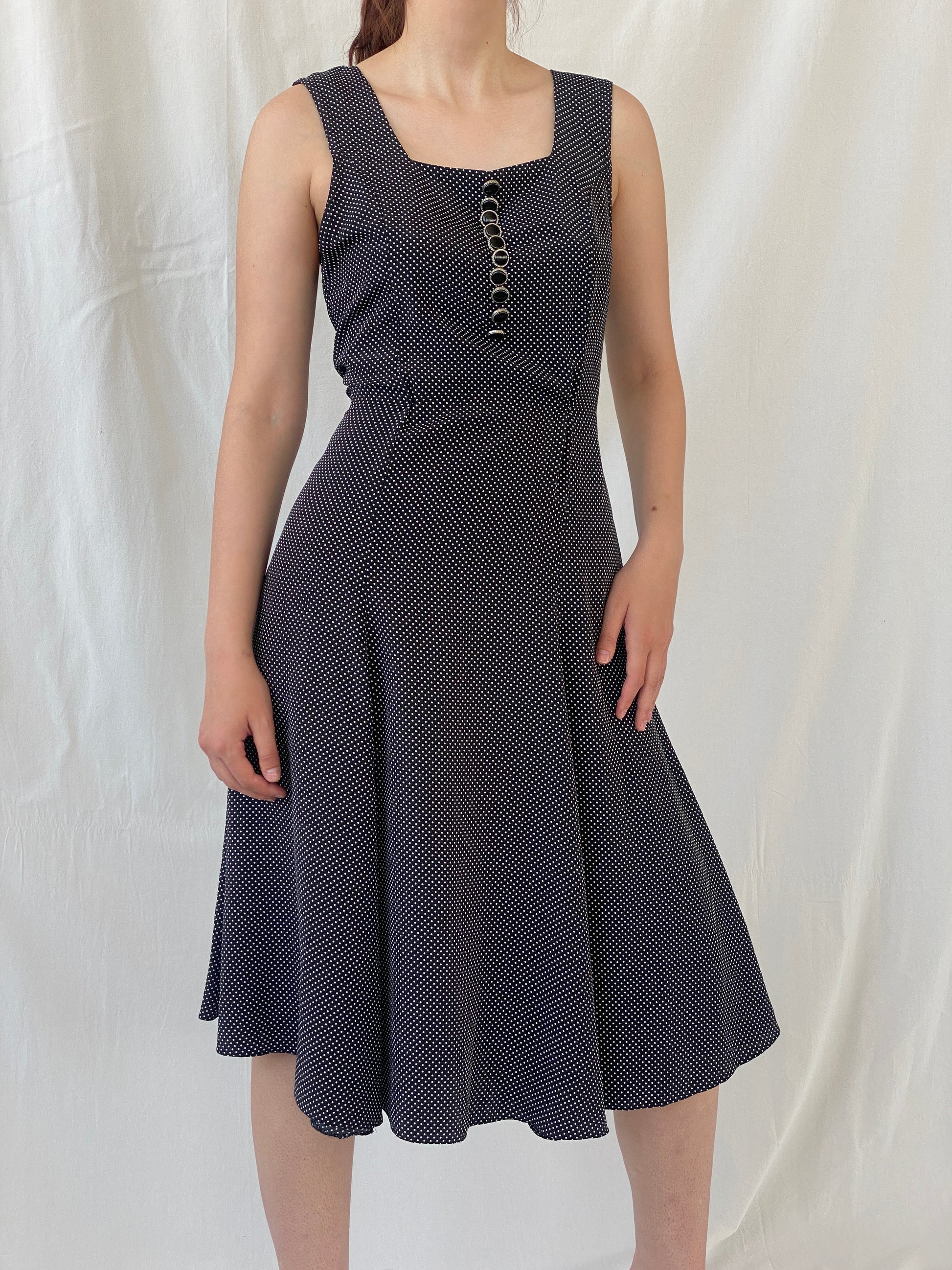 هذا الفستان الكلاسيكي المصنوع يدويًا والمُنقط بالأبيض والأسود يتميز بياقة مربعة كلاسيكية وأزرار أمامية أنيقة، بالإضافة إلى رباط خلفي لمزيد من الأناقة. مثالي لأي مناسبة، هذا الفستان المتوسط الطول بدون أكمام يُضفي لمسة أنيقة على أي خزانة ملابس.
