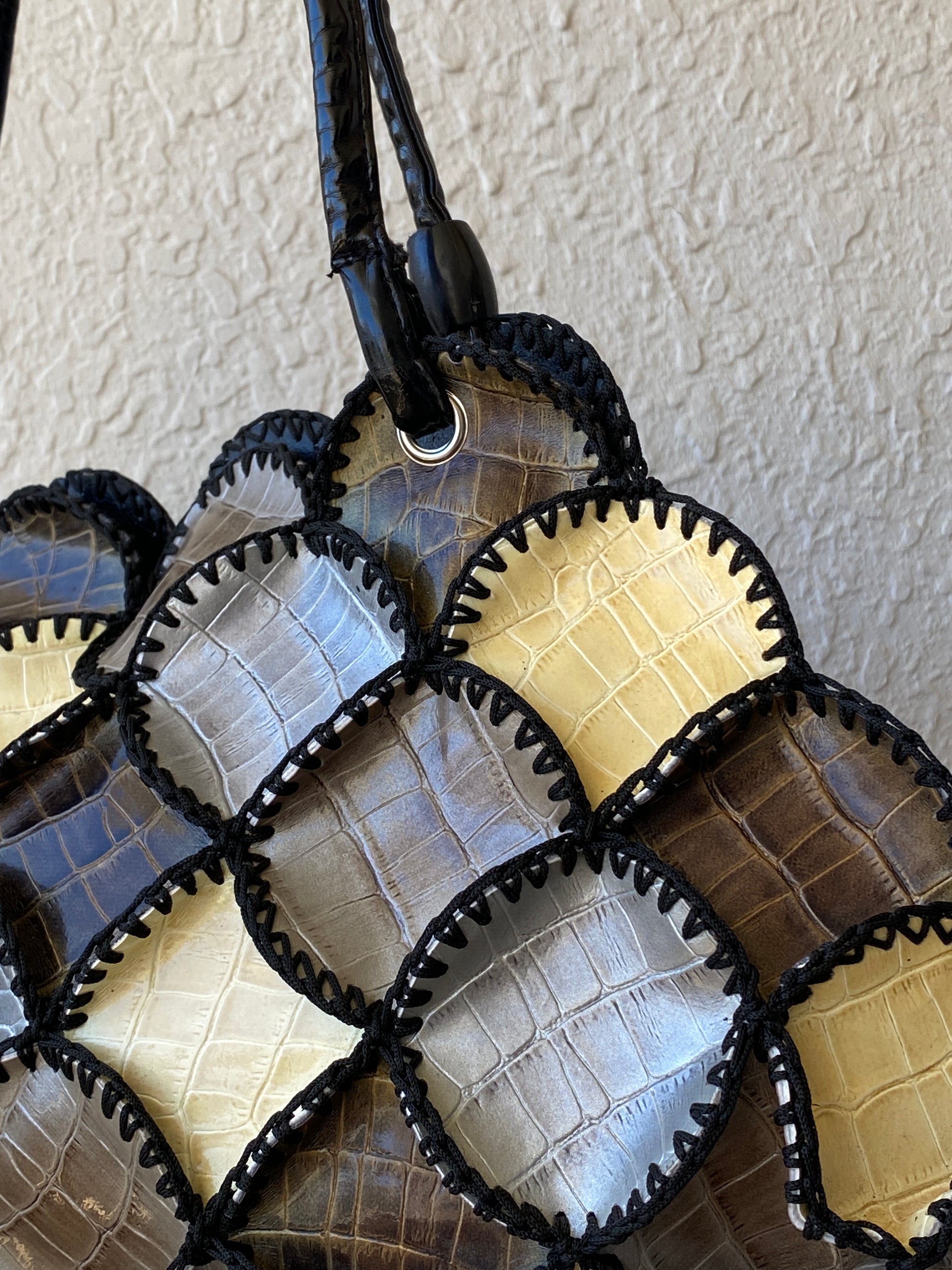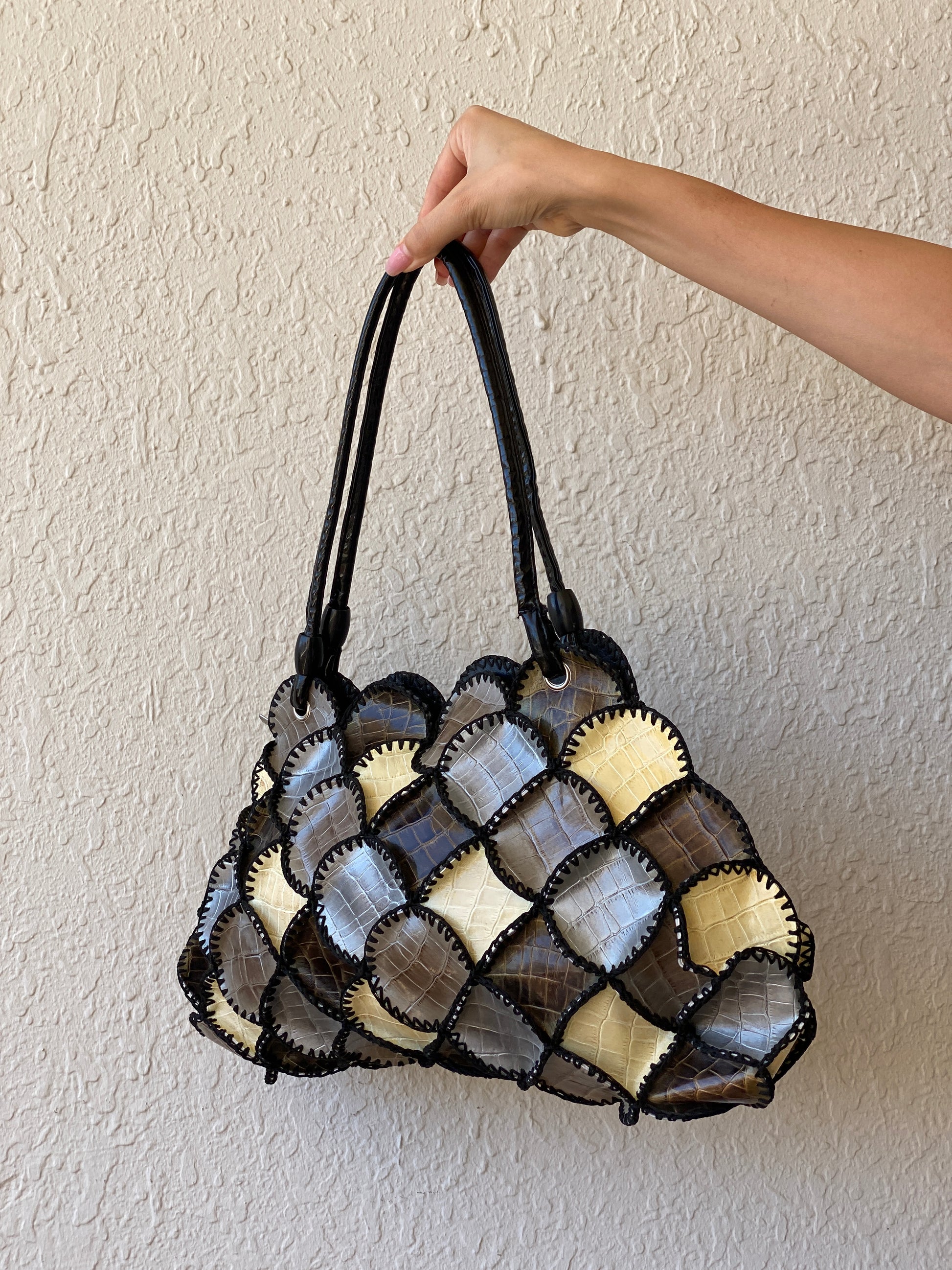 أضف لمسةً من الأناقة البوهيمية مع حقيبة كتفنا الكلاسيكية Y2K بوهو كروشيه من جلد الثعبان الصناعي. تتميز هذه الحقيبة بمزيج من رقع الثعبان المعدنية باللون البني والبيج والفضي، مما يجعلها مثالية لإطلالة فريدة وأنيقة.