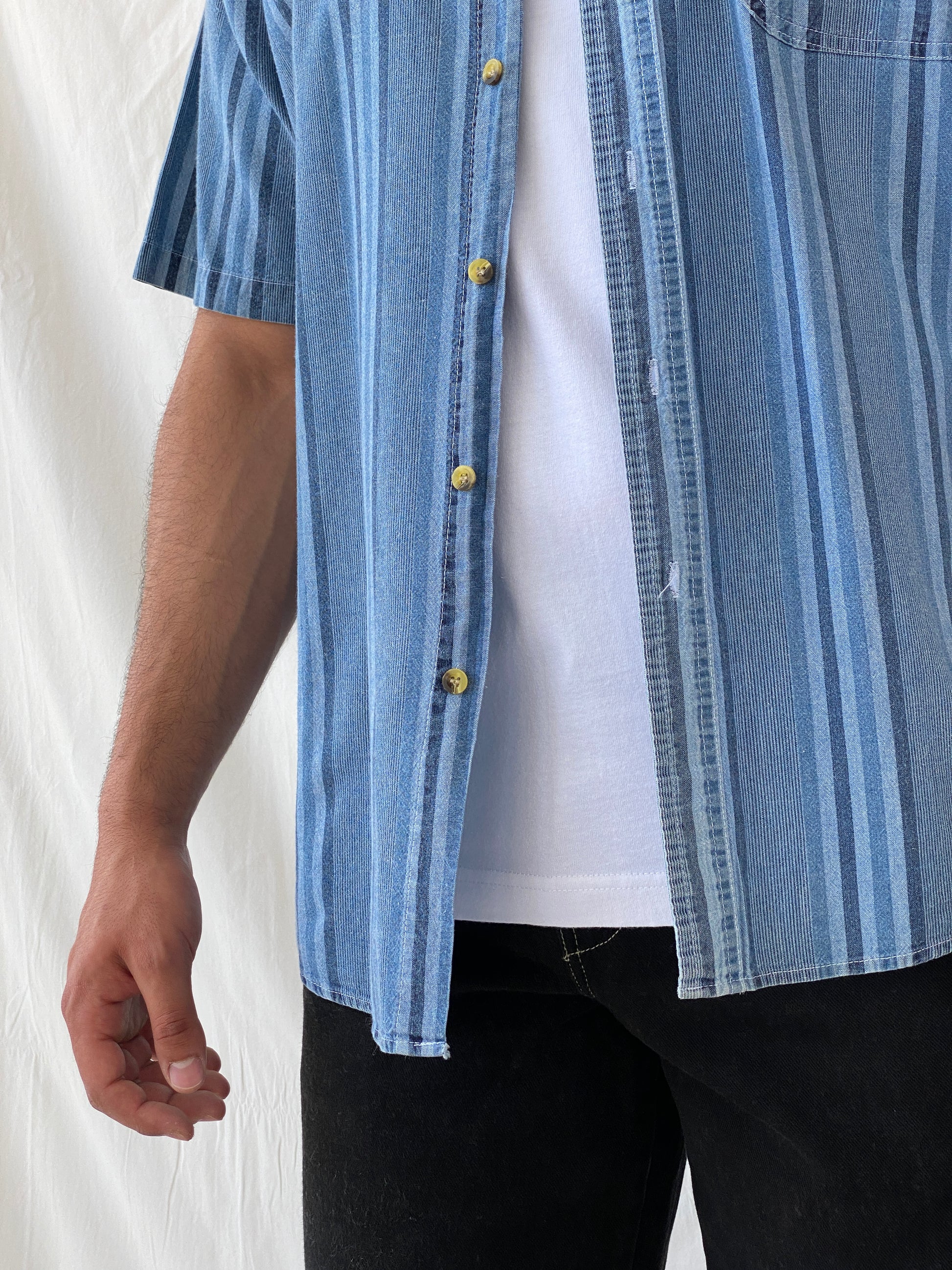 قميص رجالي من القطن بأكمام قصيرة مخطط باللون الأزرق وأزرار من التسعينيات - مقاس كبير