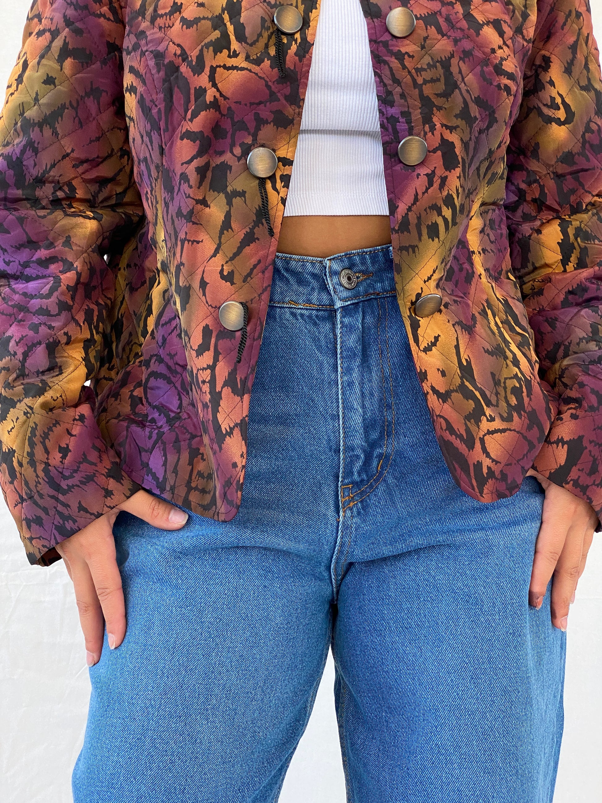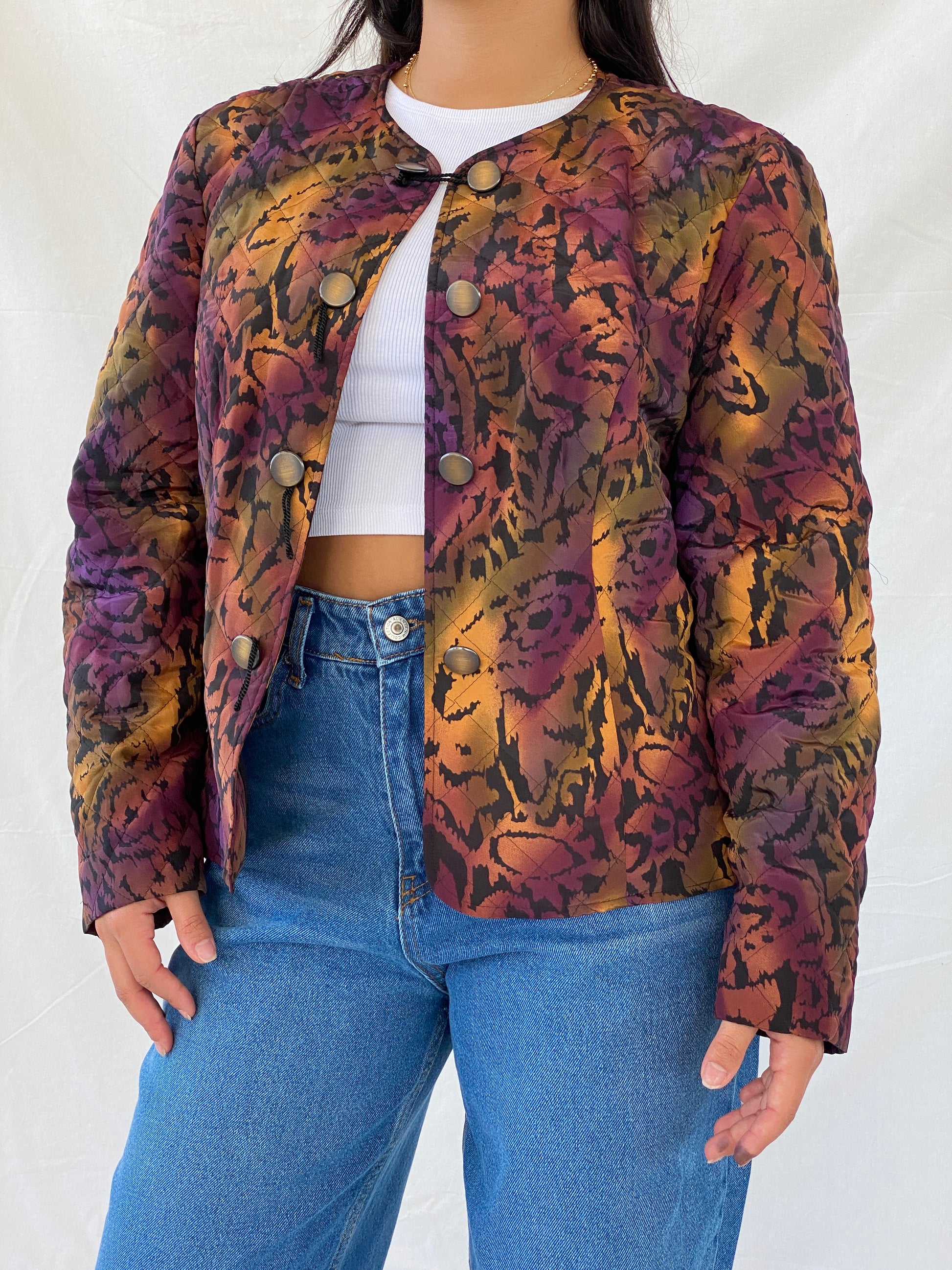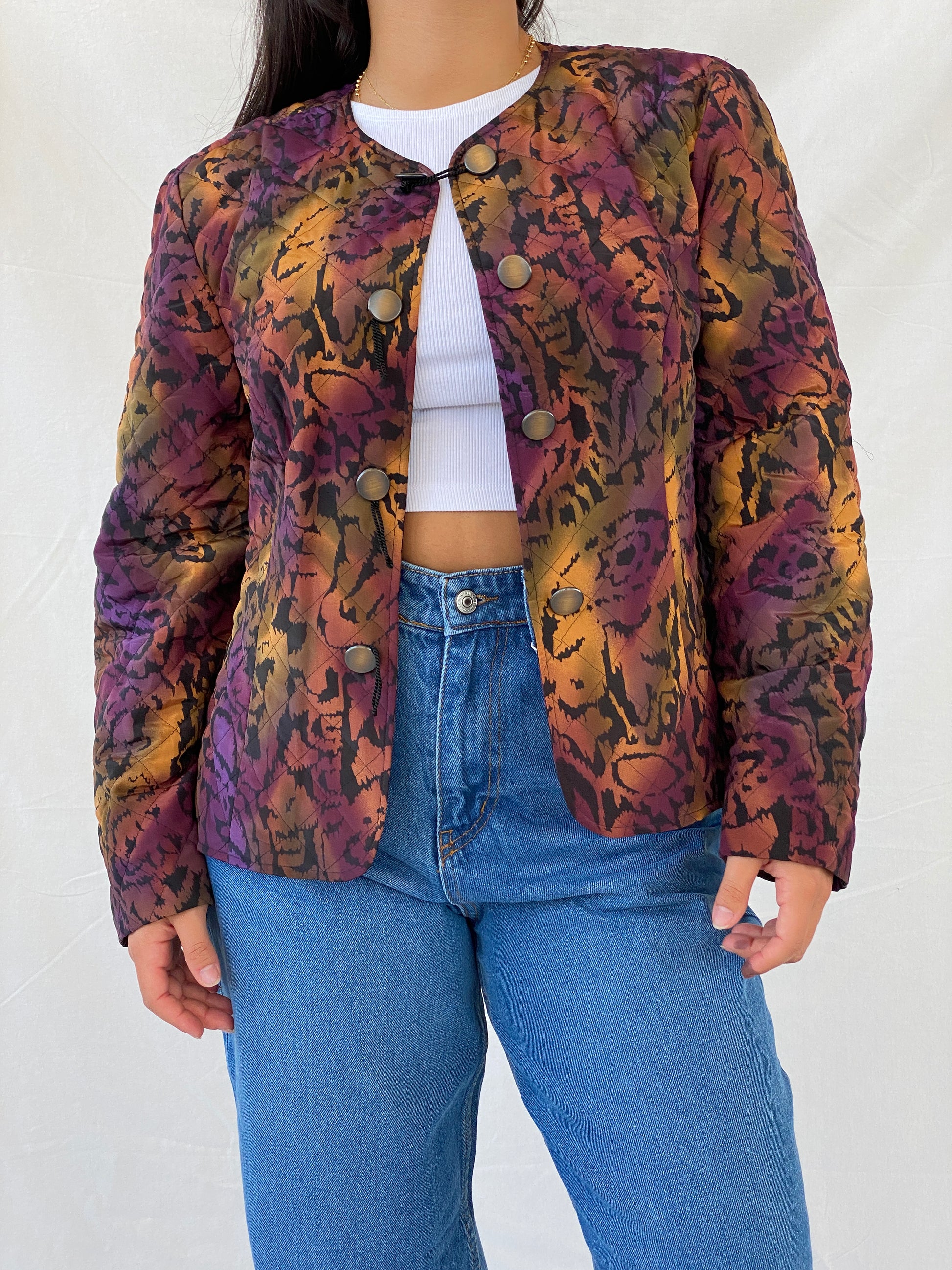 جاكيت فرانكنوالدر المبطن البنفسجي من الثمانينيات قطعة أساسية لموسم الخريف. مصنوع من قماش خفيف الوزن، ويتميز بأزرار مميزة وتدرج فريد من نوعه بين البنفسجي والبرتقالي بتقنية الصباغة بالربط، مع لمسة من طبعات الحيوانات. حافظي على أناقتكِ ودفئكِ مع هذا الجاكيت الفريد.
