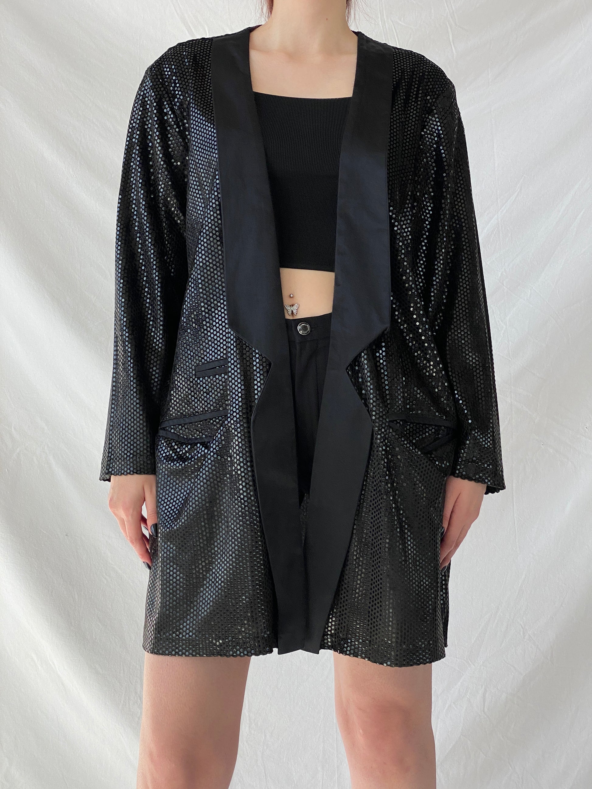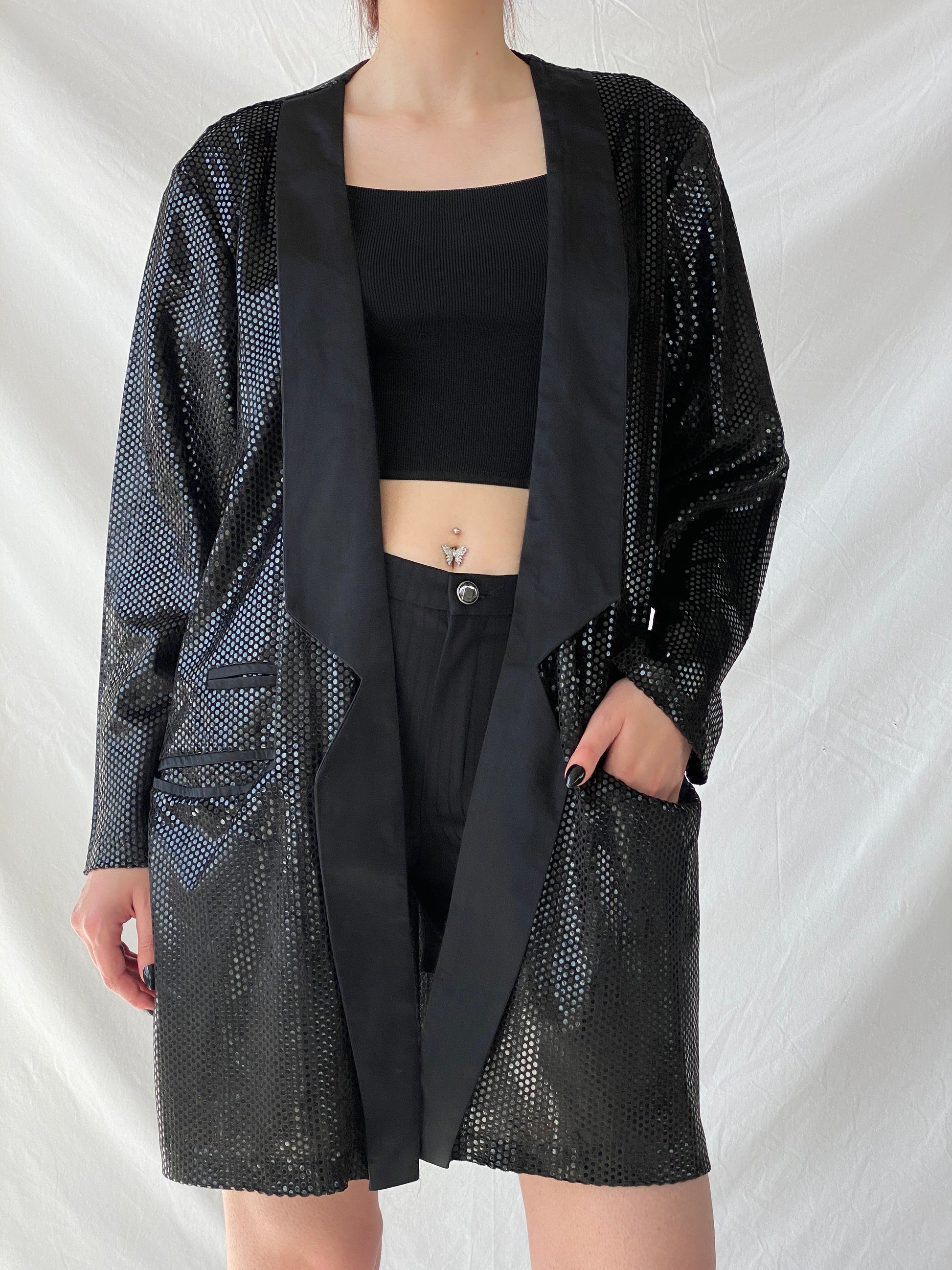 تألقي بإطلالة أنيقة في مناسبتكِ مع سترة "جينج" النسائية الطويلة للحفلات، المزينة بالترتر من التسعينيات، والمزينة بحواف من الساتان. هذه السترة الرائعة مزينة بالترتر البراق، لتُضفي لمسةً من فن الآرت ديكو. تألقي في مناسبتكِ القادمة وأنتِ تشعرين بالفخامة والأناقة.