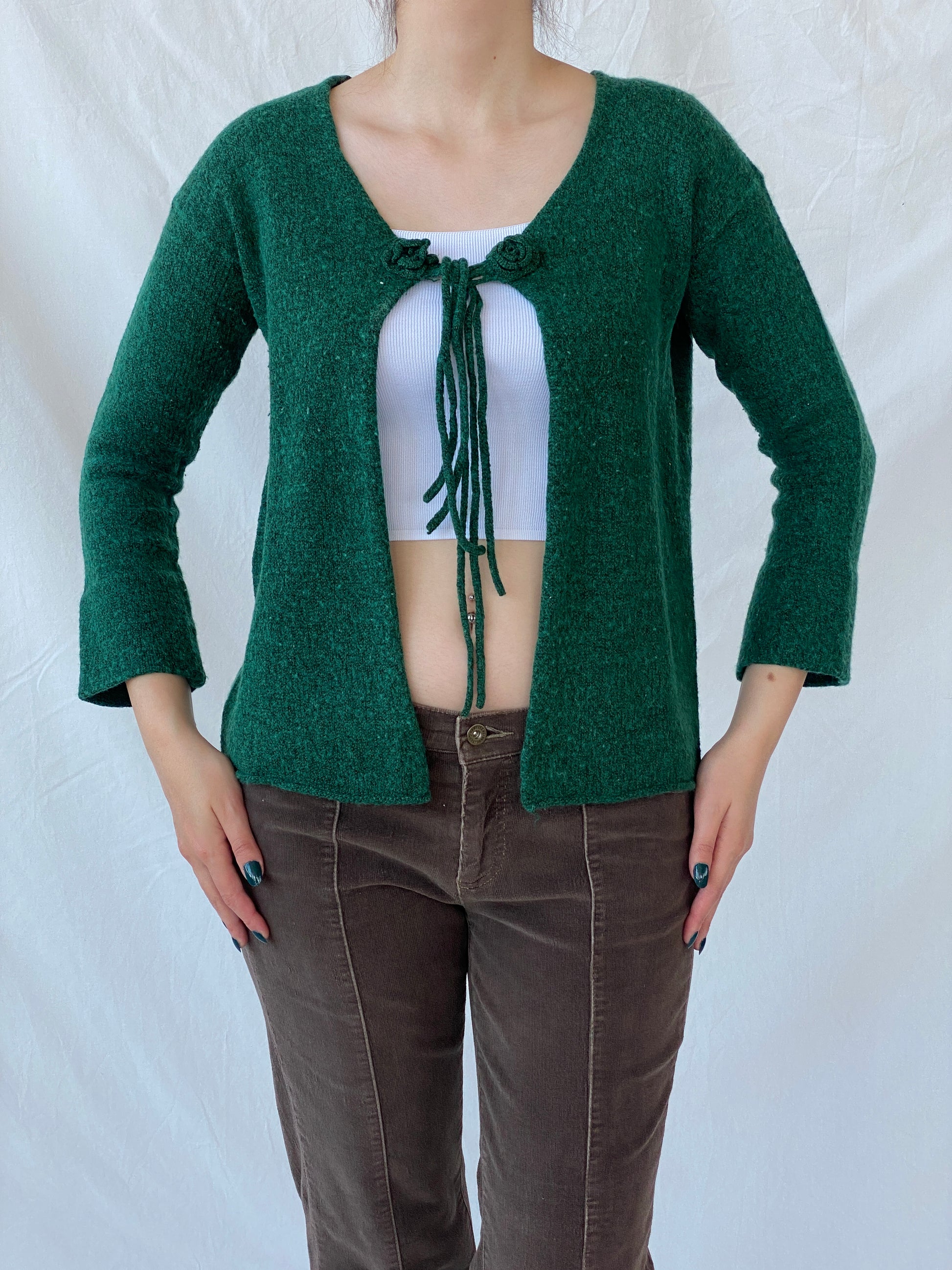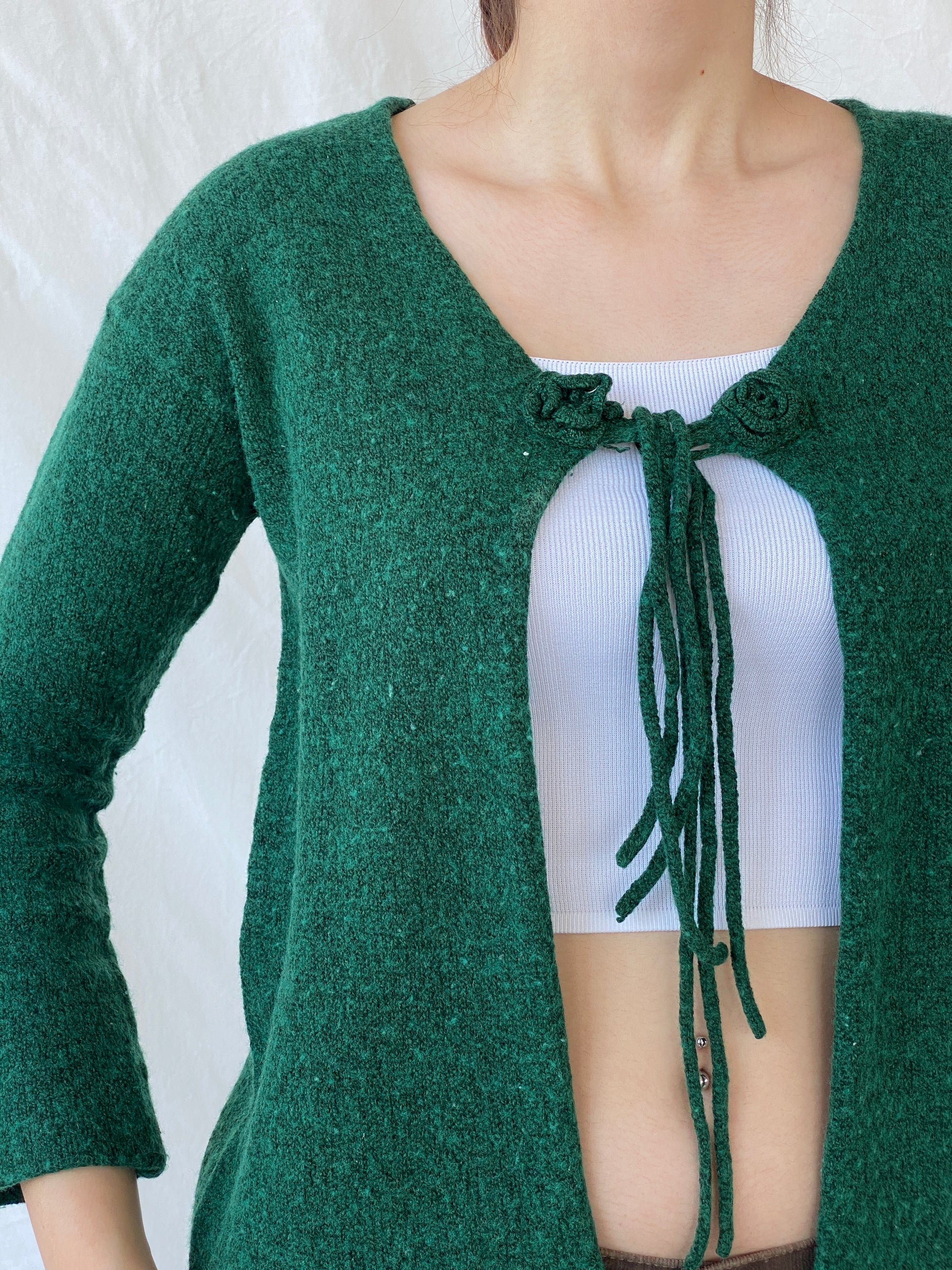 احصلي على هذا الكارديجان النسائي المحبوك باللون الأخضر العتيق، المصنوع من مزيج الصوف، برباط أمامي. نسقيه مع بنطال جينز داكن باهت وحذاء بكعب عالٍ فضي لإطلالة مميزة تناسب عام 2000.