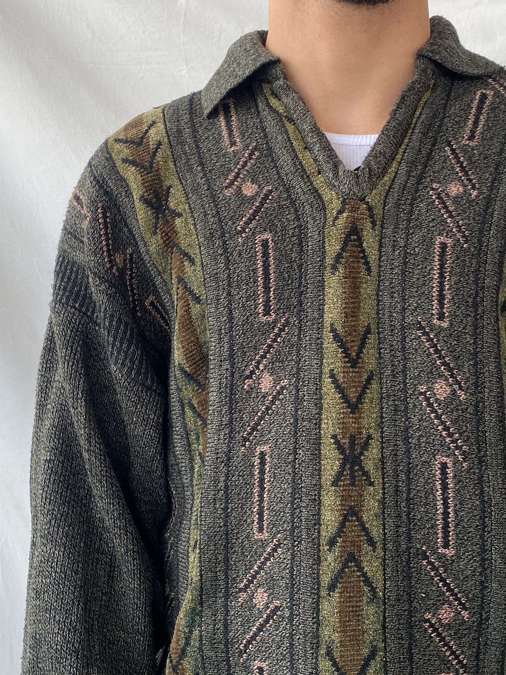 سترة رجالية عتيقة محبوكة برقبة دائرية وأشكال هندسية - مقاس كبير