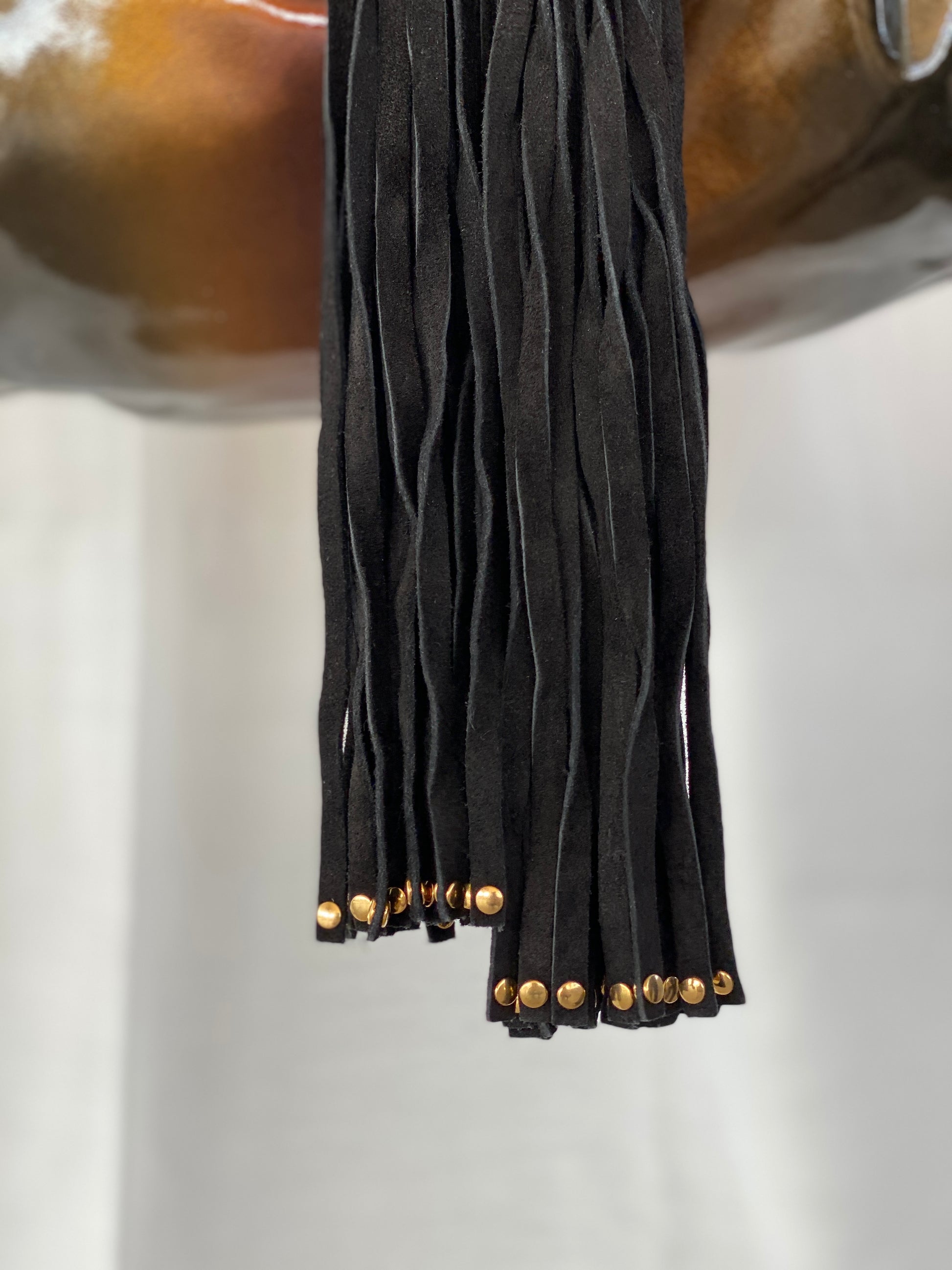 تتميز حقيبة إندي هذه بجسم من الجلد اللامع، ومقبض من الخيزران، وحزام مسطح من الجلد اللامع قابل للفصل، وغطاء مغناطيسي مفتوح، وتفاصيل شرابة، وحواف جانبية مطلية بالذهب، وأجزاء معدنية مرصعة بالمسامير، ومساحة داخلية واسعة مع جيب بسحاب.
