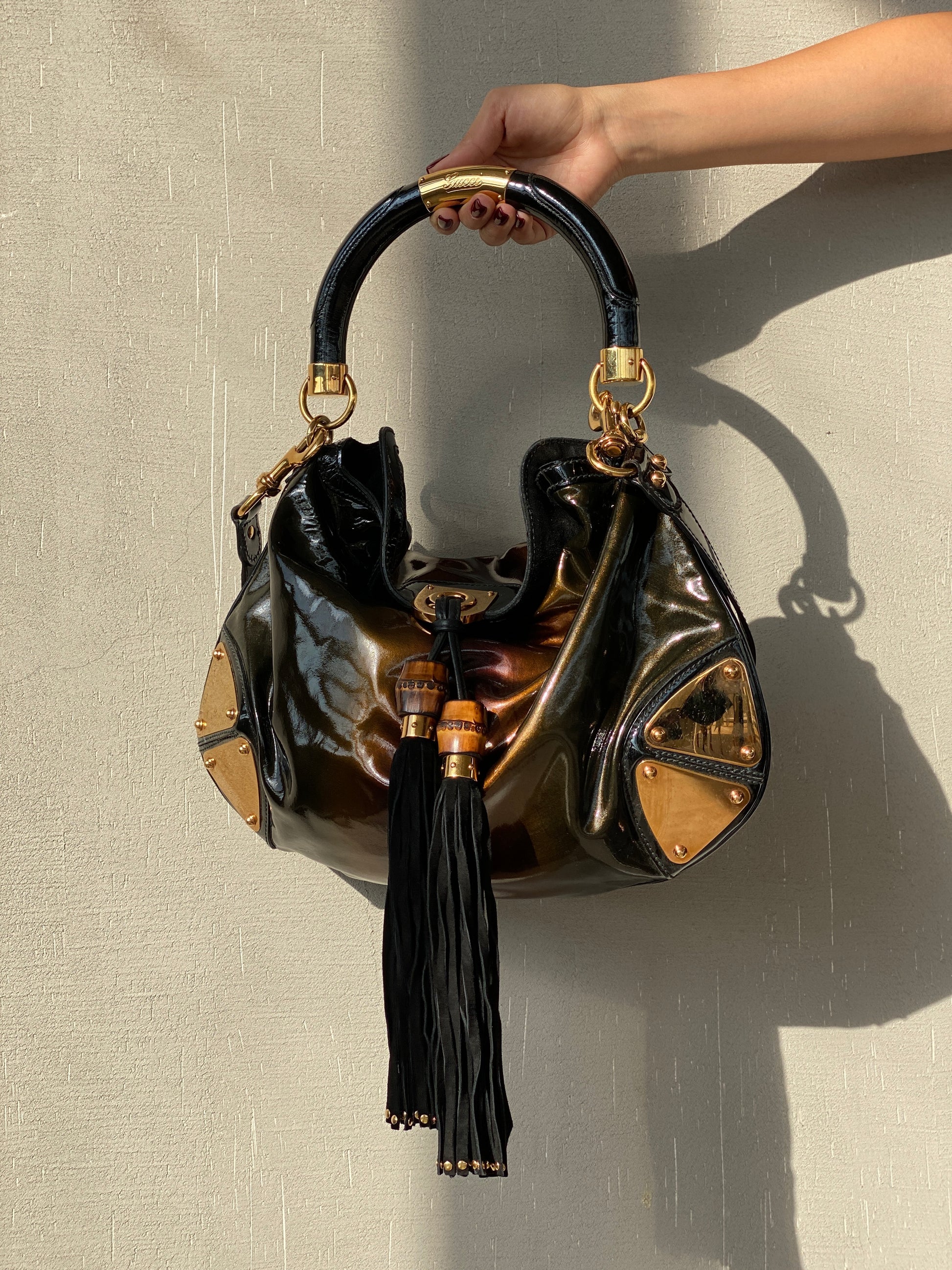 حقيبة جوتشي إندي بامبو من الجلد اللامع باللون الأسود والبرونزي من جوتشيسيما بوهيميا.