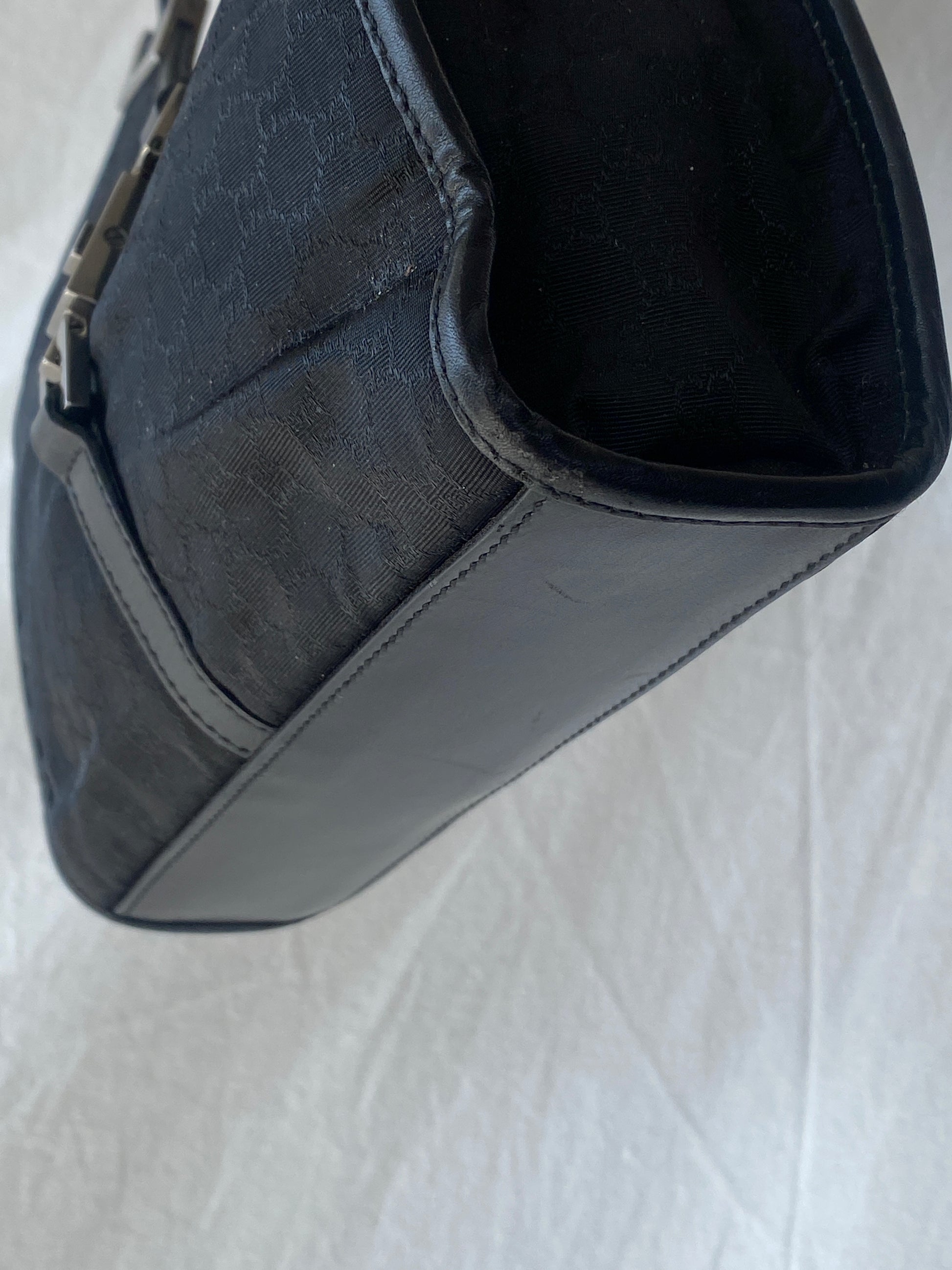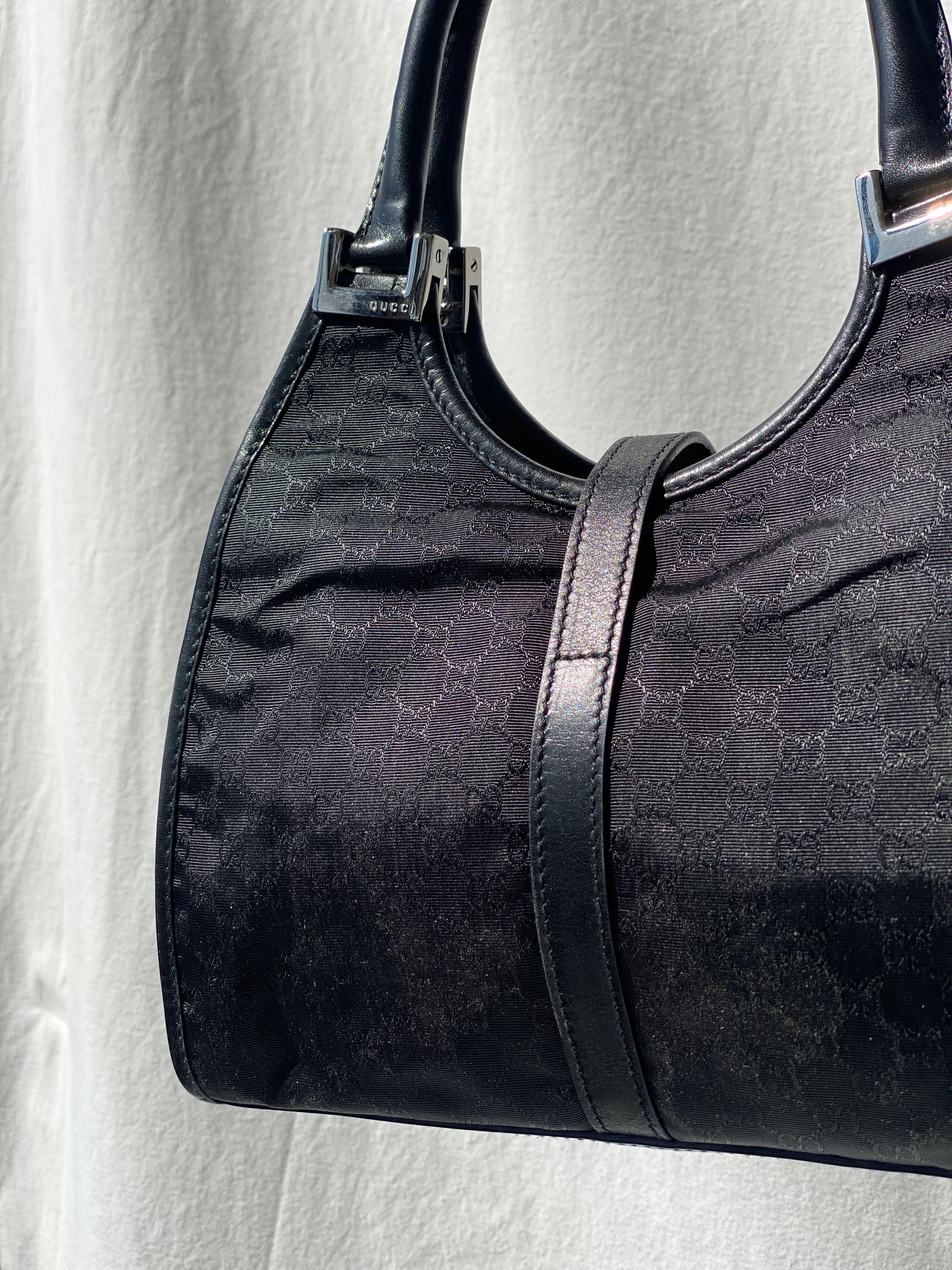 حقيبة يد صغيرة من القماش من مجموعة Gucci Jackie Bardot من الجلد الأسود بتصميم Monogram GG من عام 2000.