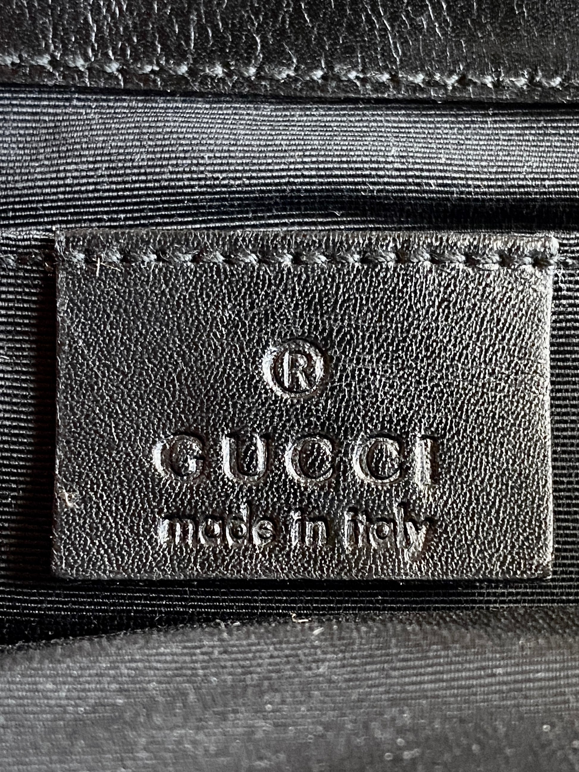 حقيبة كتف جاكي من القماش والجلد من إنتاج شركة جوتشي في إيطاليا في العقد الأول من القرن الحادي والعشرين، وهي بحالة جيدة جدًا.