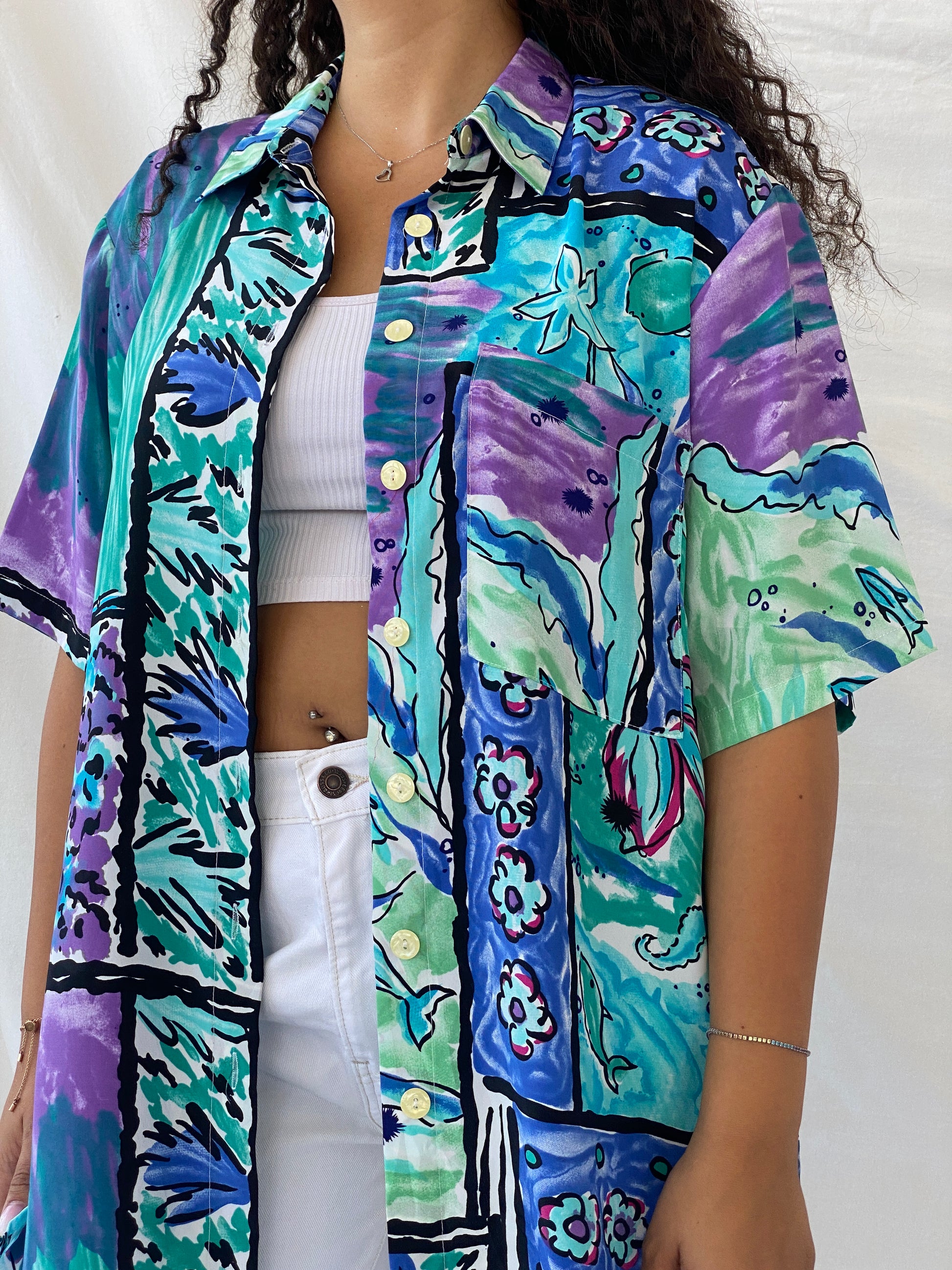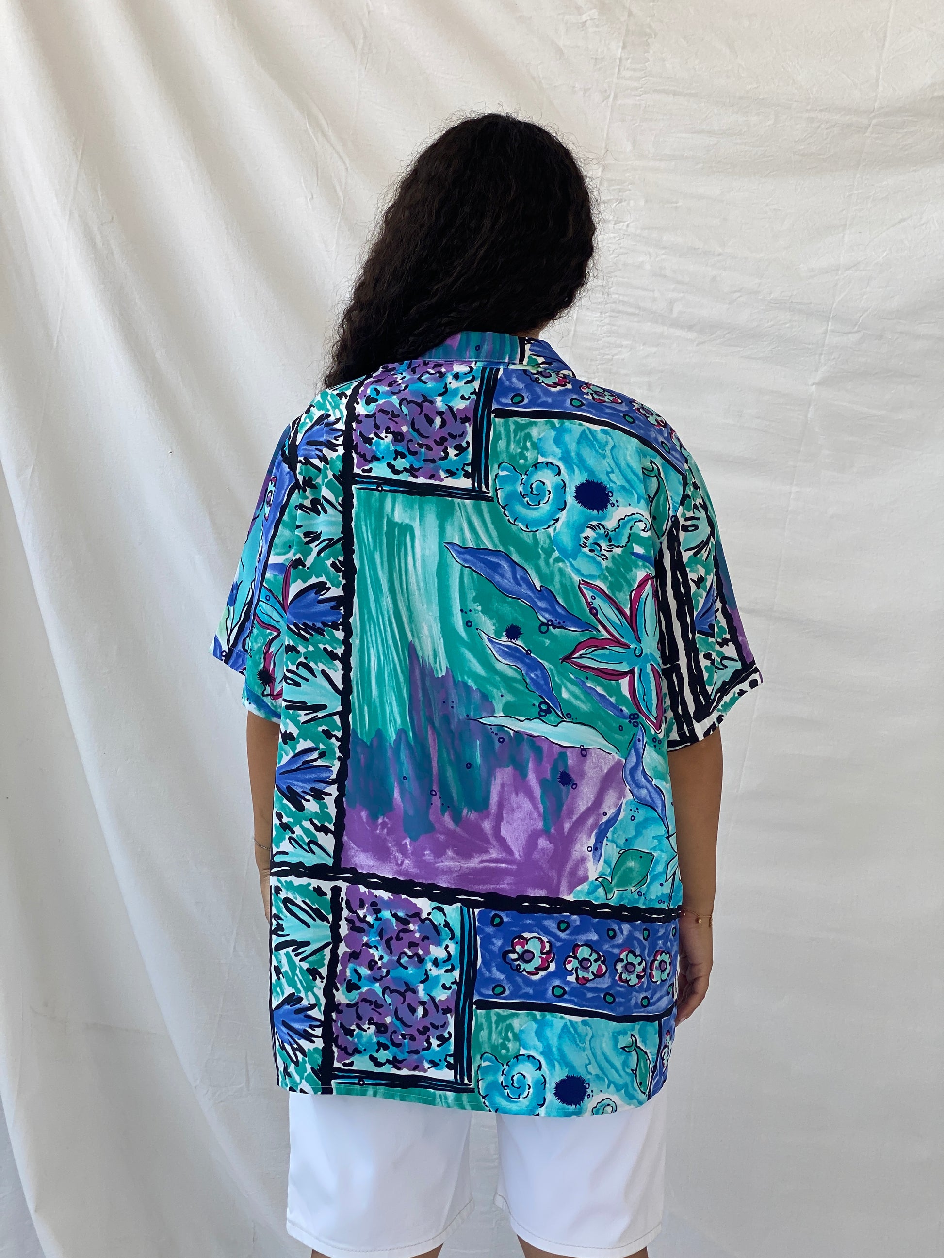 قميص كبير الحجم بتصميم زهور أزرق وأرجواني مصنوع يدويًا - مقاس XL