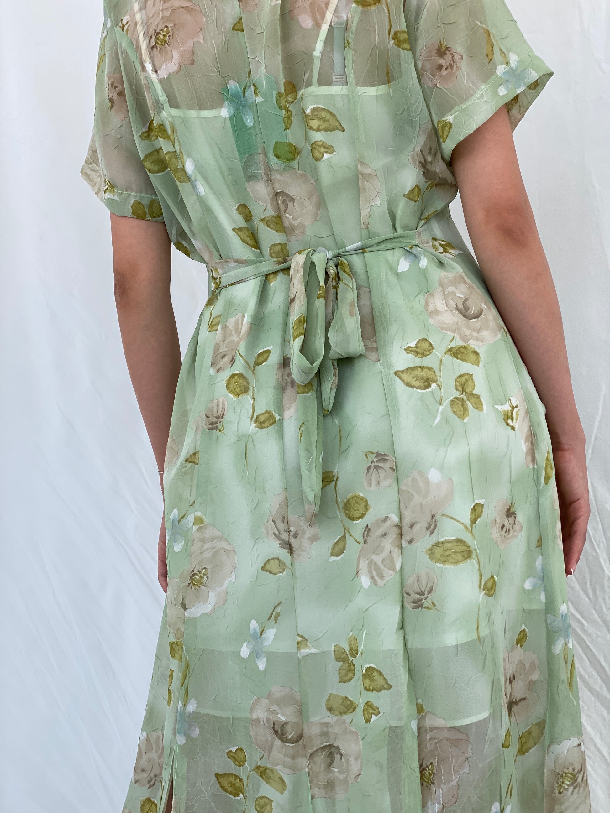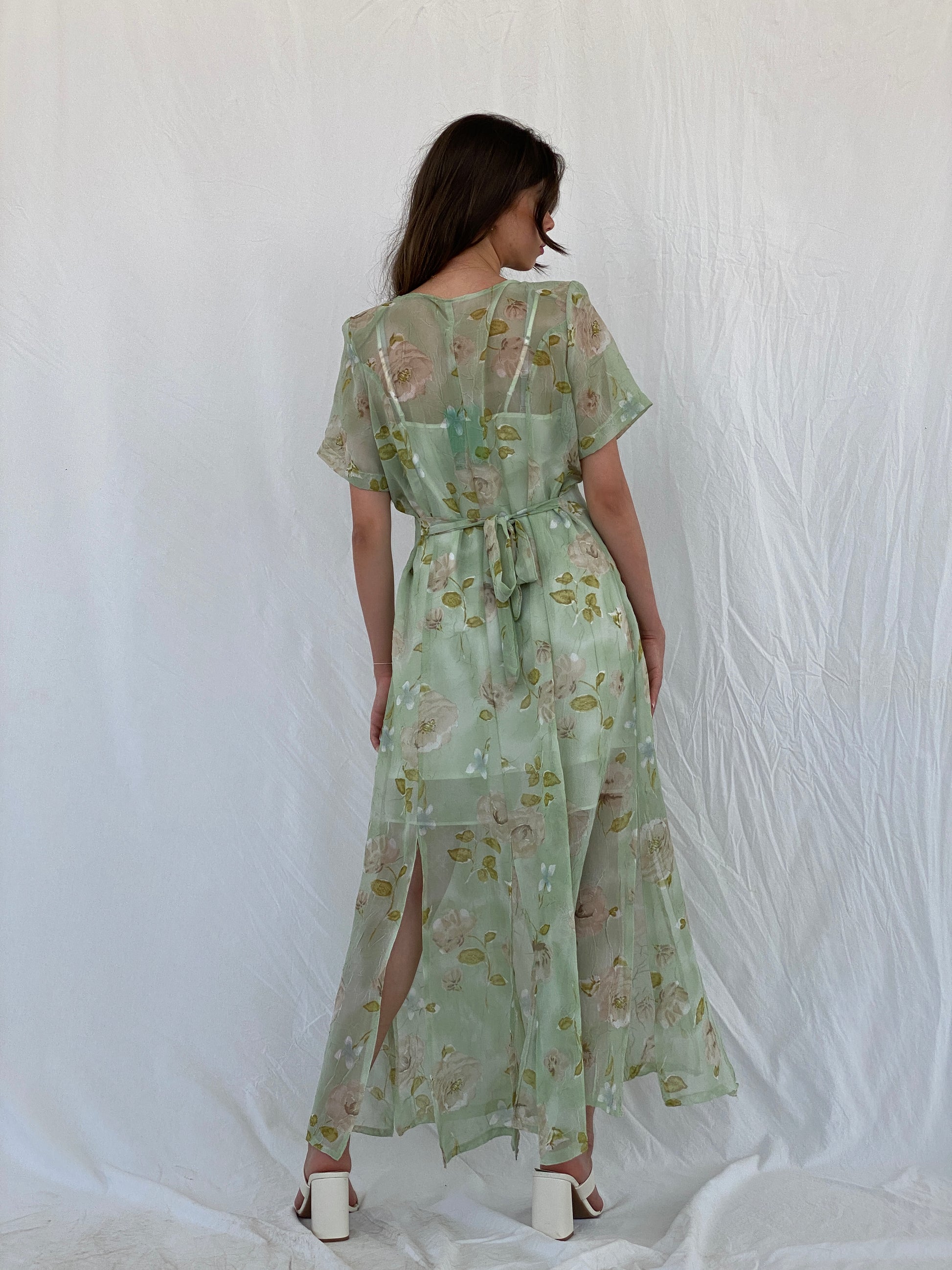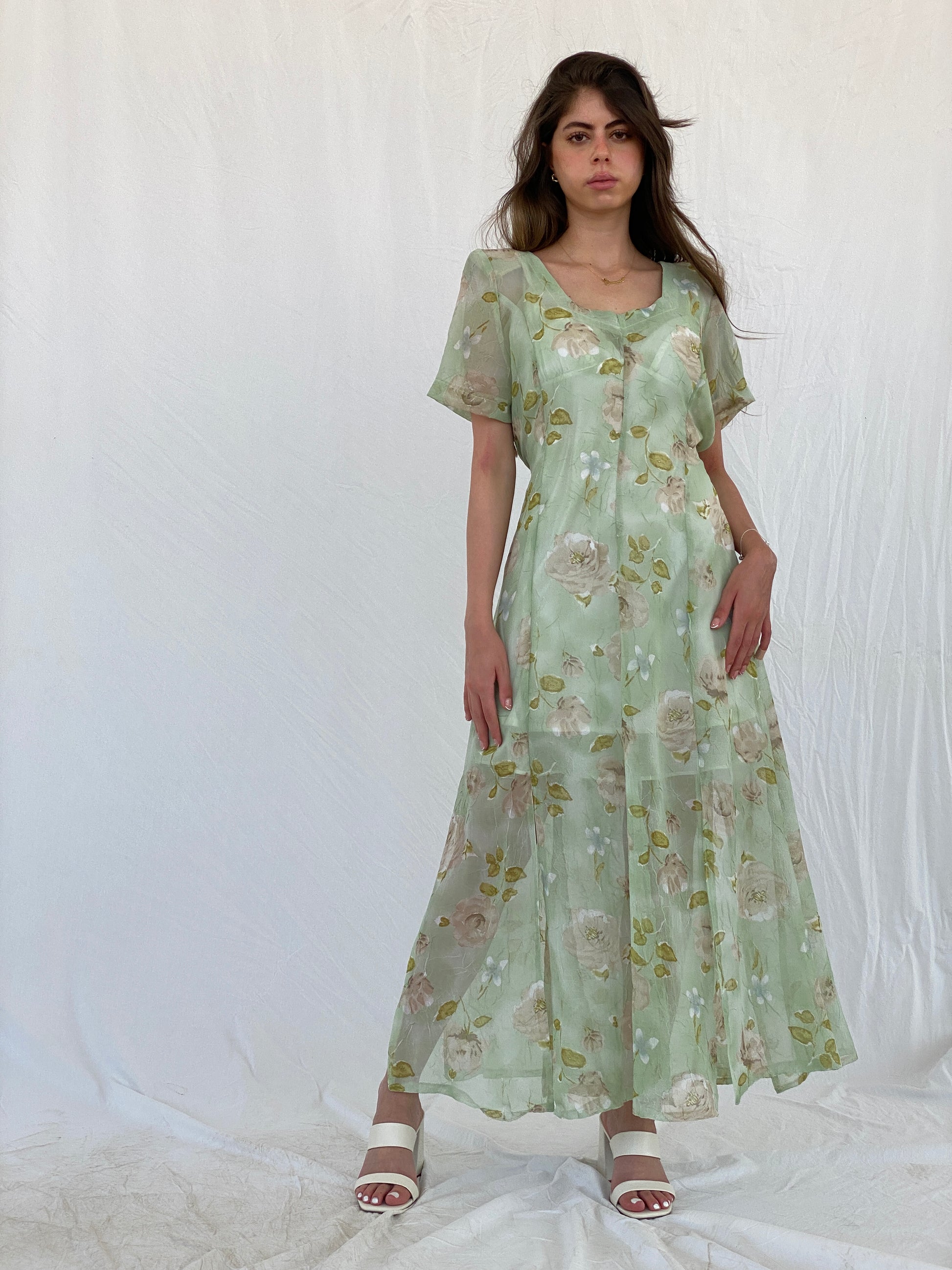 فستان ماكسي شفاف مطبوع عليه زهور باللون الأخضر النعناعي، مصنوع يدويًا - مقاس متوسط