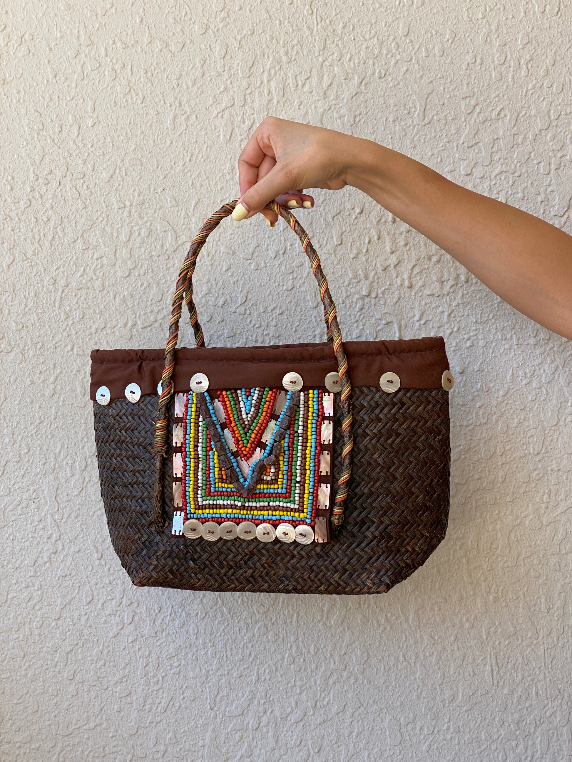 أضف لمسة من الأناقة البوهيمية إلى إطلالتك الصيفية مع حقيبة الشاطئ العتيقة المصنوعة يدويًا من القش. تتميز هذه الحقيبة الفريدة بلوحة جريئة من الخرز مستوحاة من الطراز القبلي وزخارف صدفية لامعة. مثالية لأيام الشاطئ أو لإضافة لمسة بوهيمية إلى أي إطلالة. الكمية محدودة، فاحصل عليها قبل فوات الأوان! ☀️