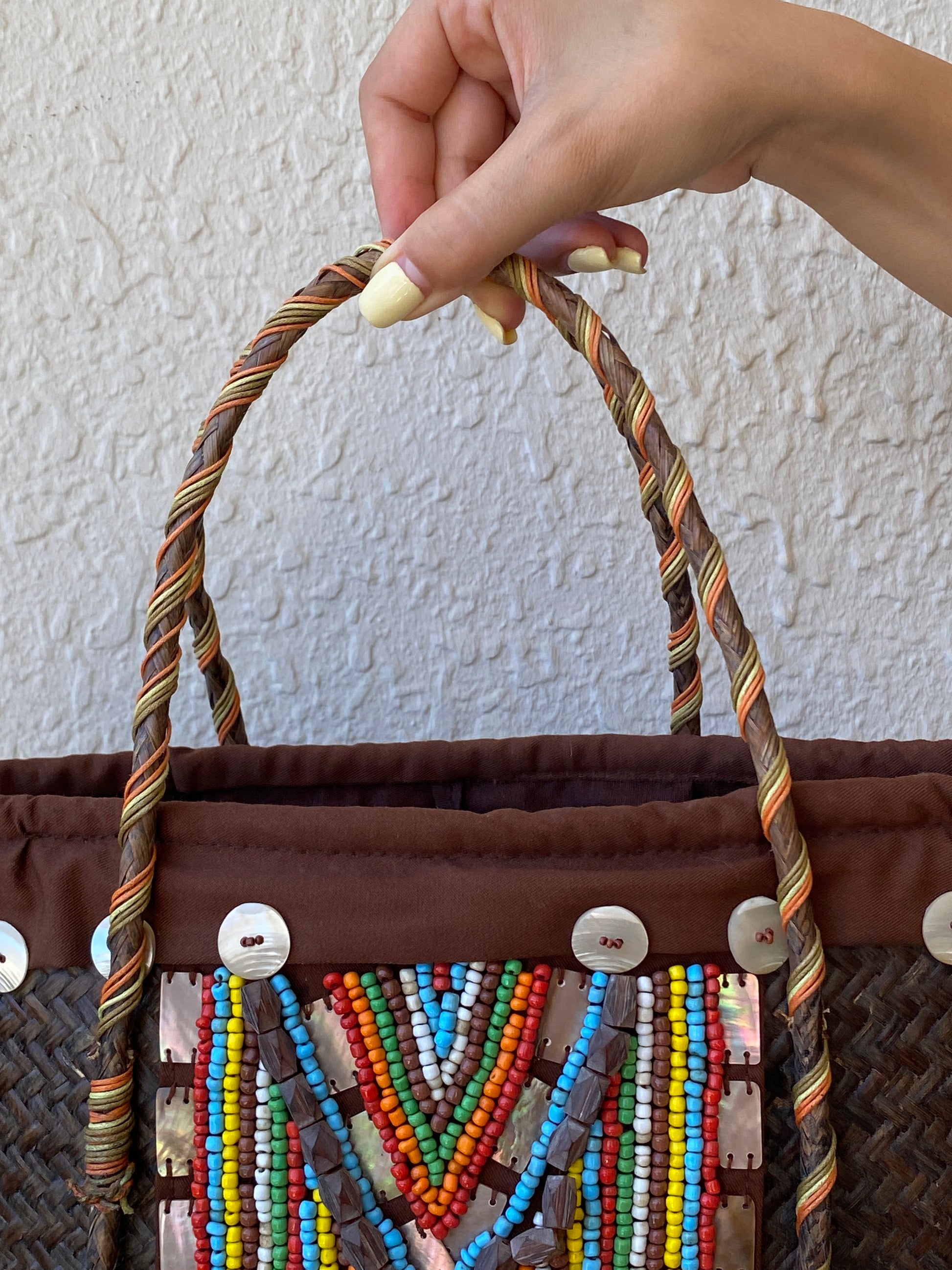 حقيبة شاطئ عتيقة من القش المنسوج يدويًا مع تفاصيل قبلية مطرزة بالخرز ولمسات من الصدف