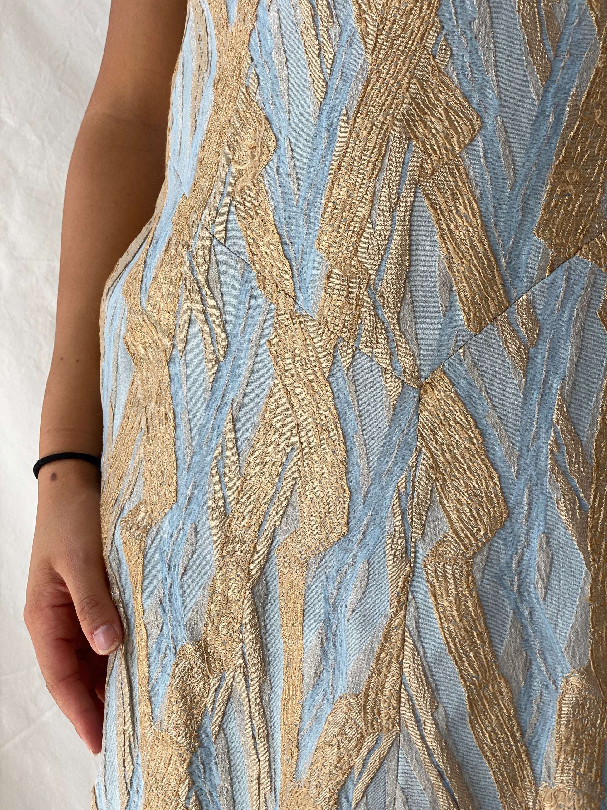 فستان متوسط الطول من تصميم جوهان دي هاس، ذهبي كريمي، بدون أكمام، من الجاكار، مقاس متوسط
