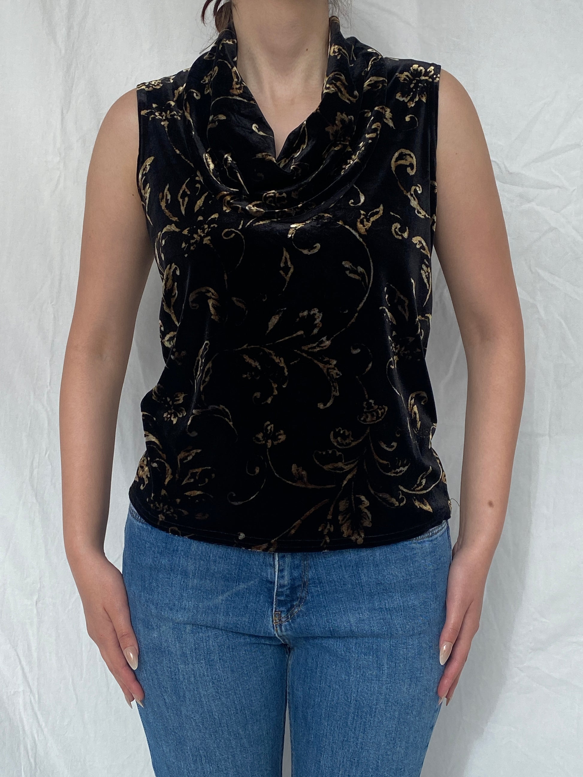 احصلي على هذه البلوزة النسائية الكلاسيكية من مجموعة كاثي لي الكلاسيكية، باللونين الأسود والذهبي، بتصميمها المخملي، بدون أكمام، من التسعينيات. نسقيها مع بنطال جينز داكن باهت وحذاء بكعب عالٍ ذهبي لإطلالة مميزة تناسب جيل الألفية.