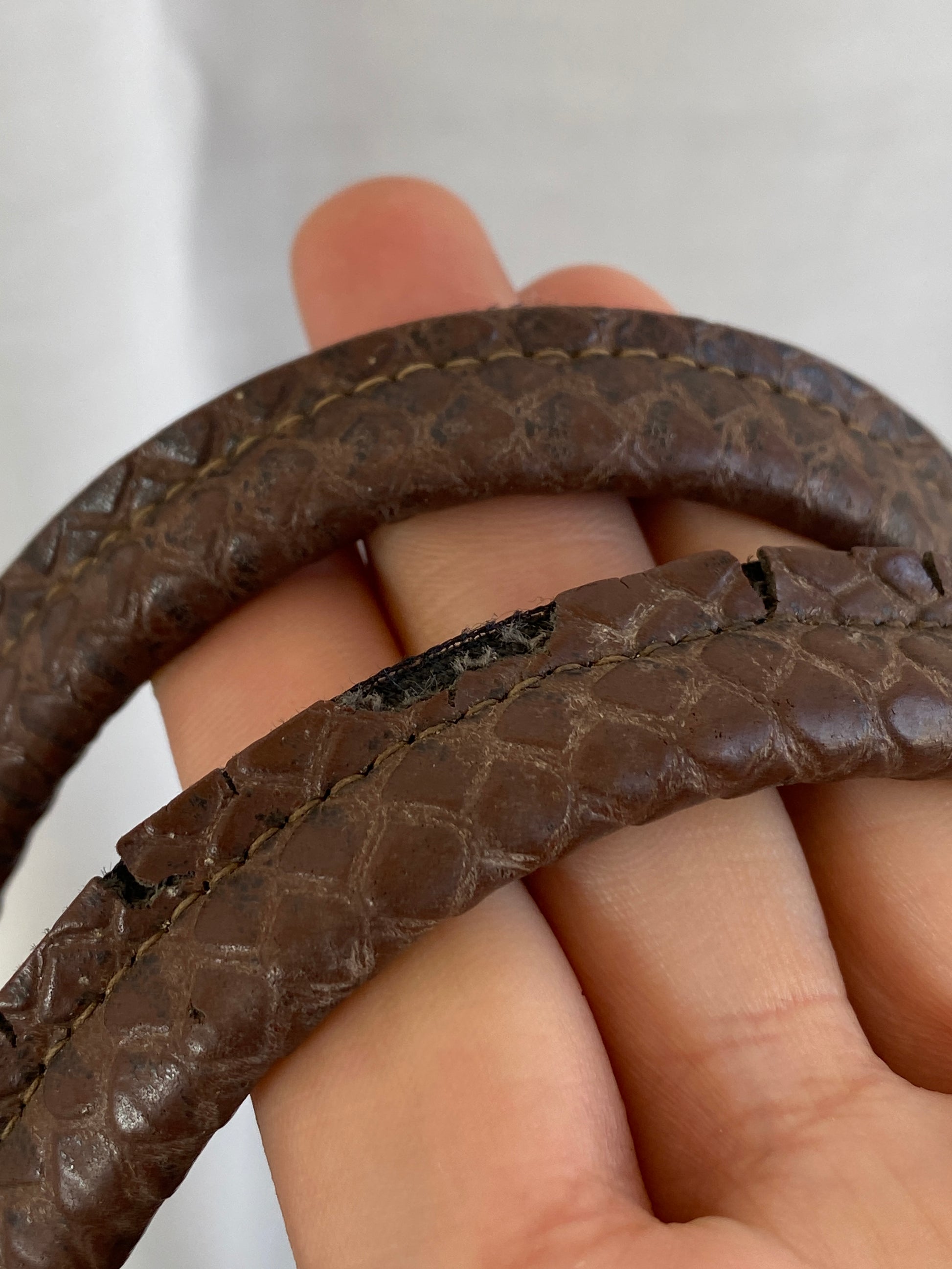 * كسر الجلد على الحزام، وتغير اللون على الأجزاء المعدنية كما هو موضح في الصور.