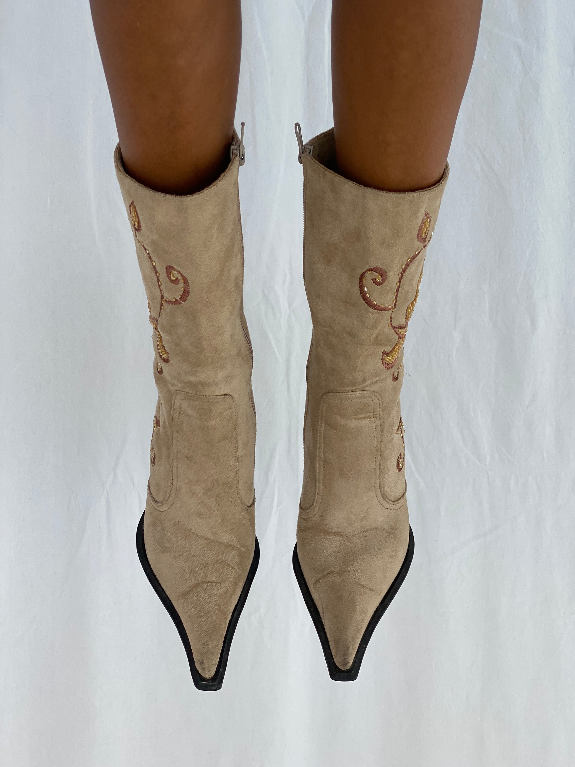 حذاء بكعب غربي مزخرف من جلد الغزال بلون الجمل من ميلانو فينتاج