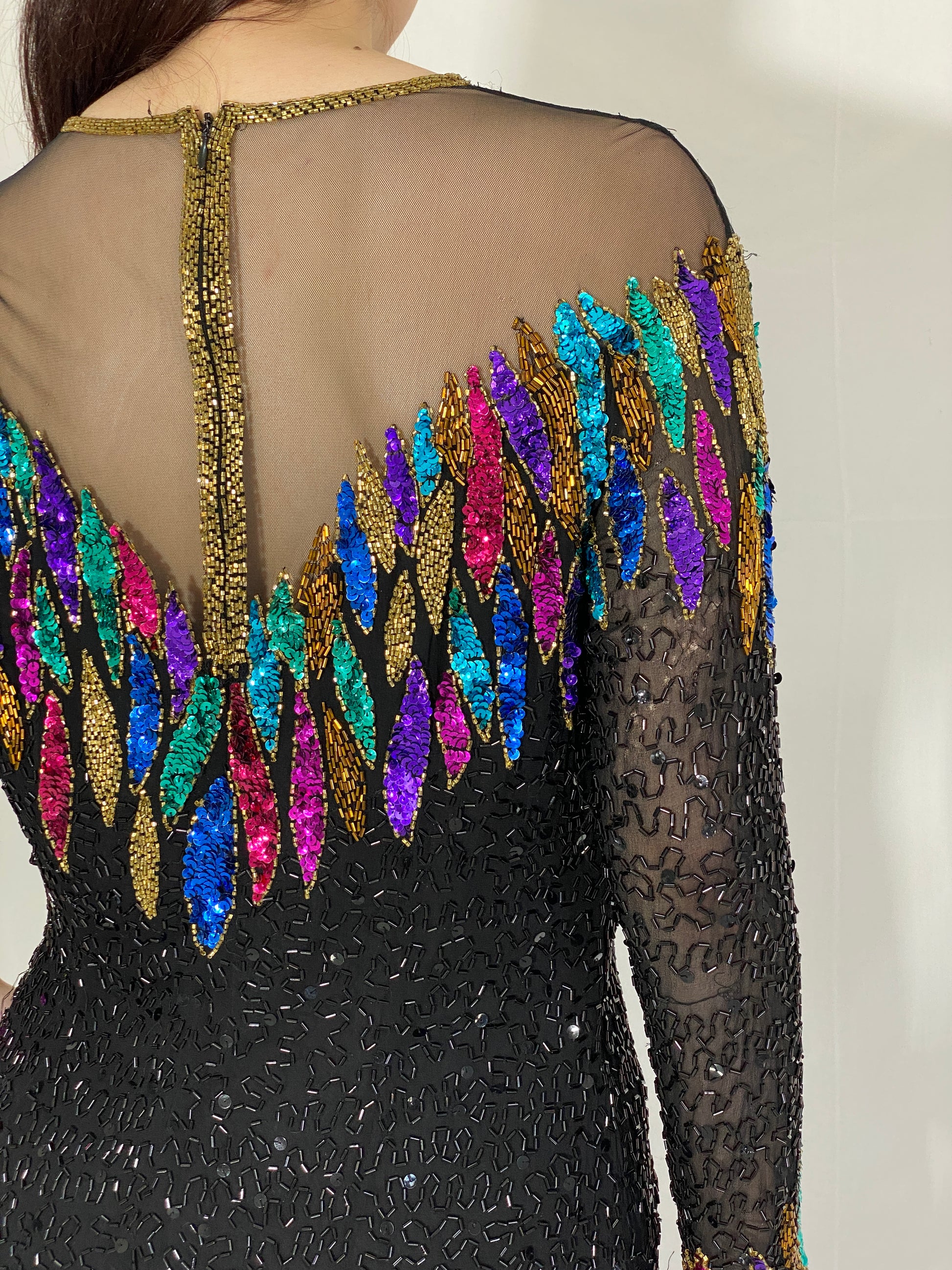 - التفاصيل: رقبة شبكية شفافة، نمط يشبه لهب الترتر متعدد الألوان عبر الصدر والأكمام، قاعدة حريرية مزينة بالخرز بالكامل، سحاب خلفي للإغلاق