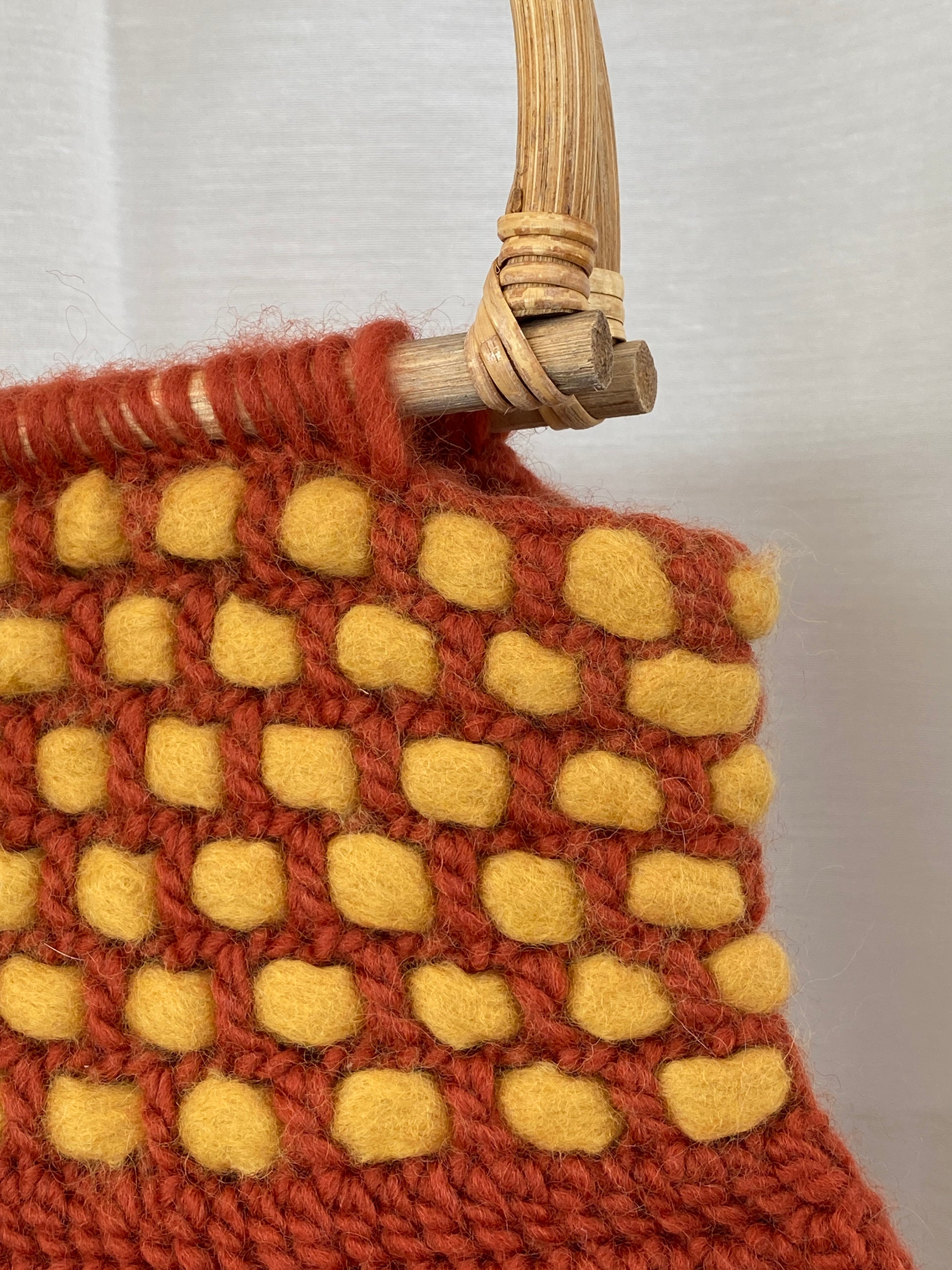حقيبة يد شاطئية منسوجة بمقبض خشبي من الصوف البرتقالي العتيق