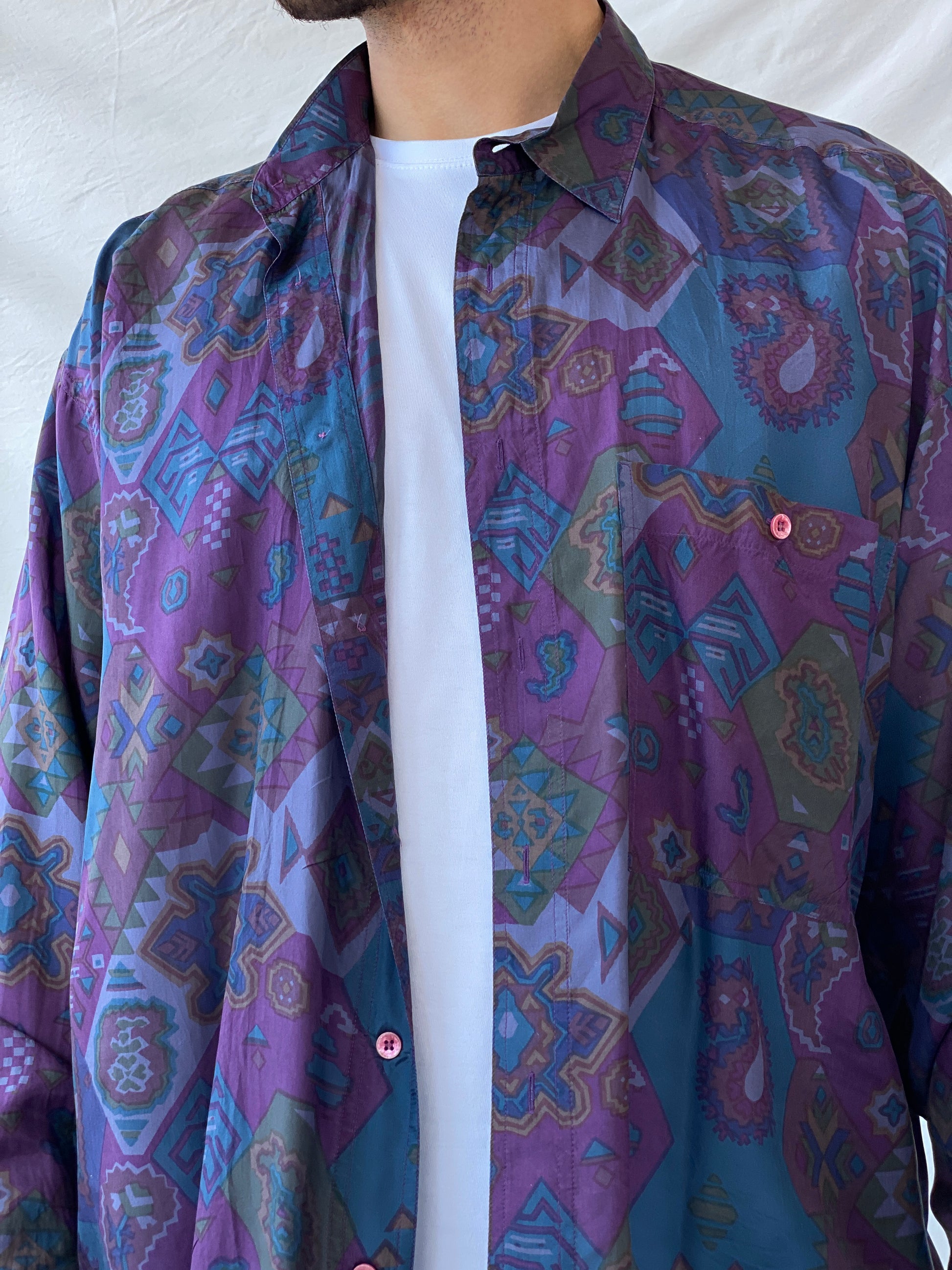 قميص رجالي من الحرير بأزرار أرجوانية بطبعة تجريدية من طراز Vintage Protest Boho - مقاس كبير