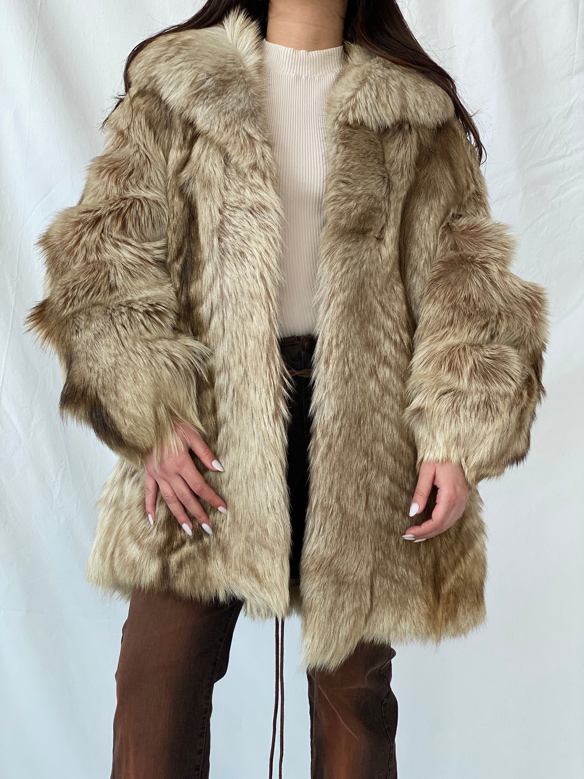 معطف نسائي فاخر من الفرو الطبيعي باللون البيج، جاكيت من الفرو الطبيعي الأصلي - مقاس كبير