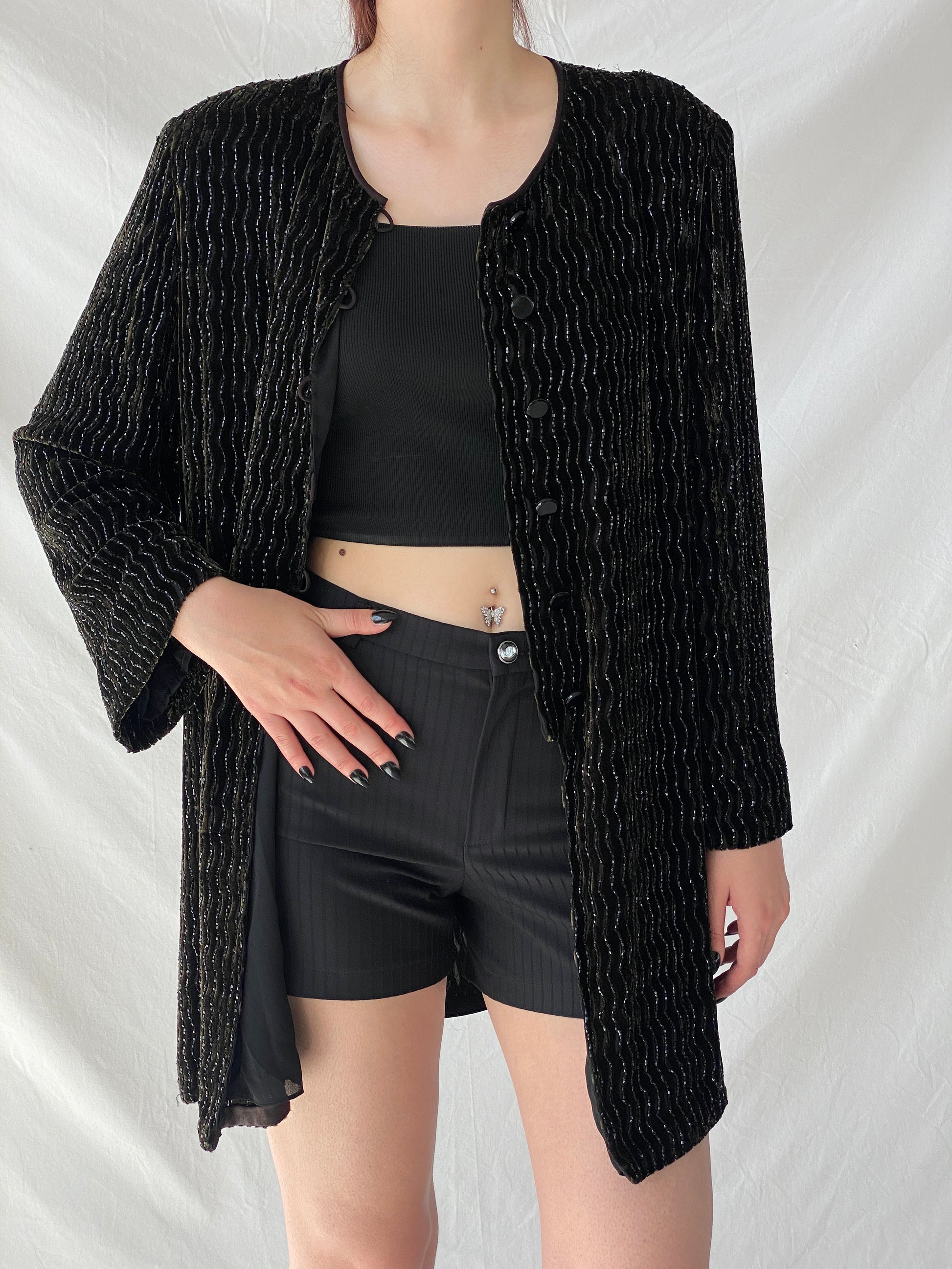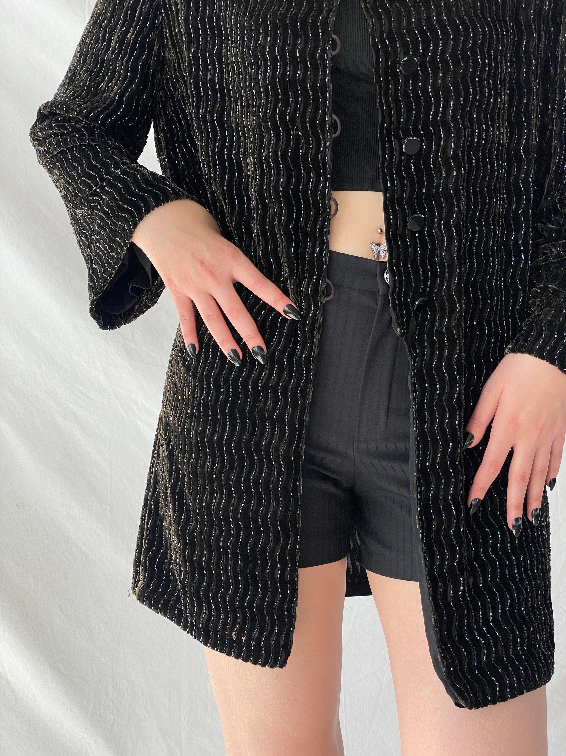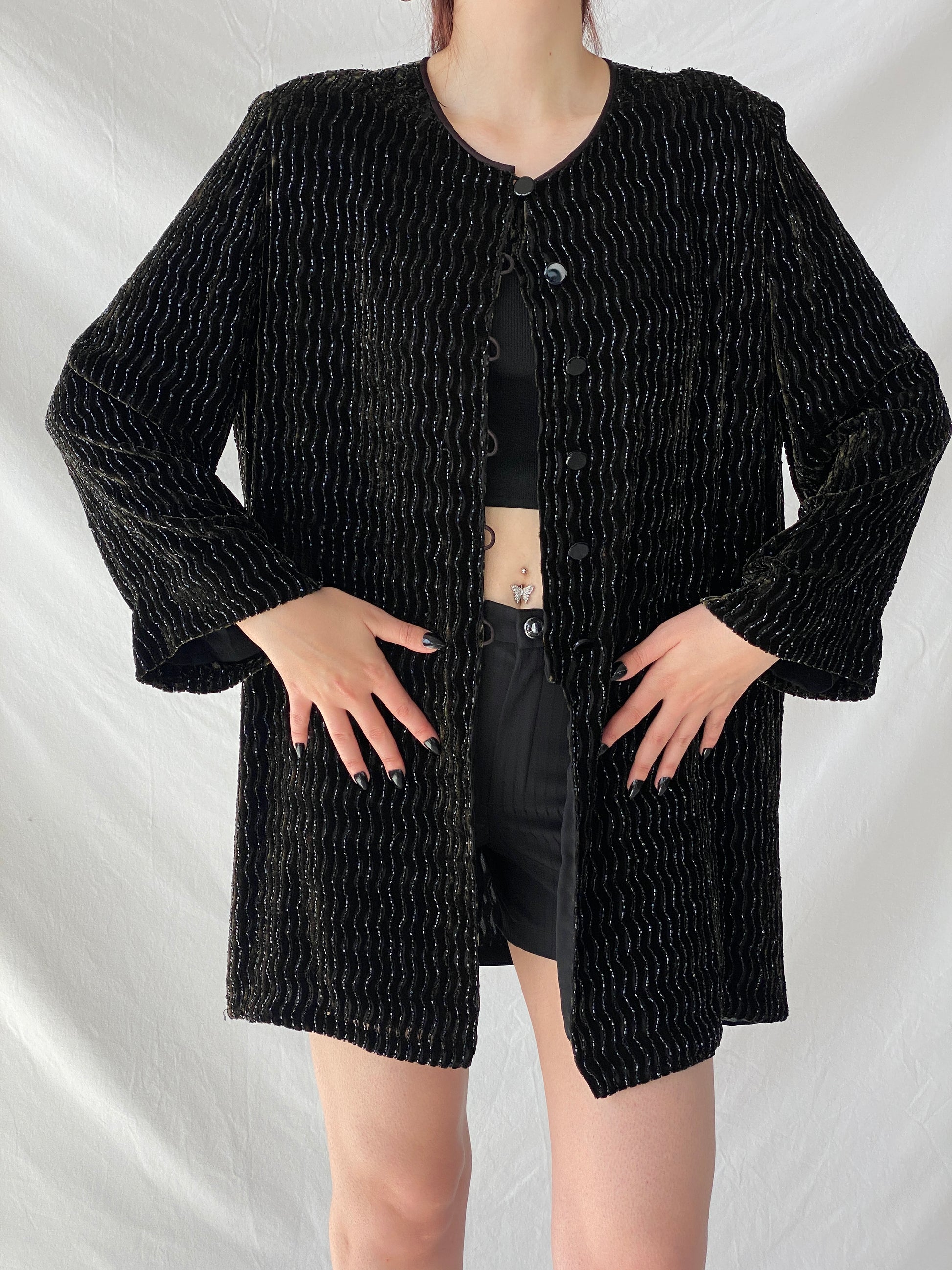 ارتقِ بإطلالتك في الحفلات مع جاكيت الحفلات المصنوع من مزيج الحرير باللون الأخضر الداكن والأسود من تصميم ريكي فريمان لـ تيري جون نايت، والذي يعود إلى حقبة الثمانينيات. هذا الجاكيت الرائع مزين بخرز لامع ومتقن، مستوحى من فن الآرت ديكو. تألقي في مناسبتكِ القادمة وأنتِ تشعرين بالفخامة والأناقة.