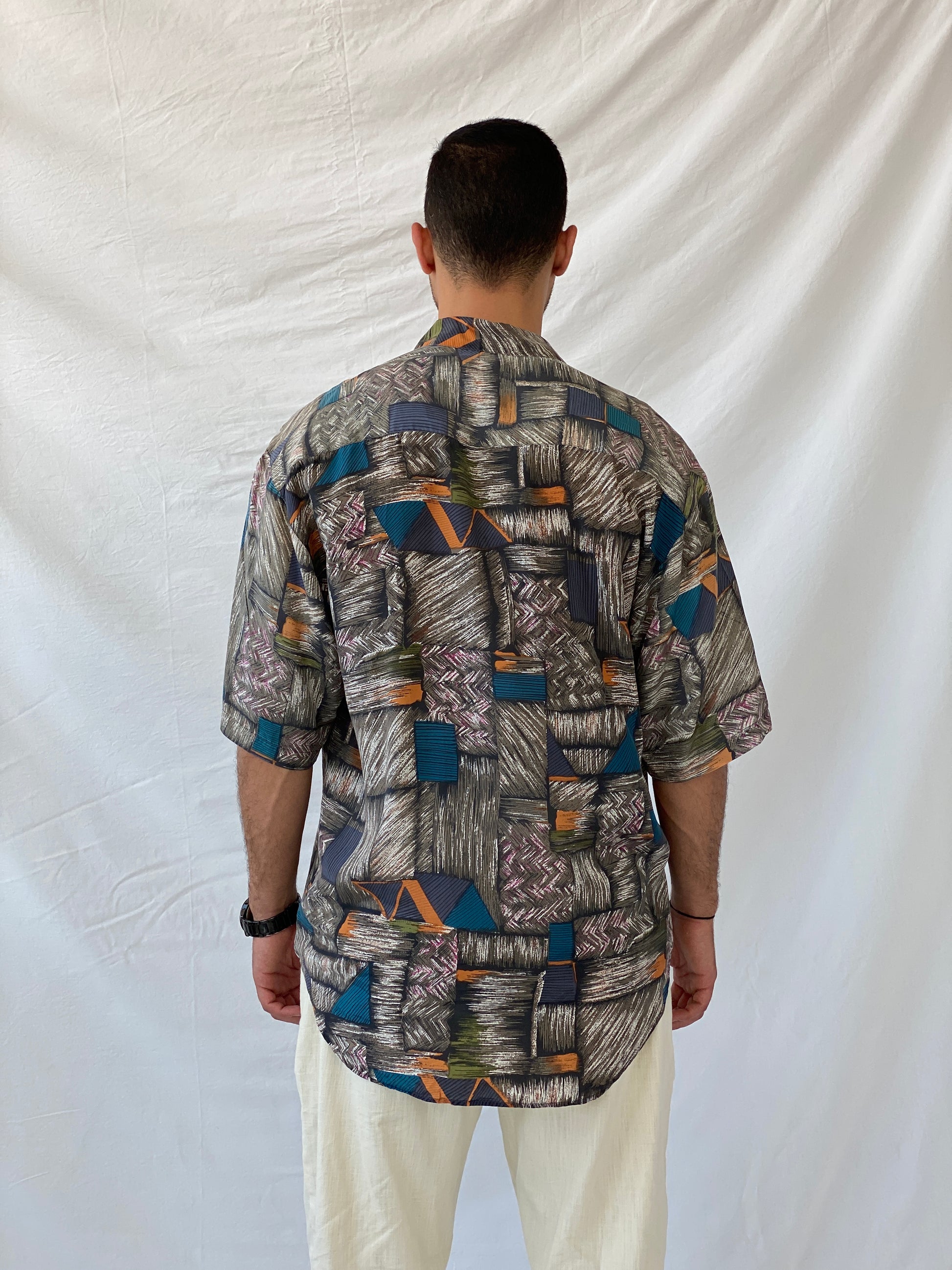 قميص رجالي من الحرير بأكمام قصيرة وأزرار كبيرة الحجم بتصميم تجريدي من سانتانا فينتيج - مقاس كبير