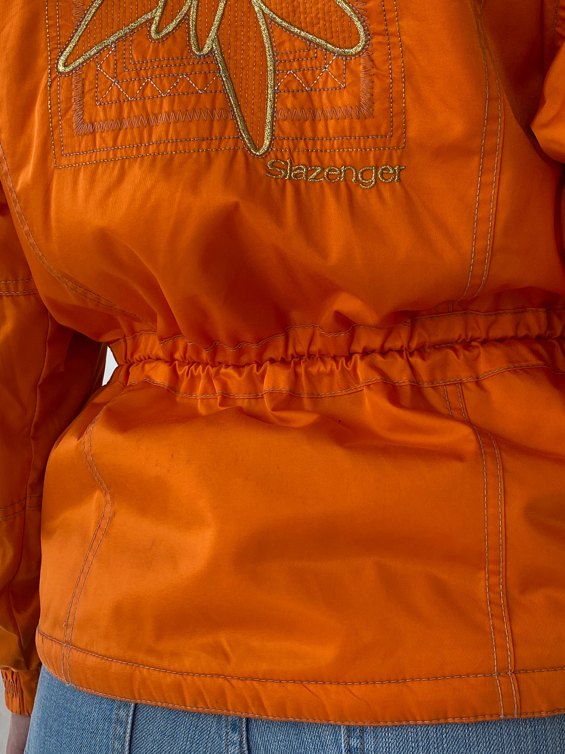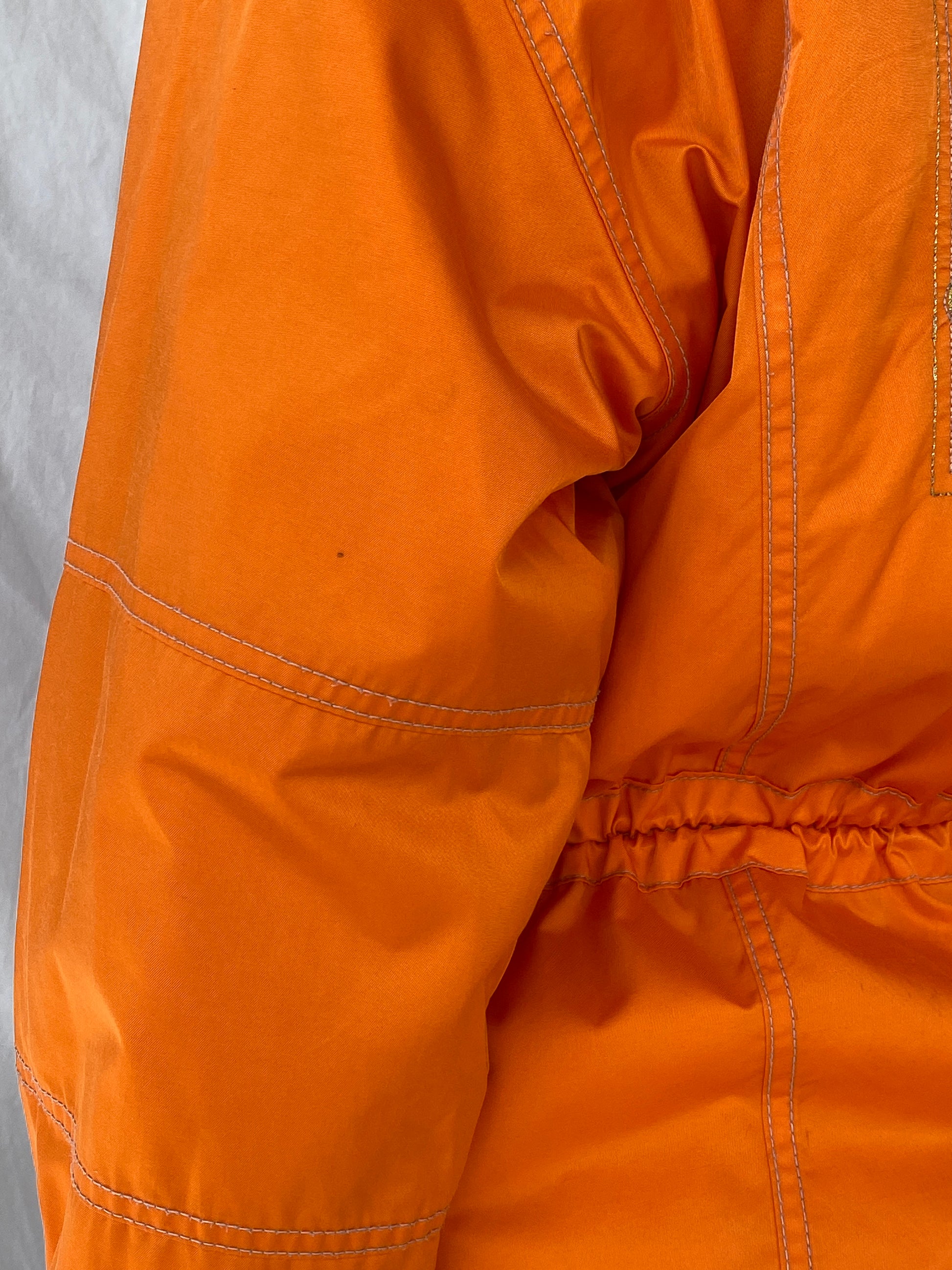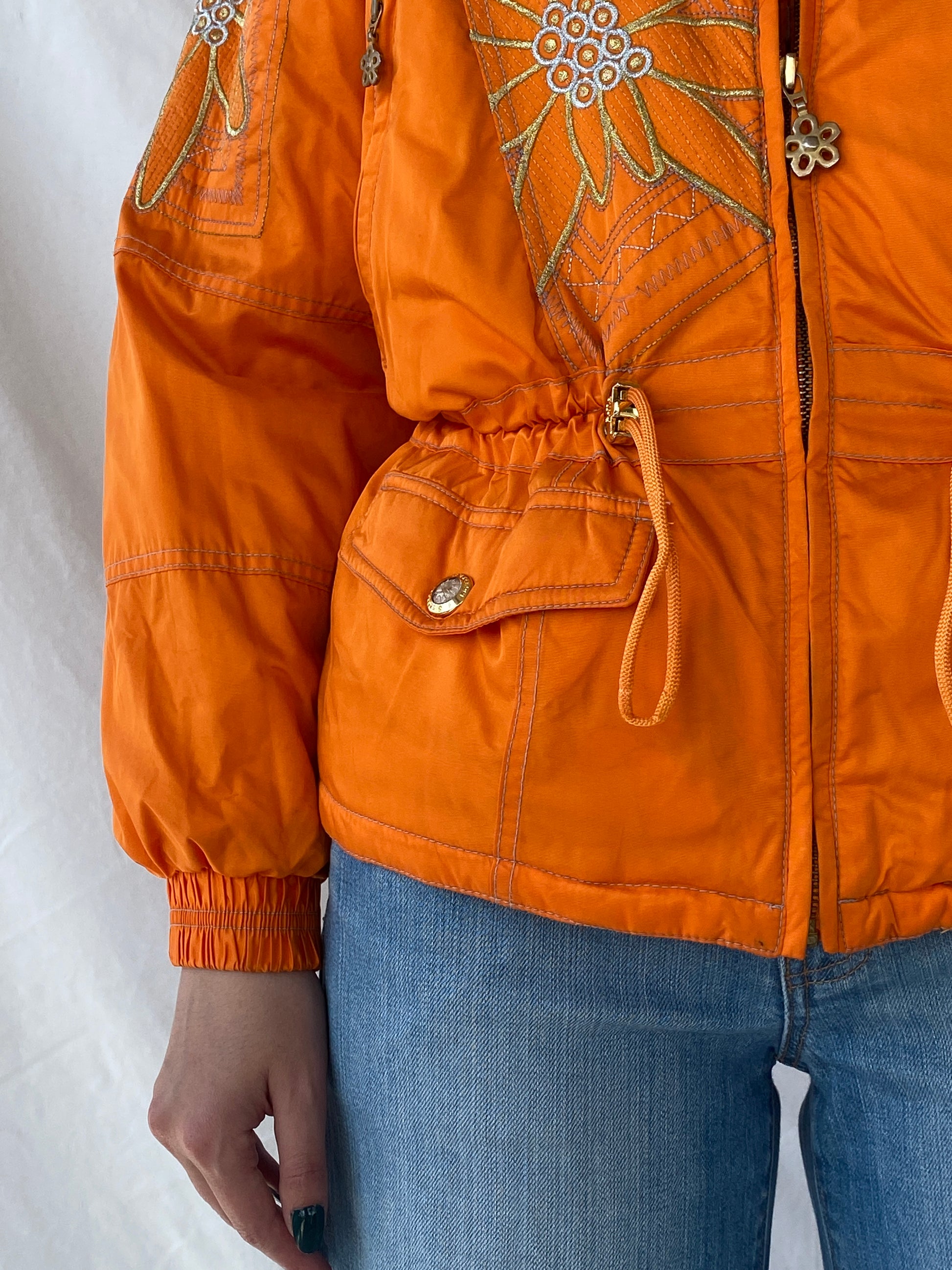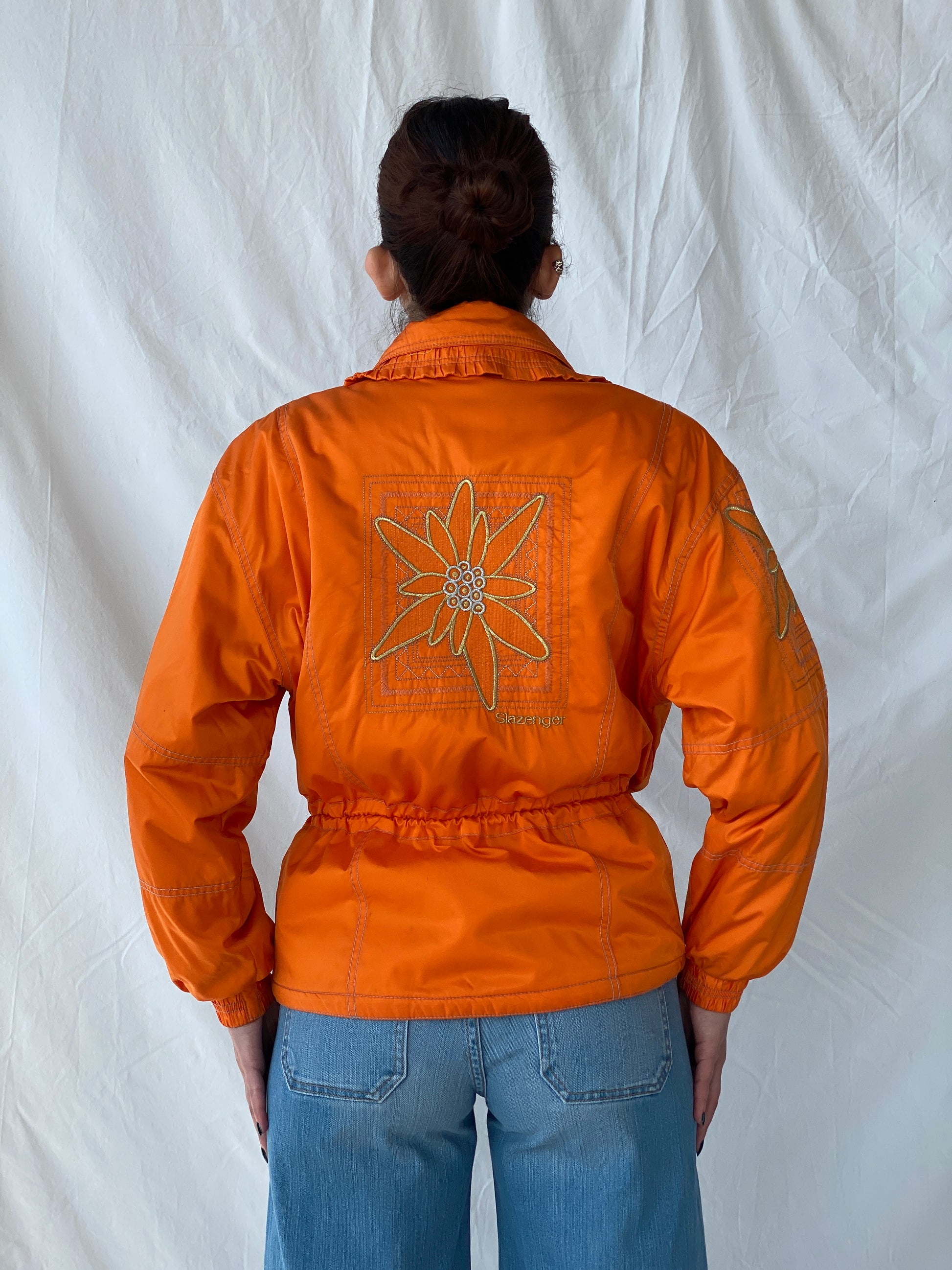 استمتع بأجواء الماضي مع جاكيت سلازنجر للتزلج المنفوش البرتقالي الذهبي المزين بالزهور من الثمانينيات والتسعينيات. يتميز هذا الجاكيت الكلاسيكي بتصميم كلاسيكي مع لمسات برتقالية وذهبية، مثالي للتزلج على المنحدرات أو بعد التزلج.