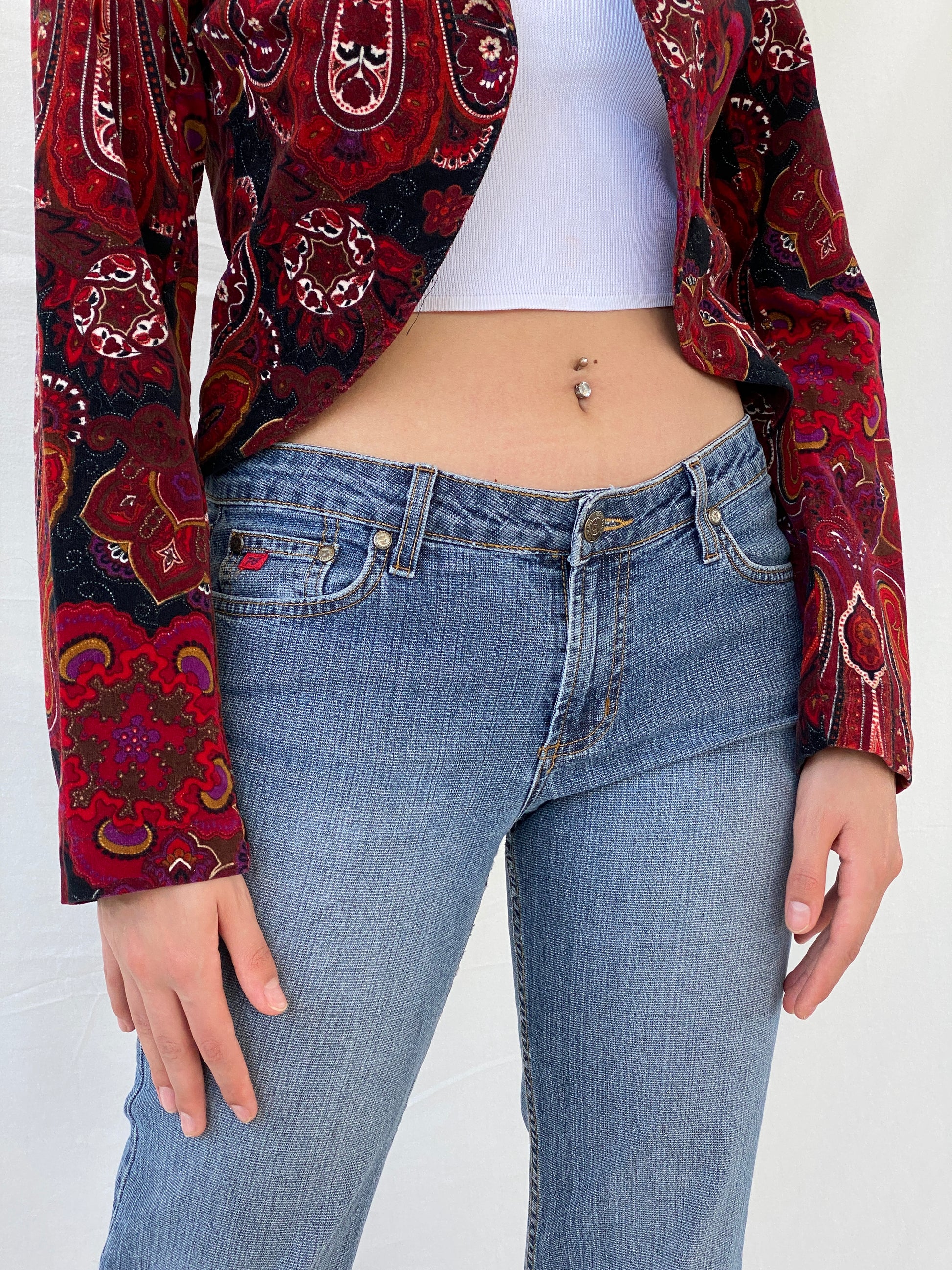 تألقي بإطلالة راقية مع بليزر "فينتدج ستيبس" الأحمر بنقشة بيزلي النسائية. يتميز هذا البليزر بنقشة بيزلي حمراء جريئة، مما يضفي عليه لمسة من الرقي. نسقيه مع بلوزة سوداء قصيرة وبنطال مطابق لإطلالة مكتب أنيقة.