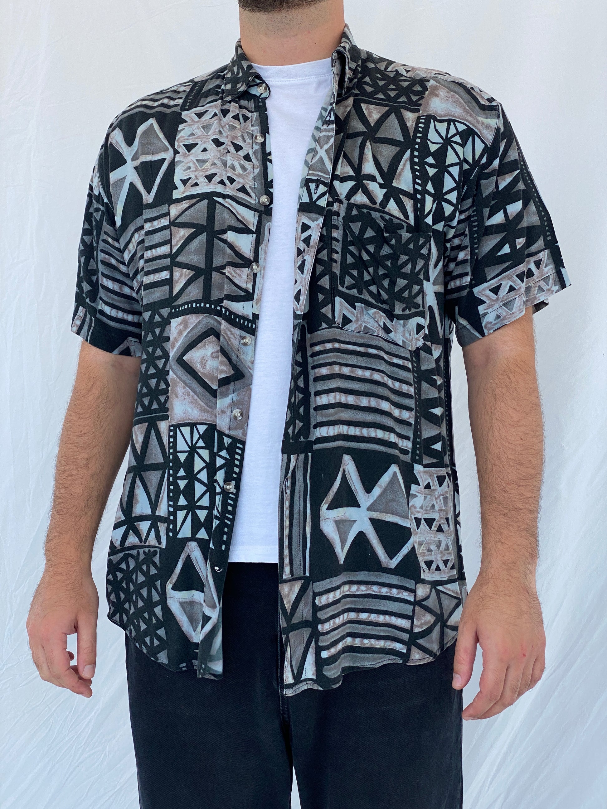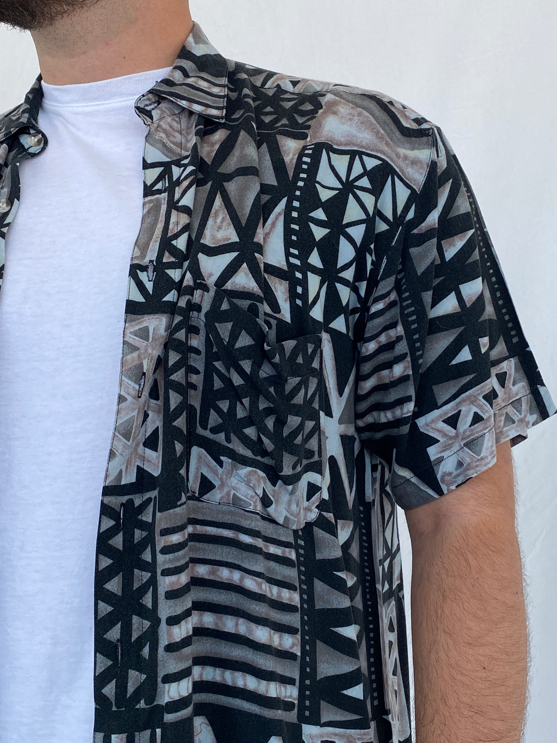 أطلق العنان لأسلوبك الكلاسيكي مع قميص توبي لي TL الهندسي باللونين الأسود والرمادي! مصنوع من قماش ناعم وجيد التهوية، يتميز هذا القميص قصير الأكمام بطبعة هندسية فريدة تجعله مثاليًا لأي مناسبة، من الإطلالات اليومية إلى المسائية.