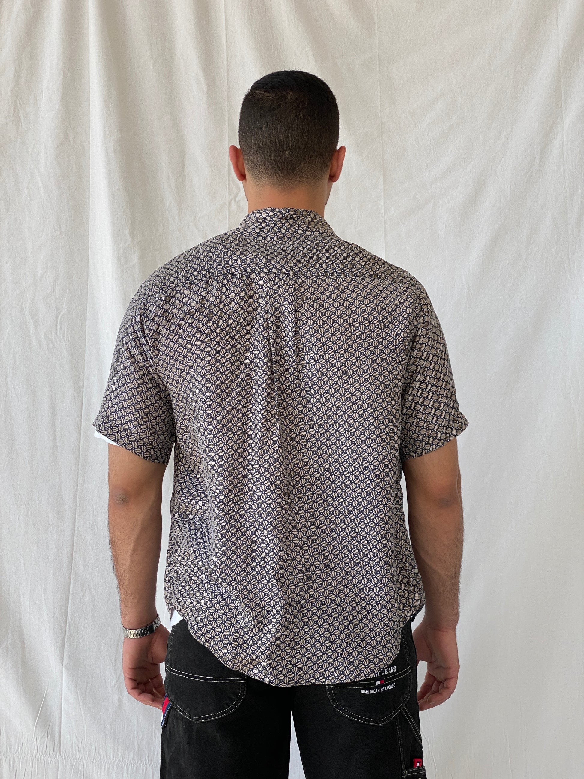 قميص حريري رجالي بأكمام قصيرة من Vintage SILK UOMO من NAK باللون البيج والأزرق الداكن - مقاس صغير