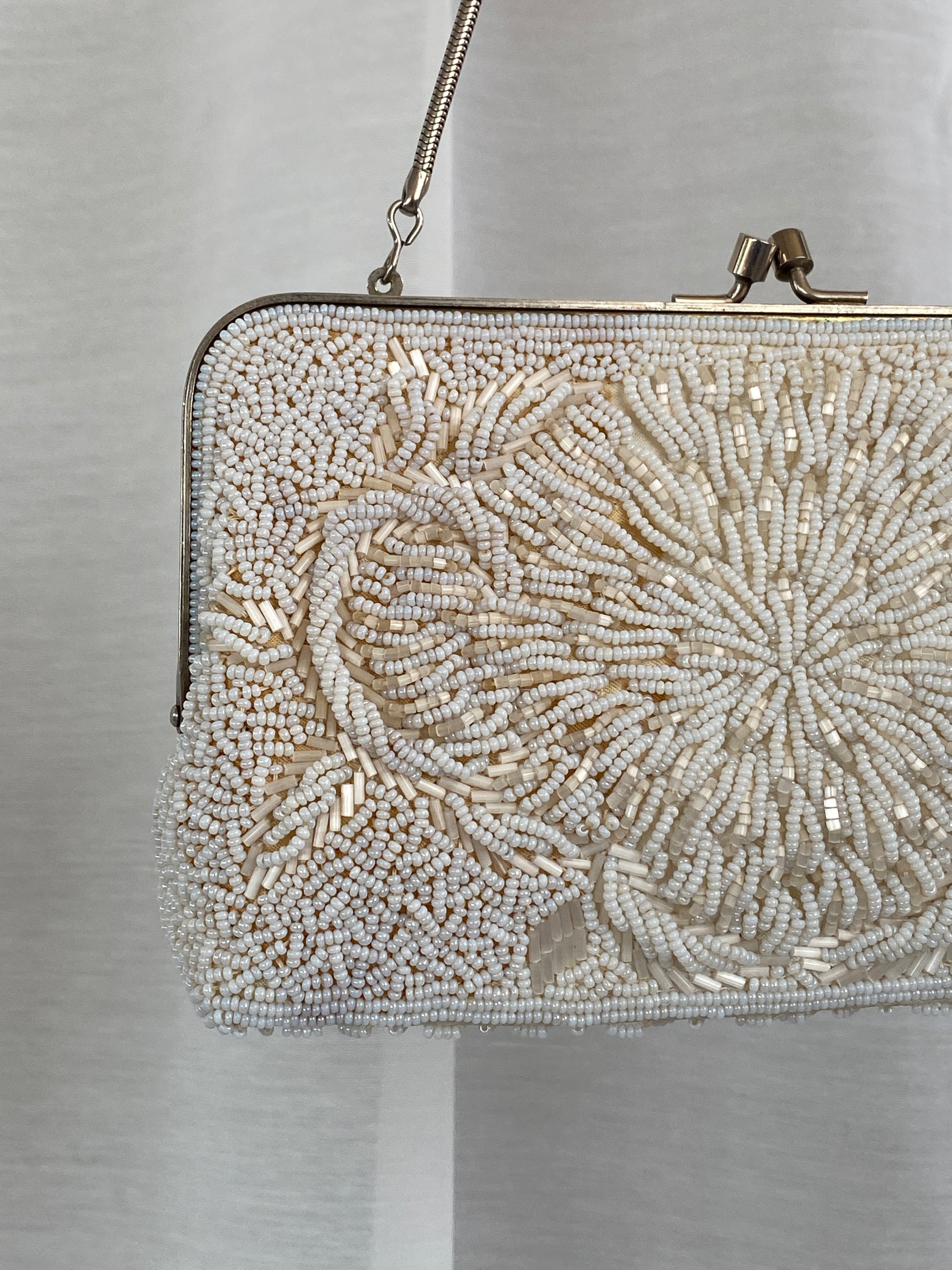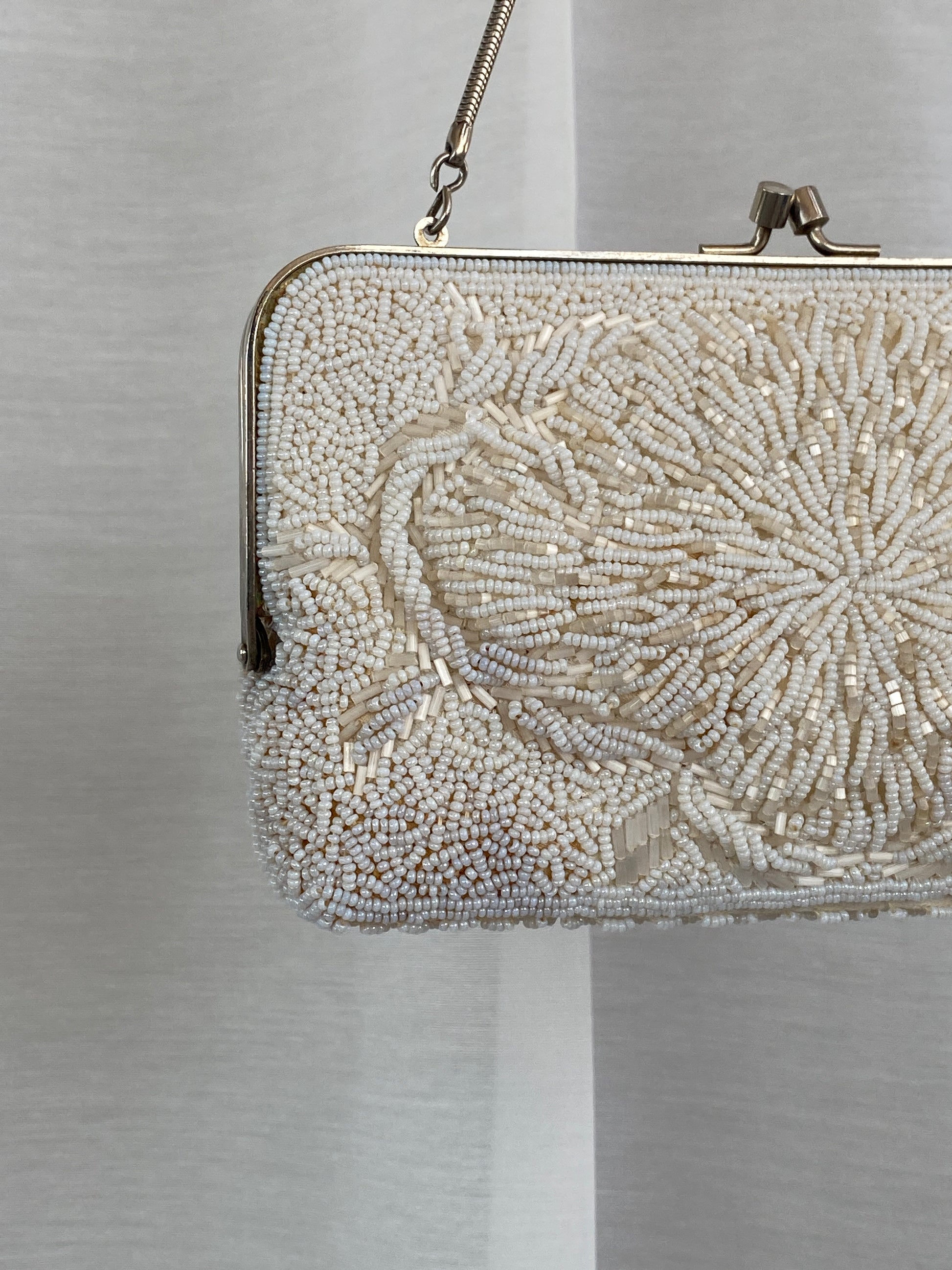 حقيبة سهرة عتيقة بيضاء مرصعة بالخرز