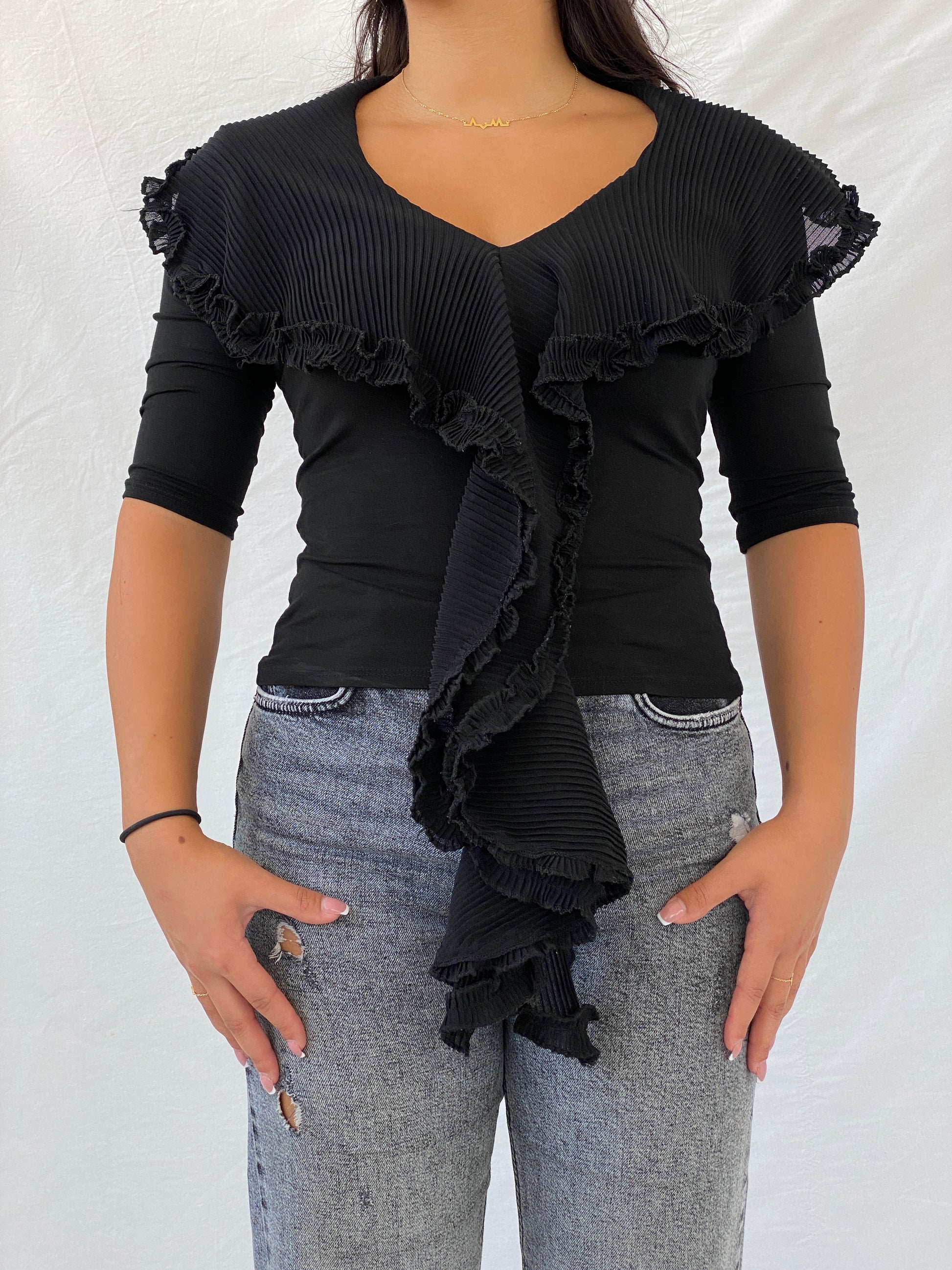 بلوزة سوداء بياقة مكشكشة وطبعة طائر أبيض عتيق - مقاس M