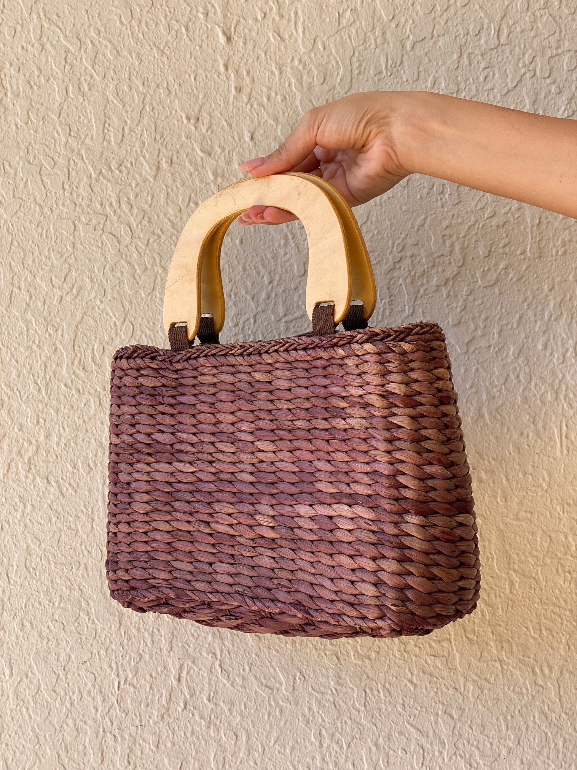 حقيبة يد من القش بتصميم بوهيمي عتيق من الخرز الأبيض بمقبض خشبي بني من Y2K، باللون الفيروزي البني