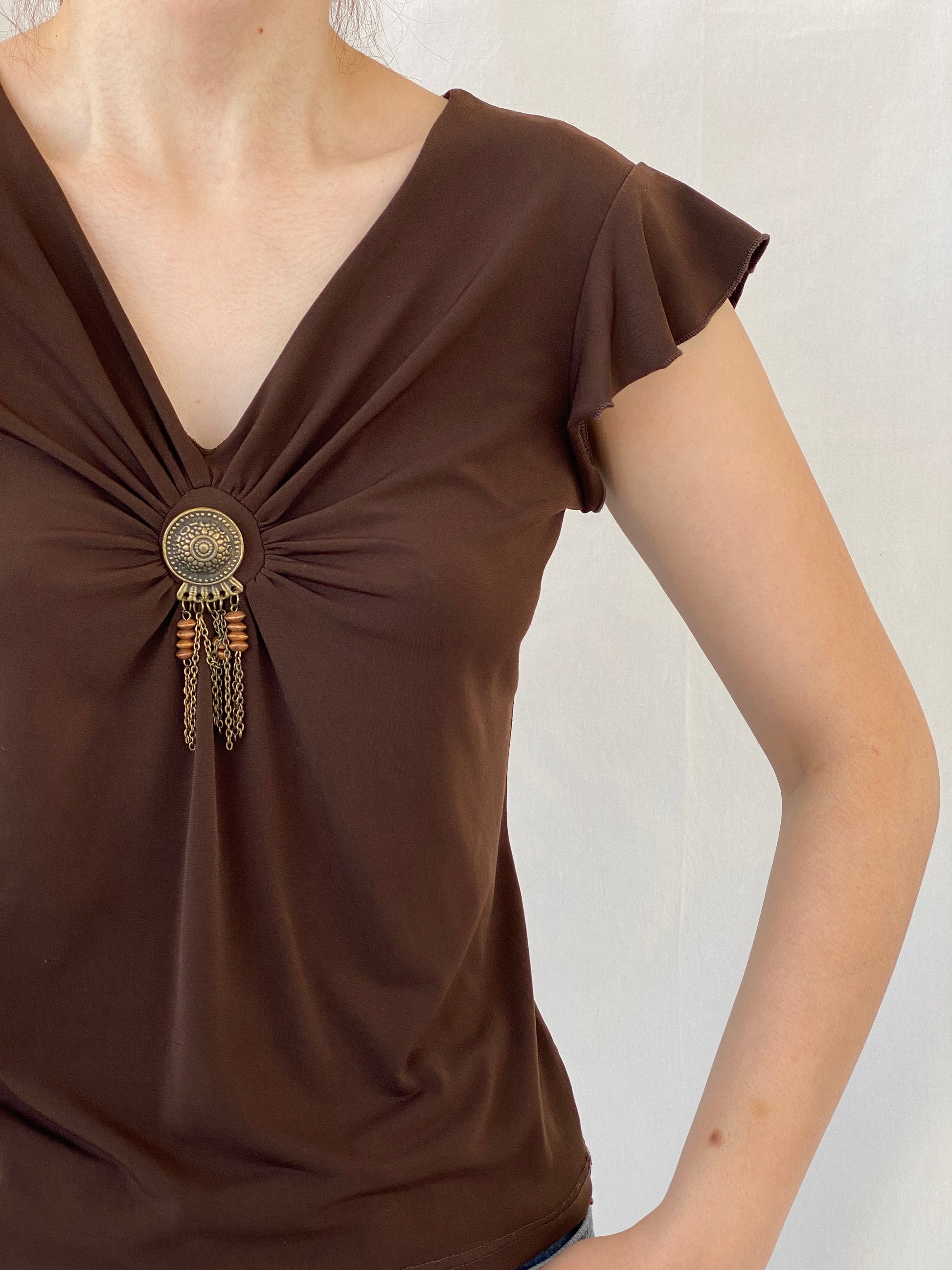 بلوزة نسائية كلاسيكية Y2K Versailles بنية اللون بأكمام نصفية ورقبة على شكل حرف V - مقاس صغير