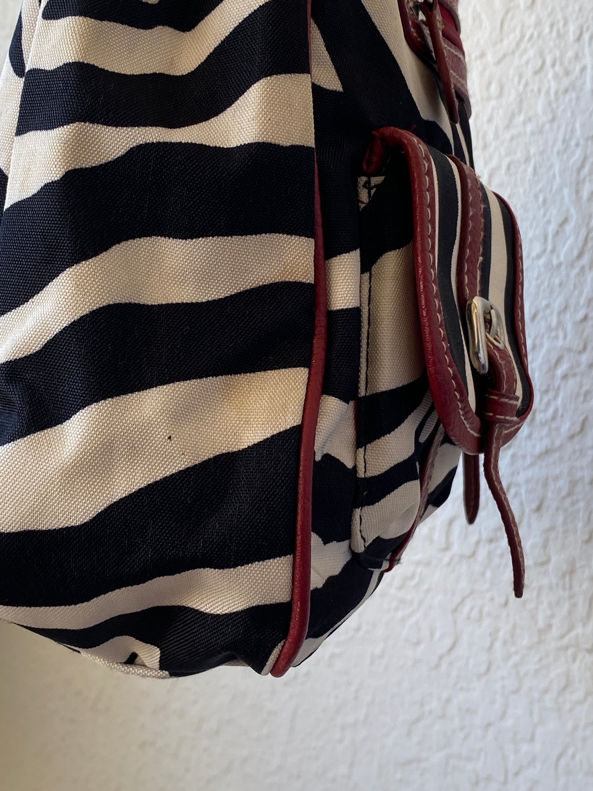 حقيبة كتف كلاسيكية من القماش بطبعة حمار وحشي باللونين الأسود والأبيض مع محفظة من الجلد الصناعي بتفاصيل حمراء