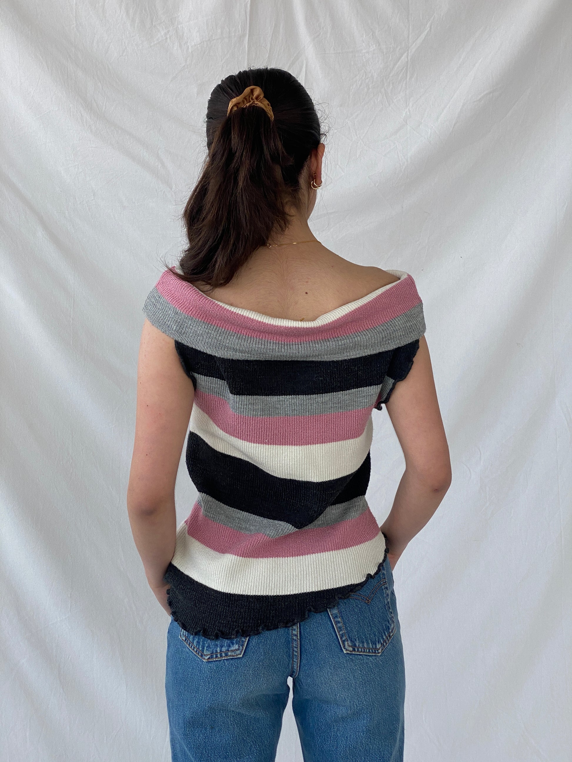 بلوزة وردية مخططة غير متماثلة مكشوفة الكتفين من Y2K - مقاس متوسط