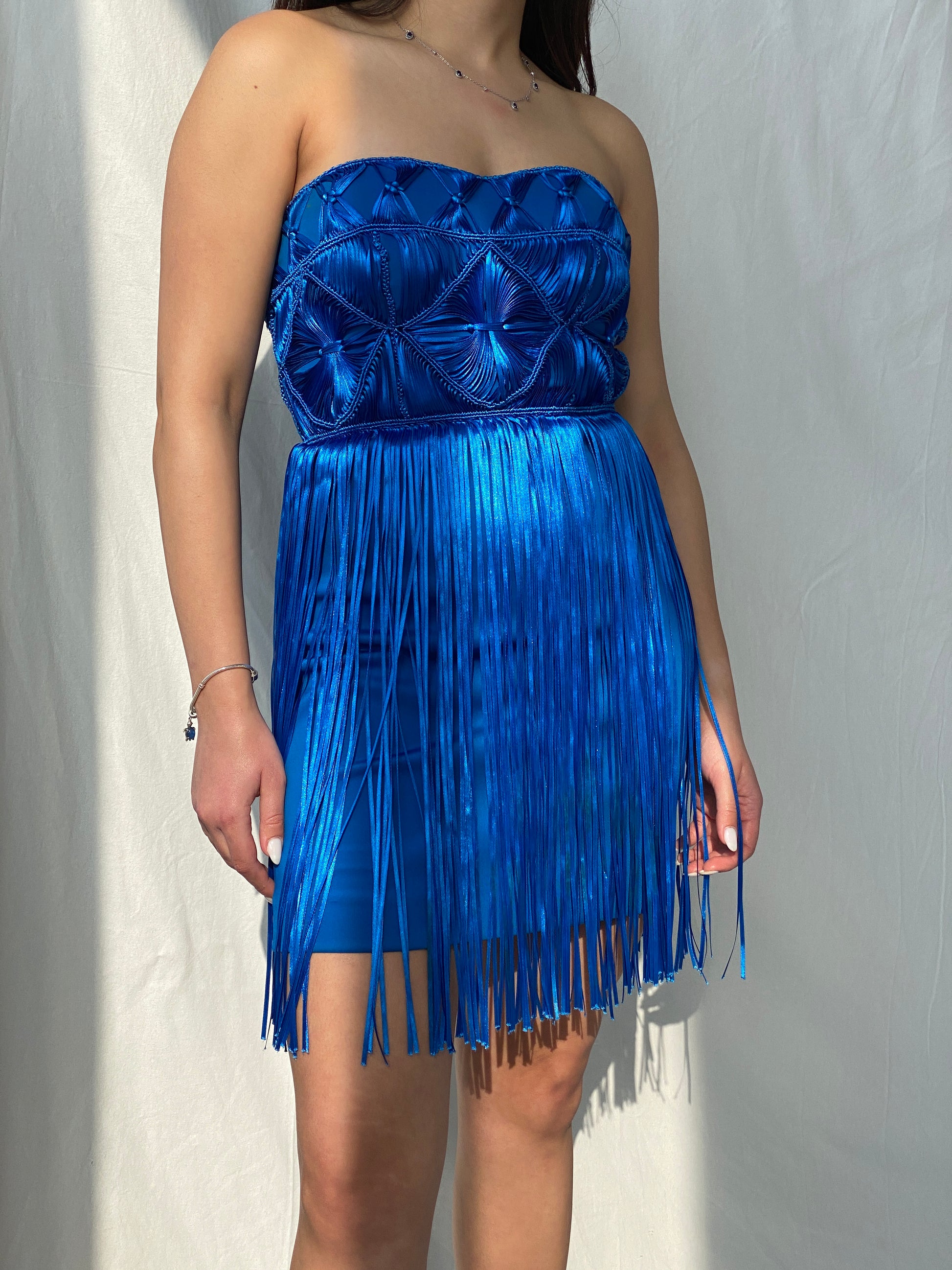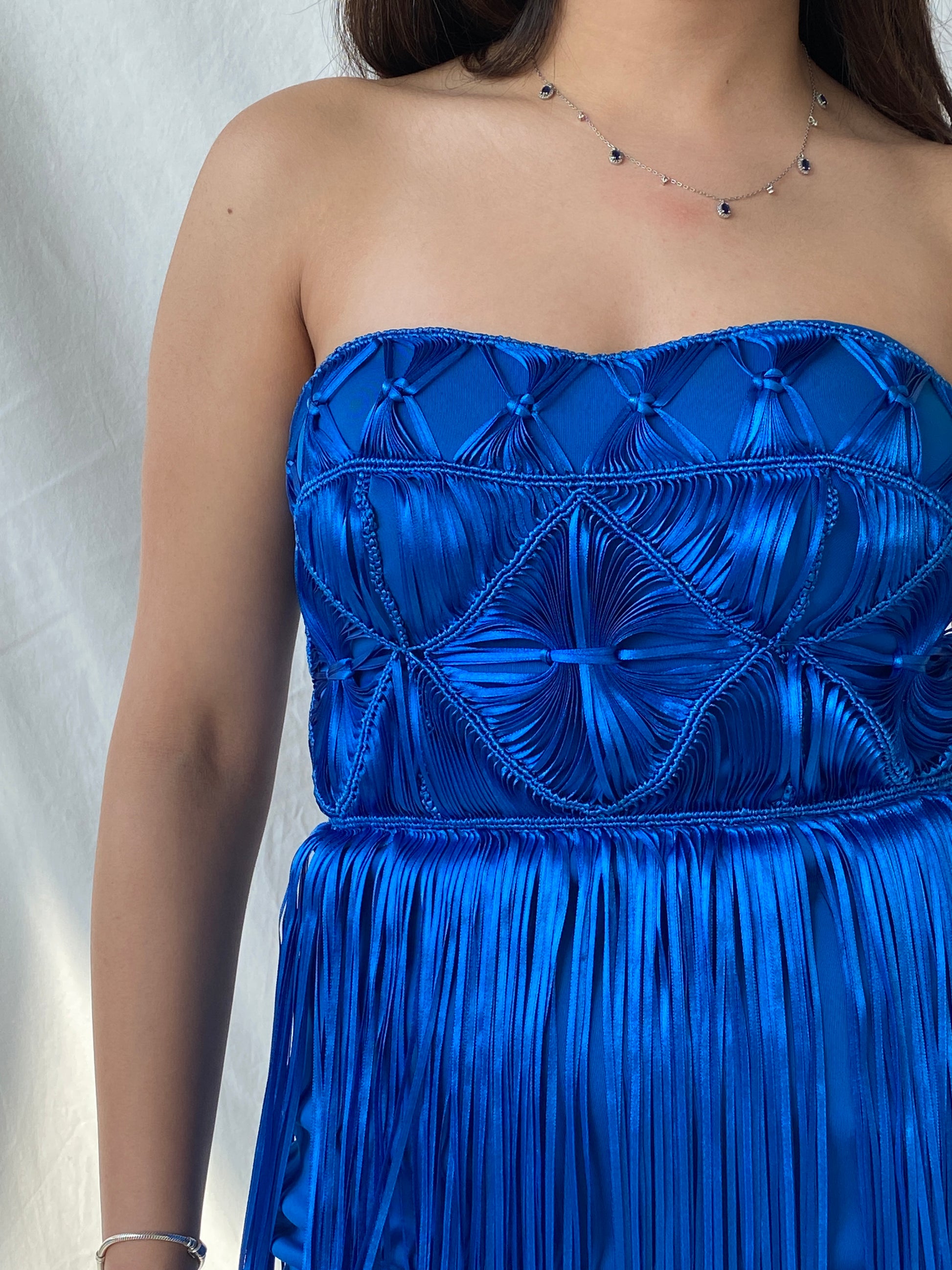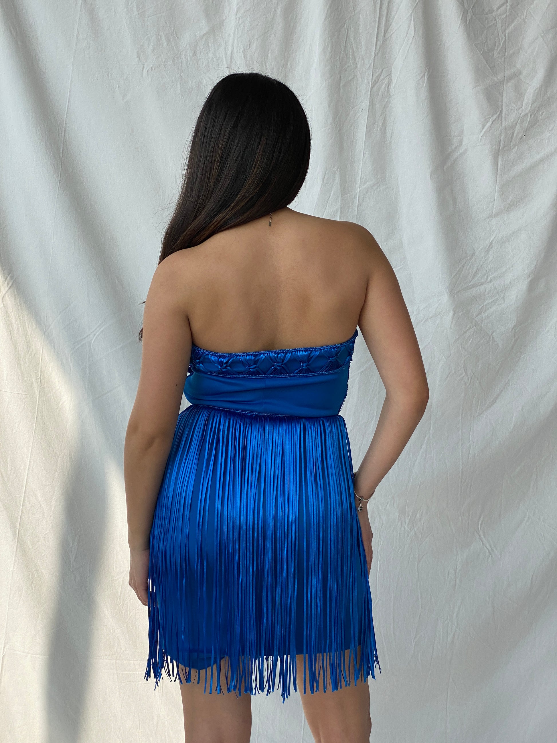 فستان بيبي Y2K للحفلات بدون حمالات وبهدب أزرق ملكي - مقاس XS
